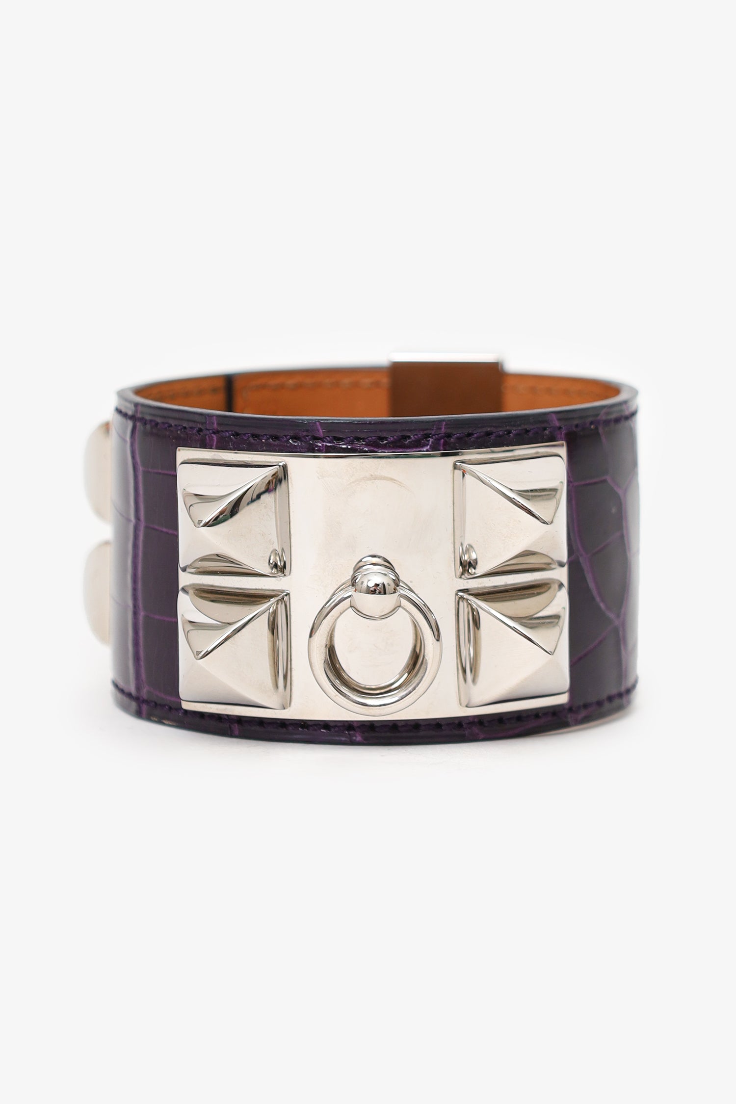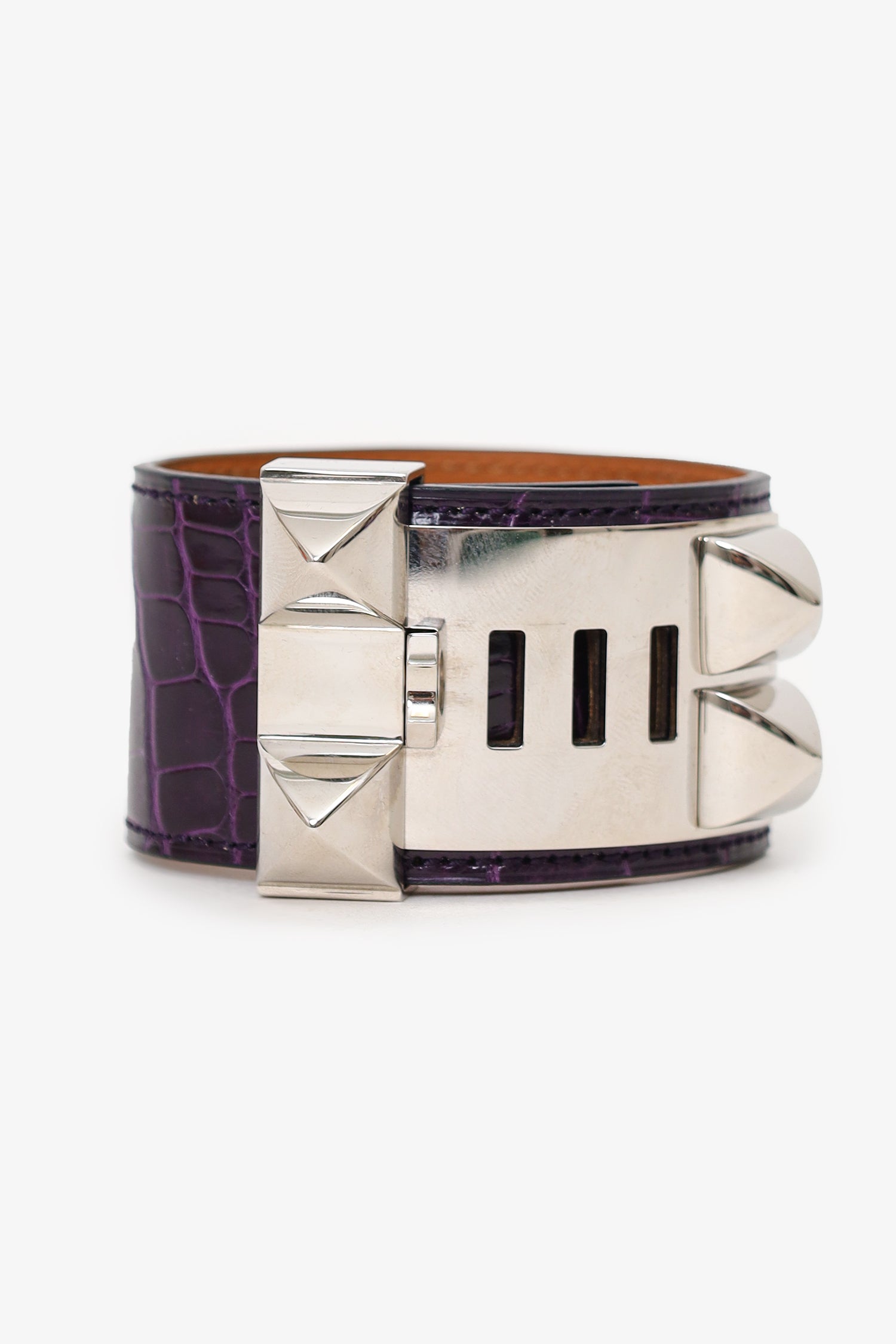 Refresh availabilityHermès 2009 Purple Alligator Leather Collier de Chien Bracelet. Slide-lock closure. Silver-tone hardware. Tonal stitching.