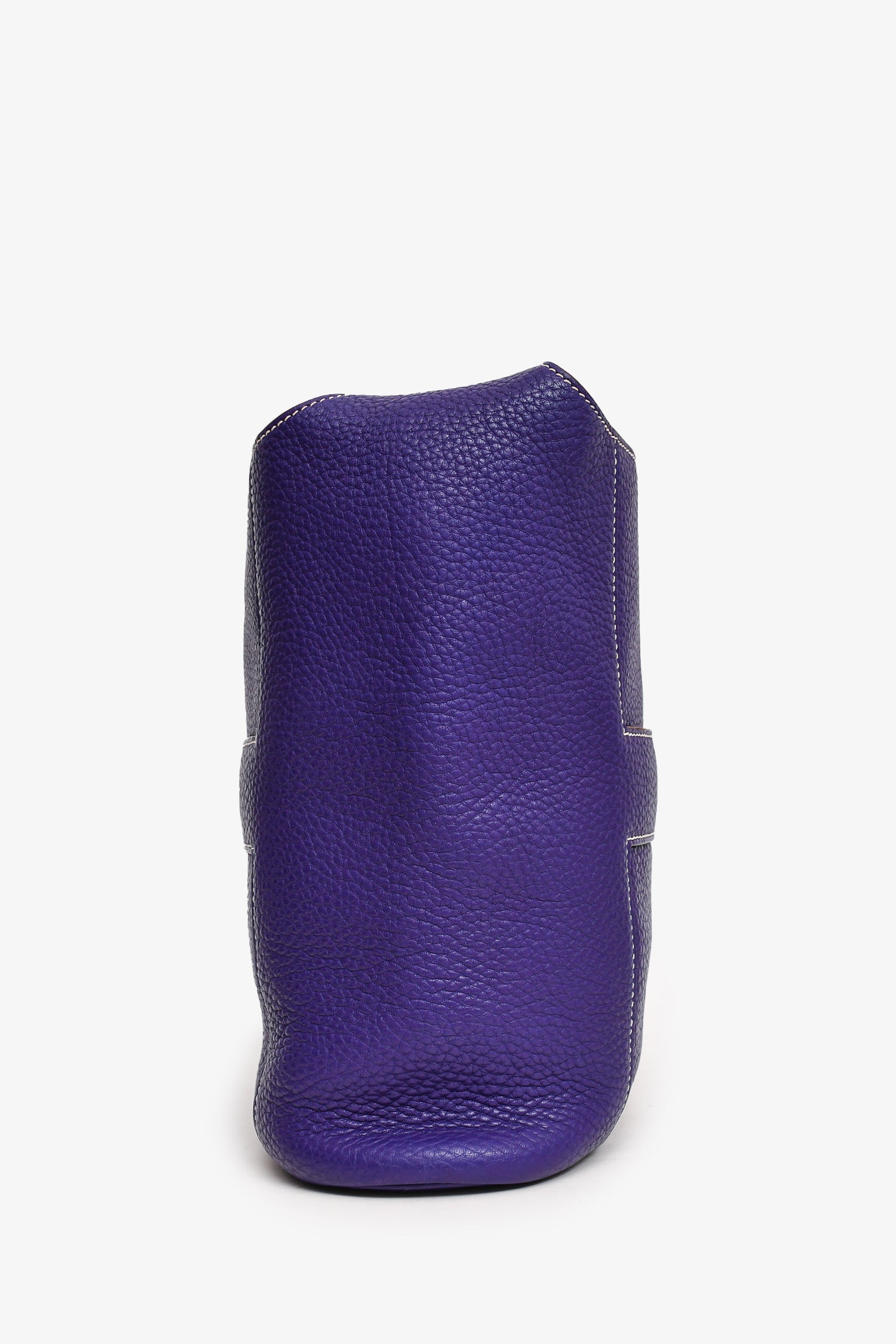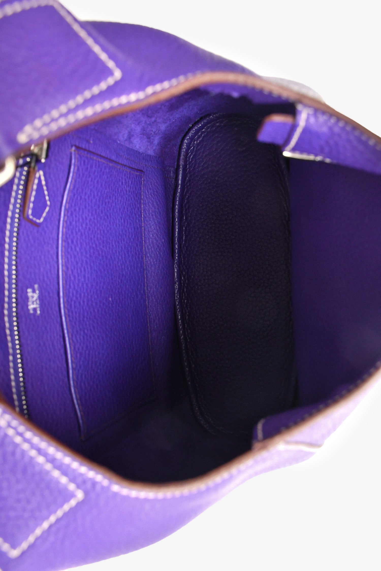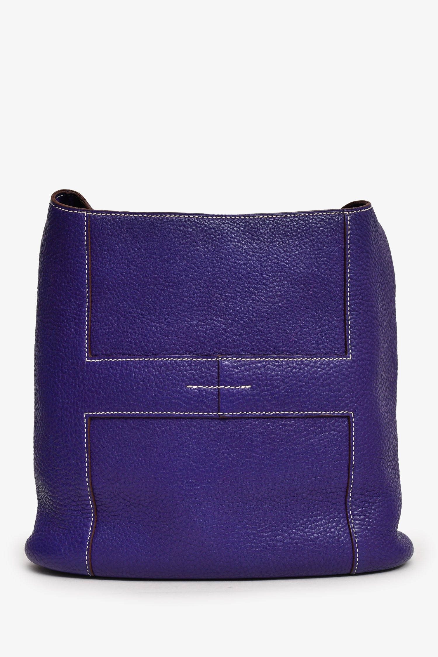 Hermès 2010 Purple Clemence Leather Good News Crossbody Bag. Webbed adjustable shoulder strap. Silver-tone hardware. Leather trimming. Single slip interior pocket. Contrast stitching.