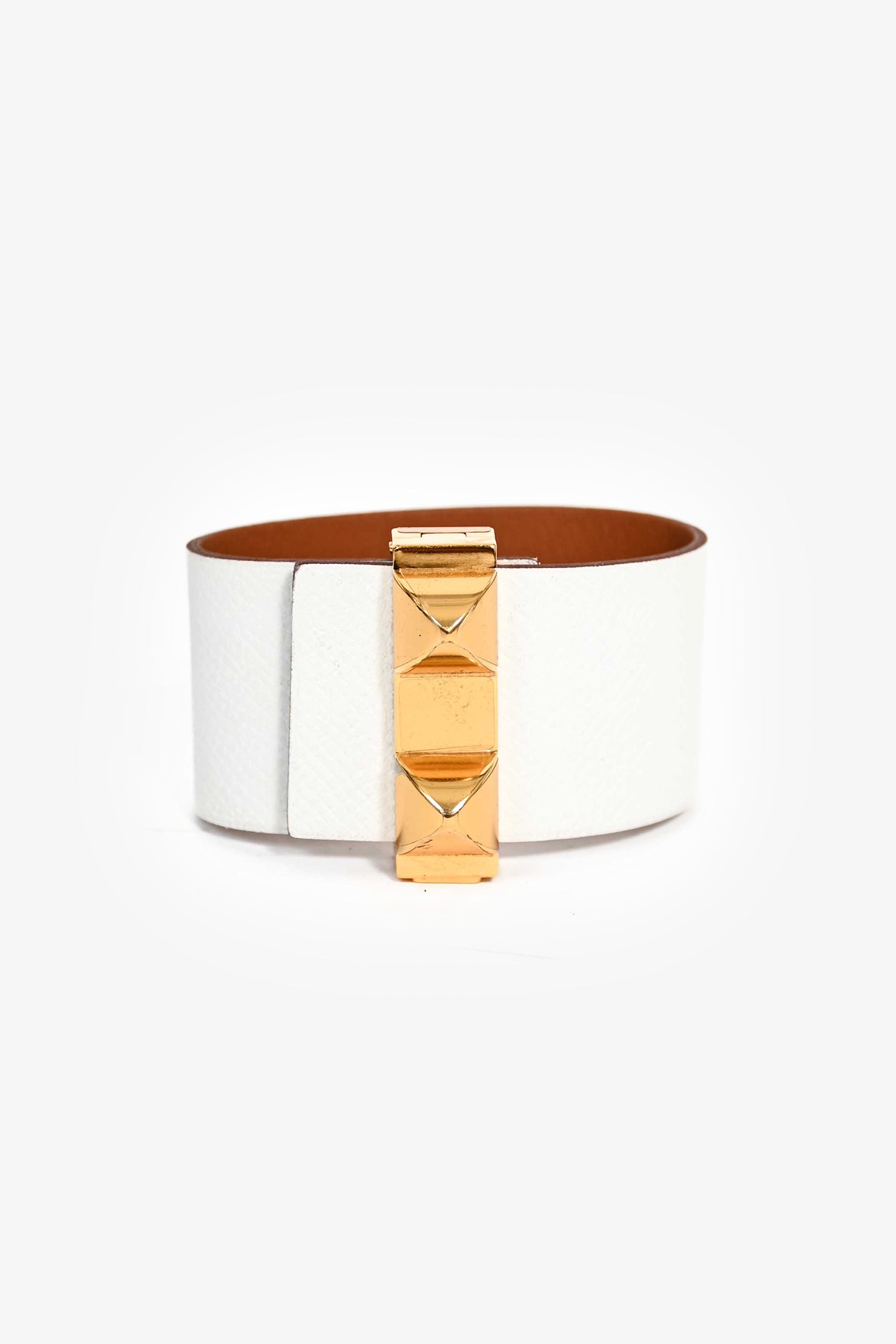 Refresh availabilityHermès 2012 White/Brown Reversible Leather Imprevisible Bracelet PM. Fold-over click closure. Gold-tone hardware. Tonal stitching.
