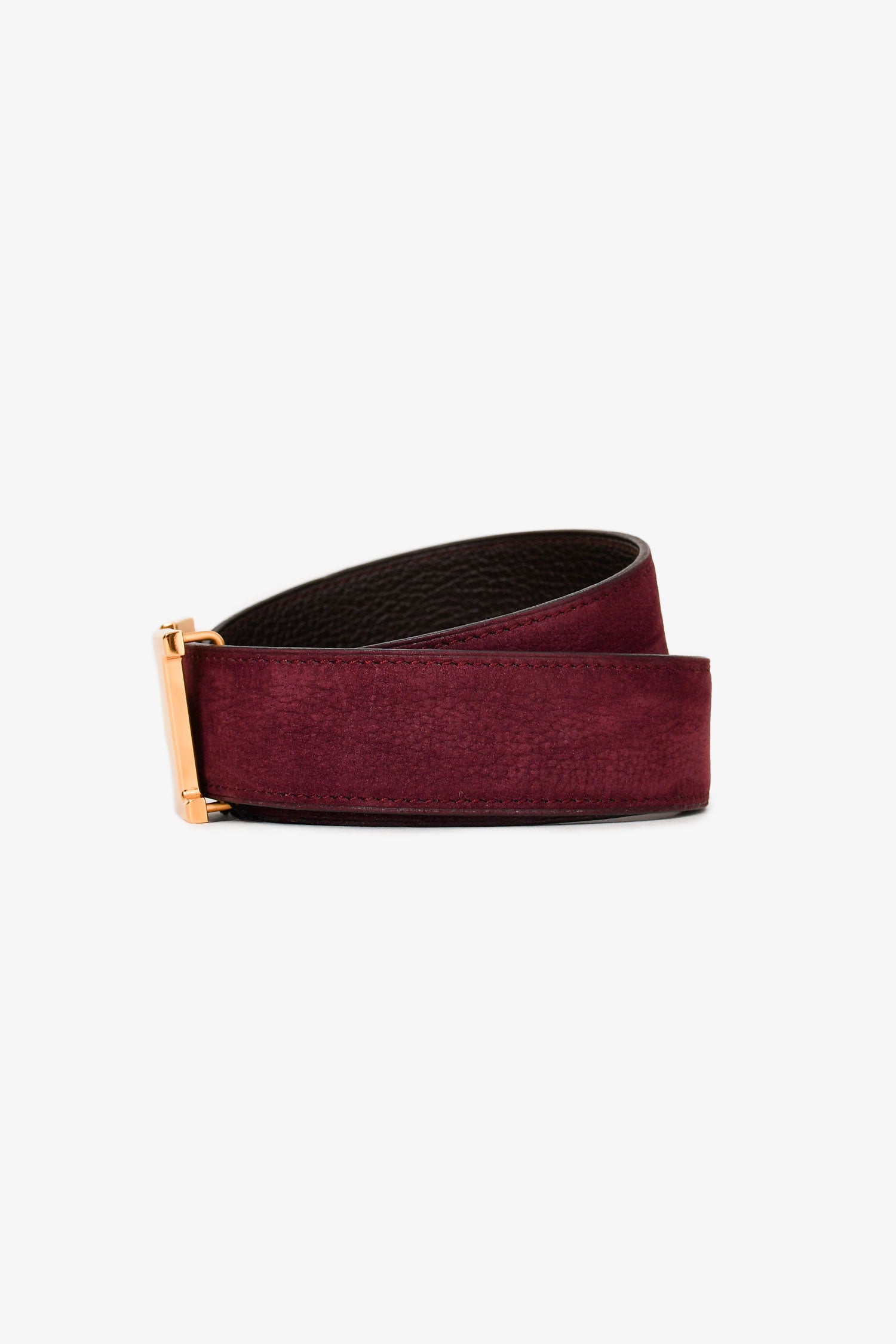 Refresh availabilityHermès 2012 Purple/Brown Leather Reversible H Belt. Gold-tone 'H' slide through buckle. Suede/grained leather belt. Coated trimming. Tonal stitching.