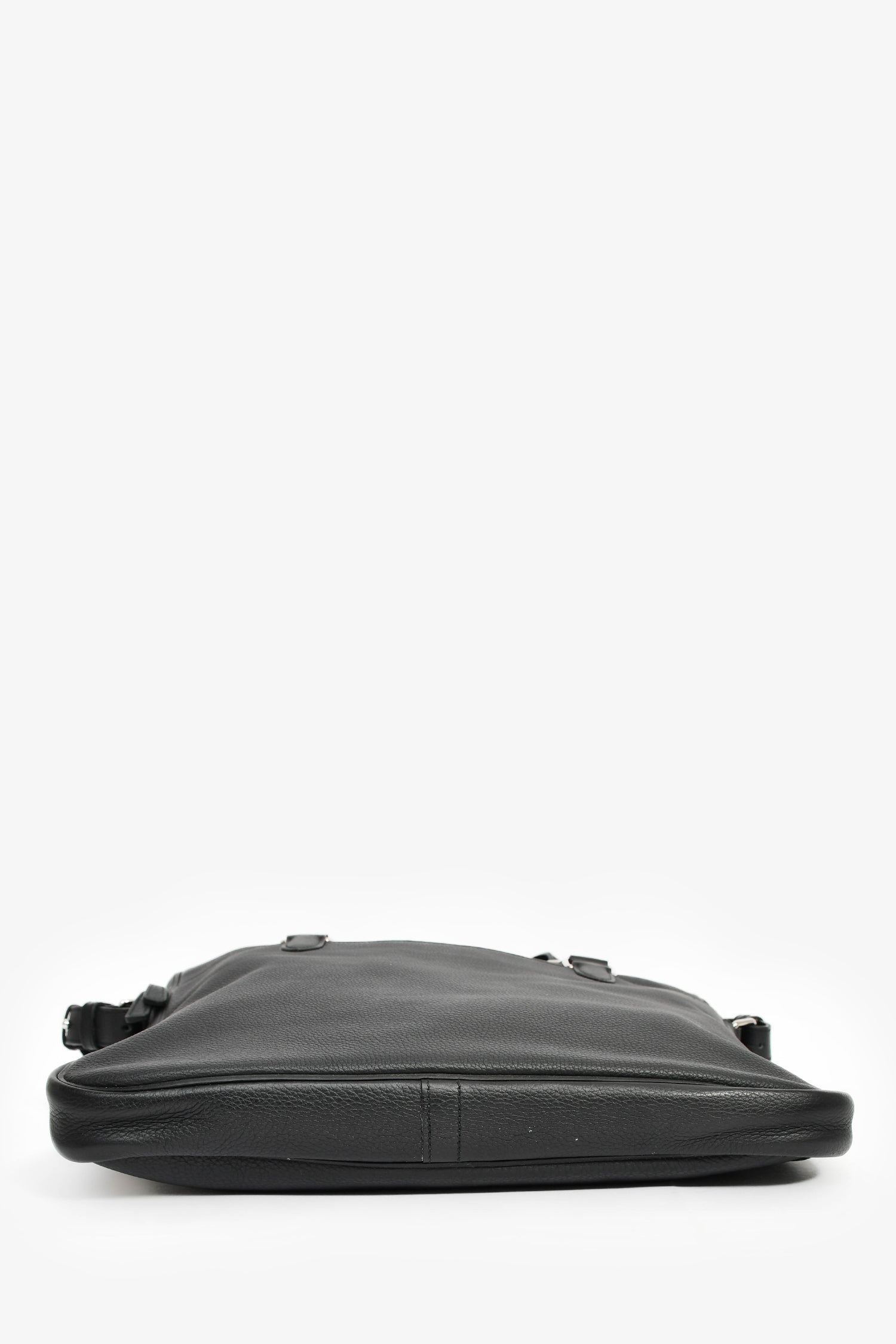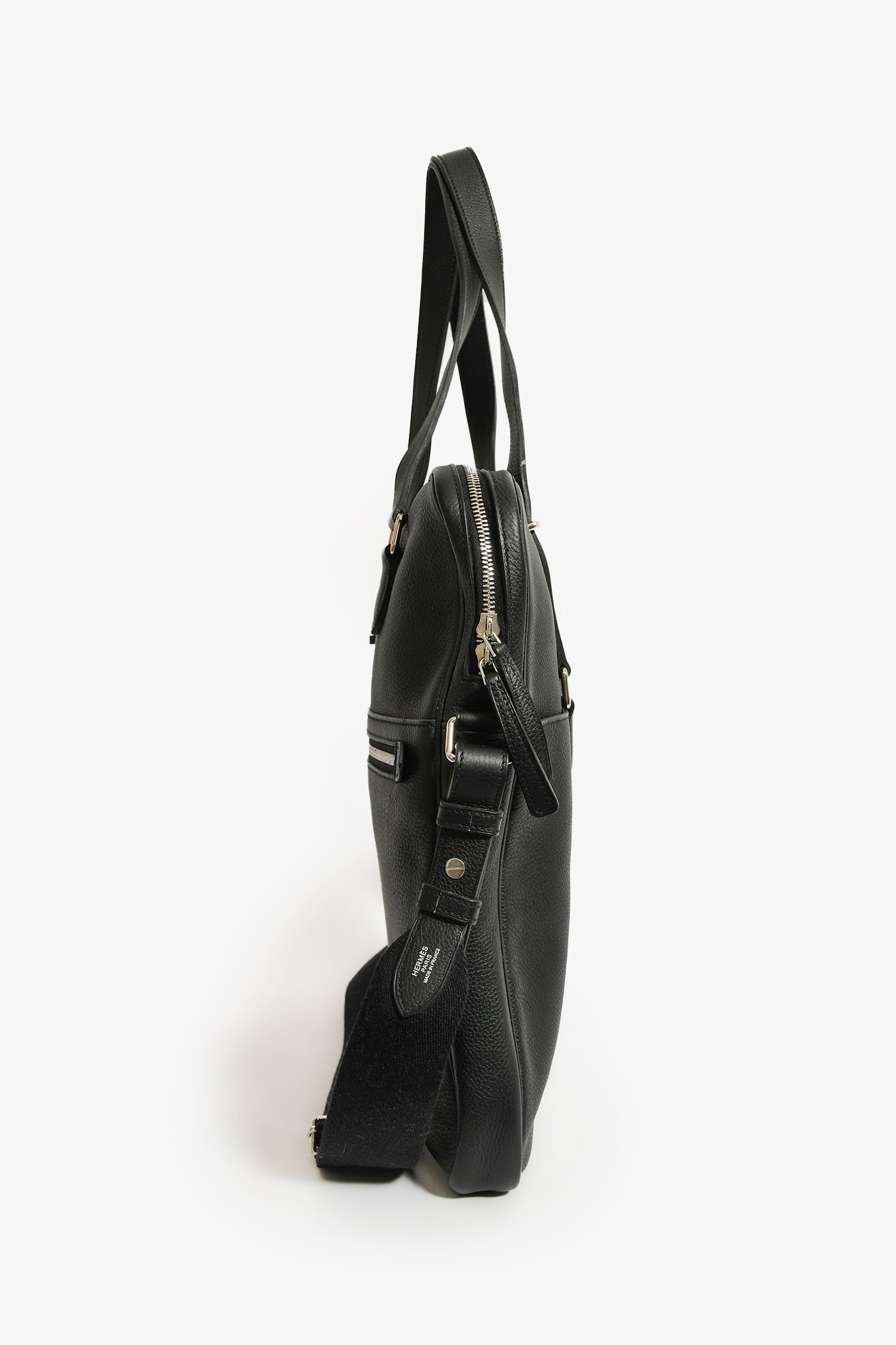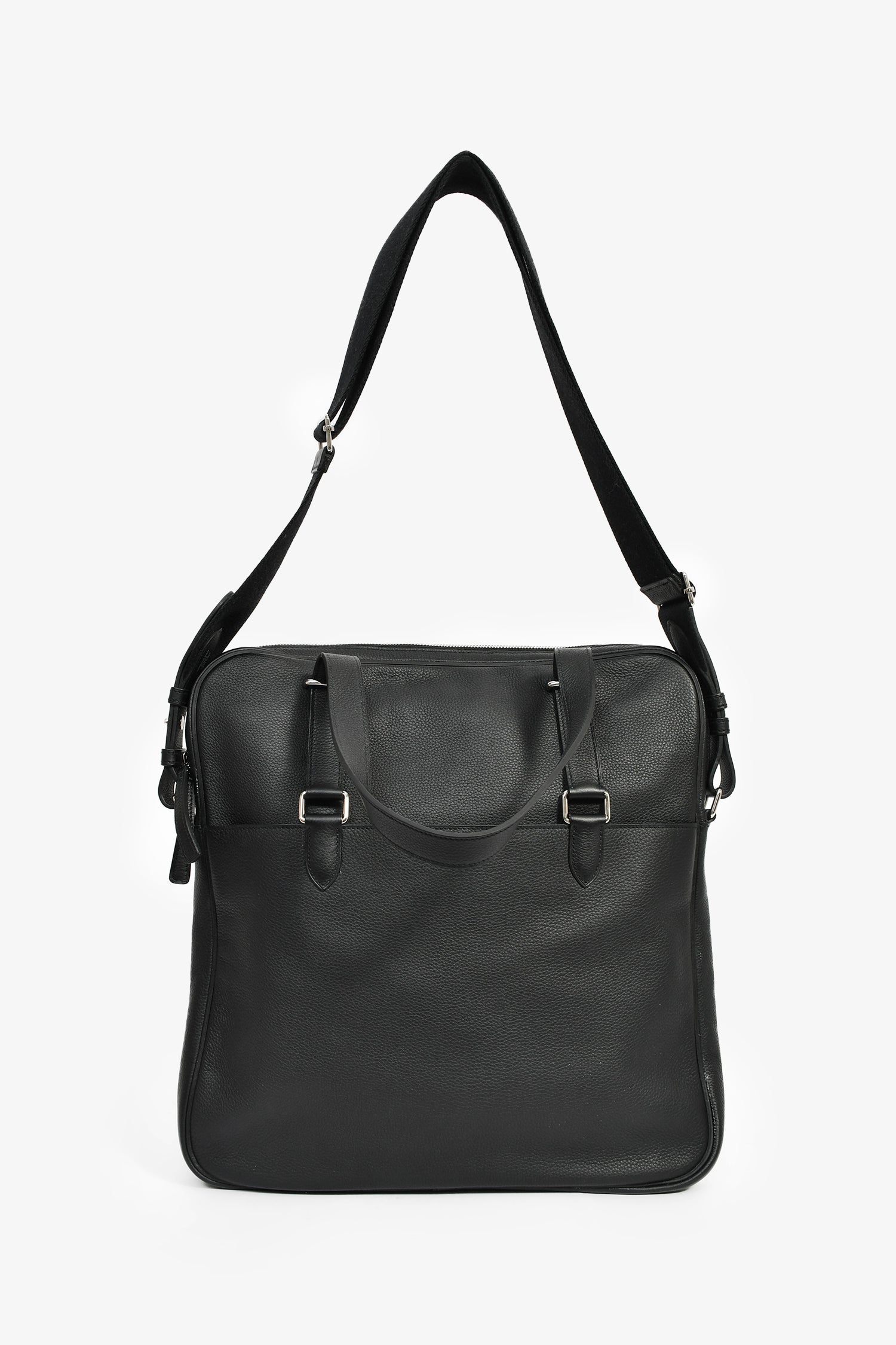 Refresh availabilityHermes 2014 Black Evergrain Leather 'Hebdo' Messenger Bag. Dual top handles. Top zip closure. 2 exterior compartments; 1 front slip and 1 back zip. Single interior compartment with 1 wall zip pocket. Adjustable web strap. Textile-lined interior. Palladium tone hardware. Tonal stitching.