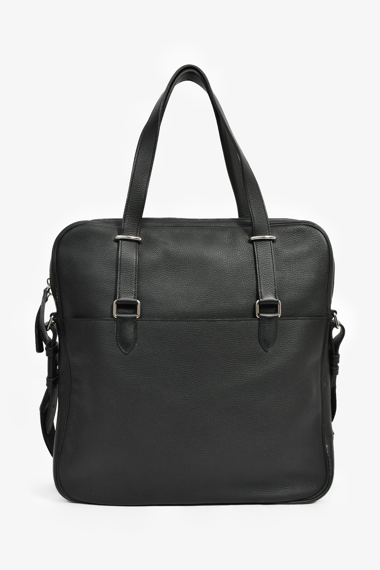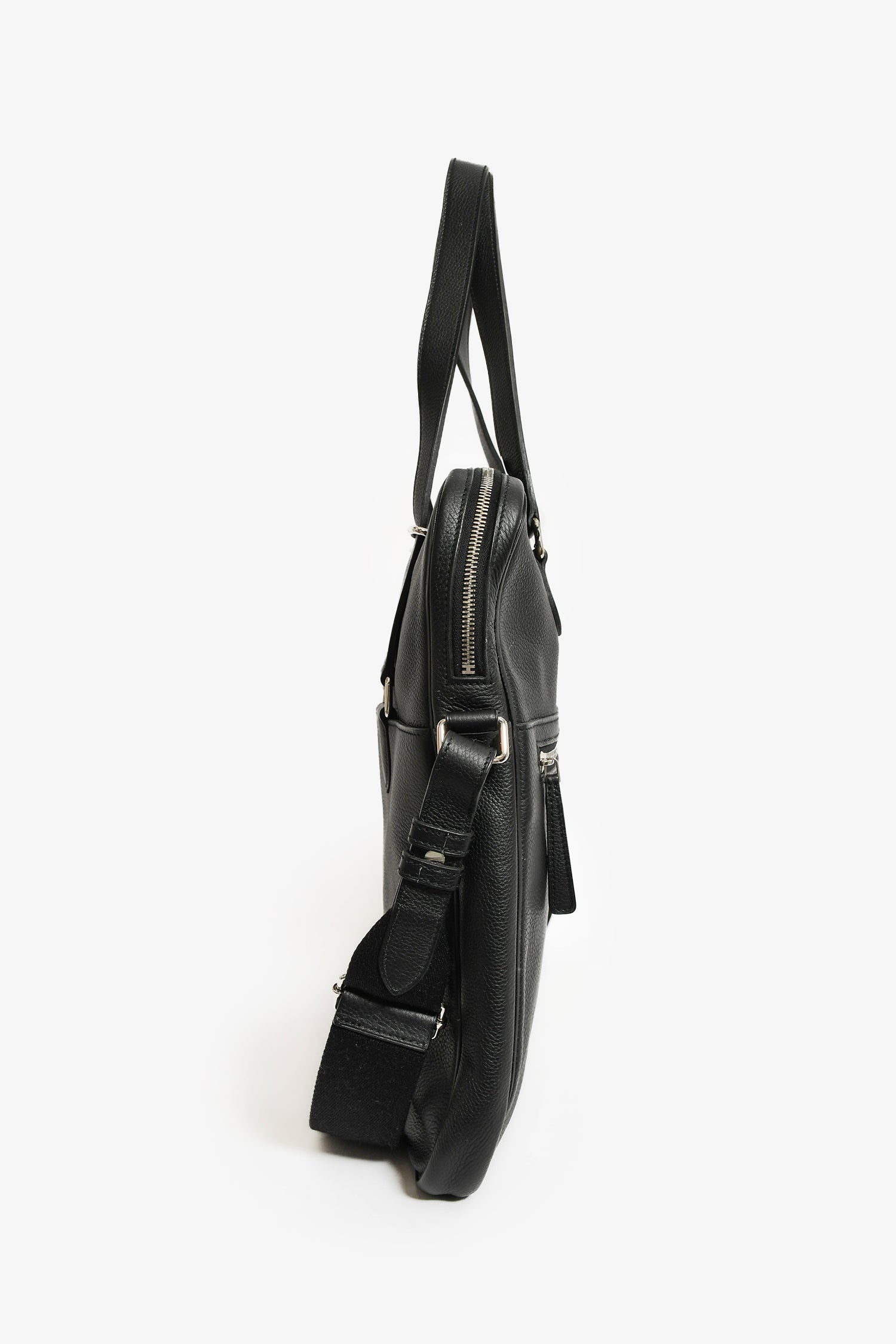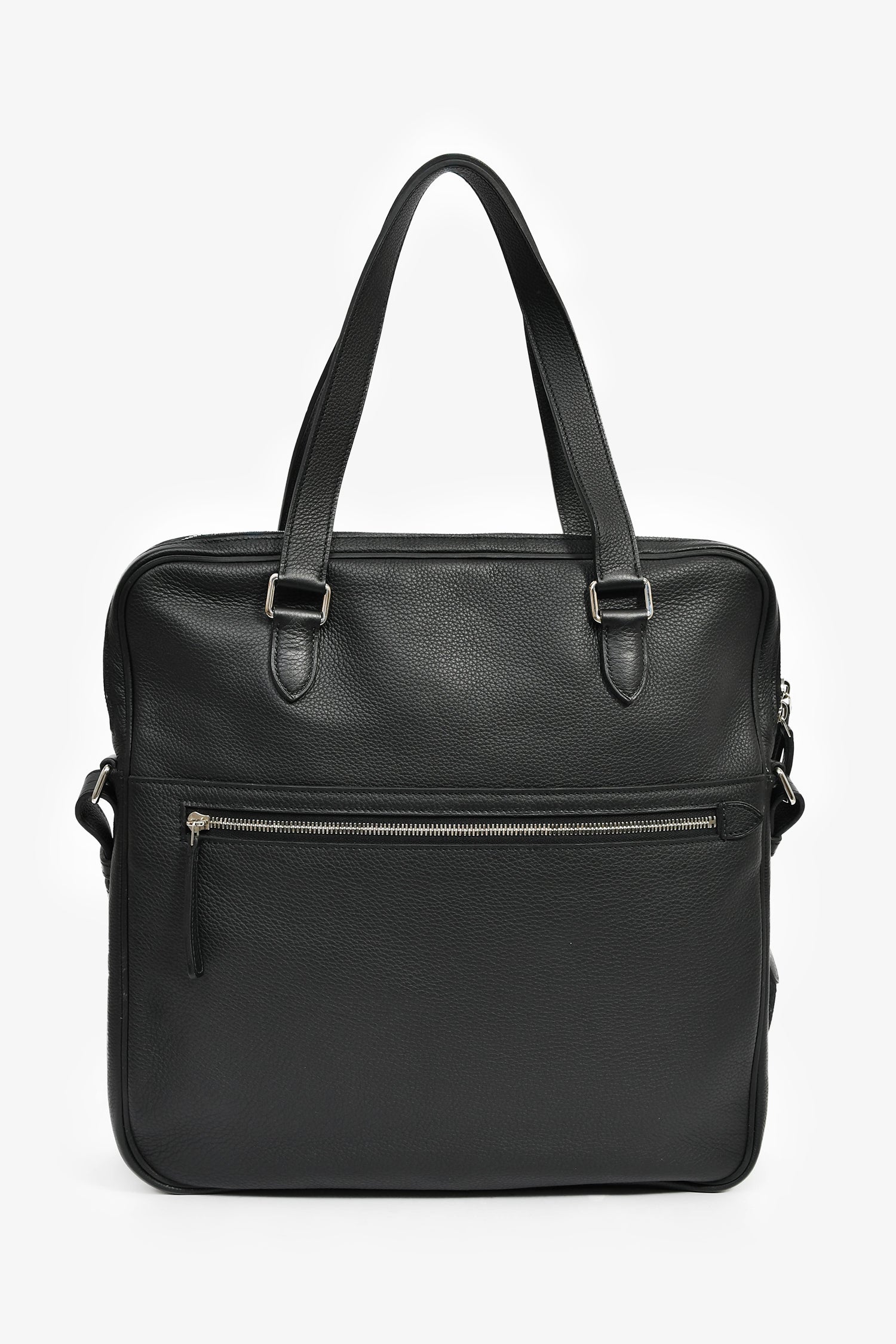 Refresh availabilityHermes 2014 Black Evergrain Leather 'Hebdo' Messenger Bag. Dual top handles. Top zip closure. 2 exterior compartments; 1 front slip and 1 back zip. Single interior compartment with 1 wall zip pocket. Adjustable web strap. Textile-lined interior. Palladium tone hardware. Tonal stitching.