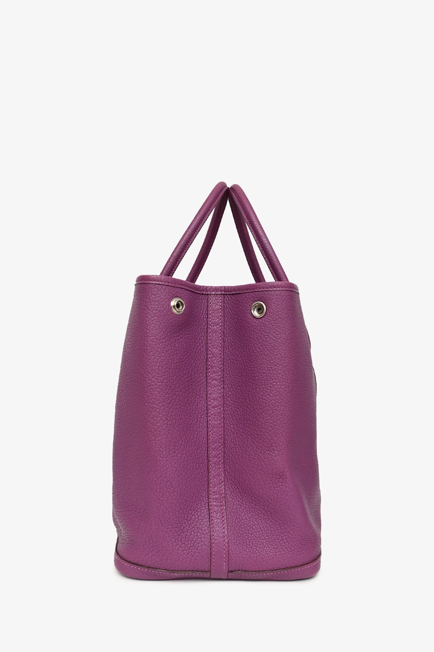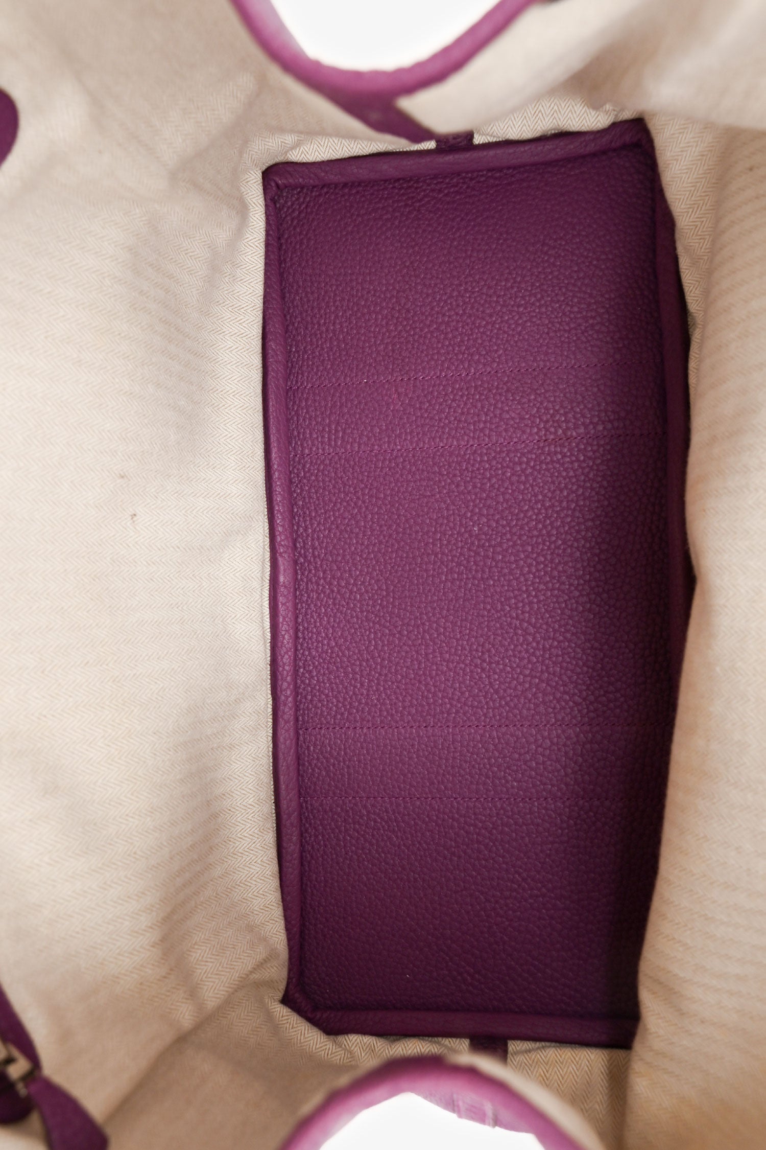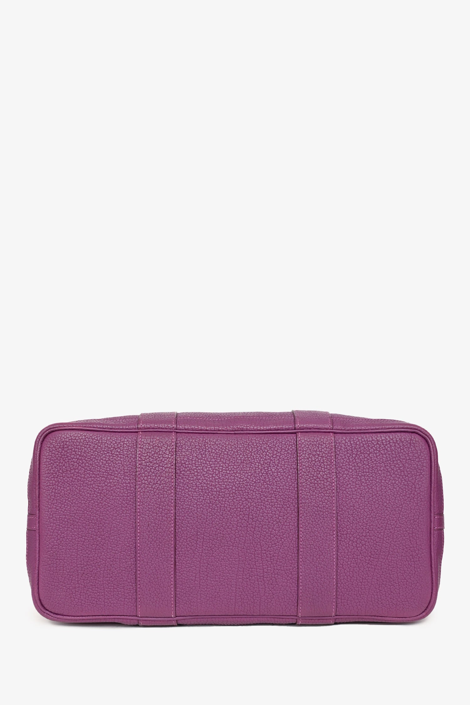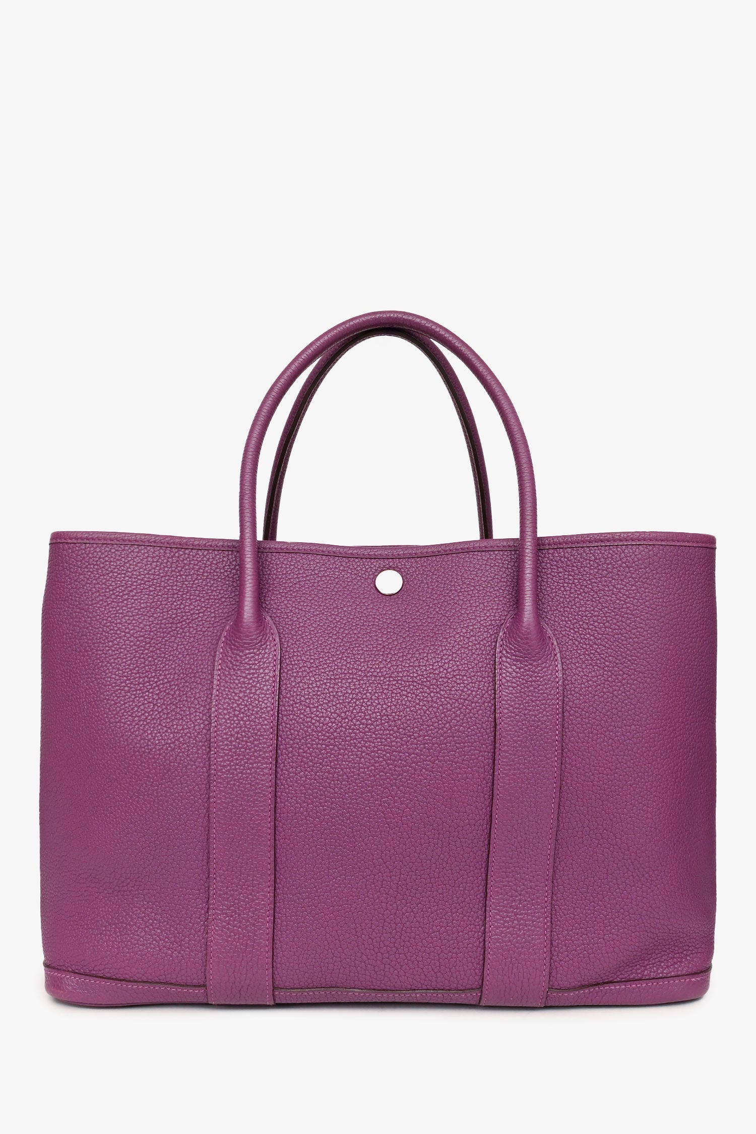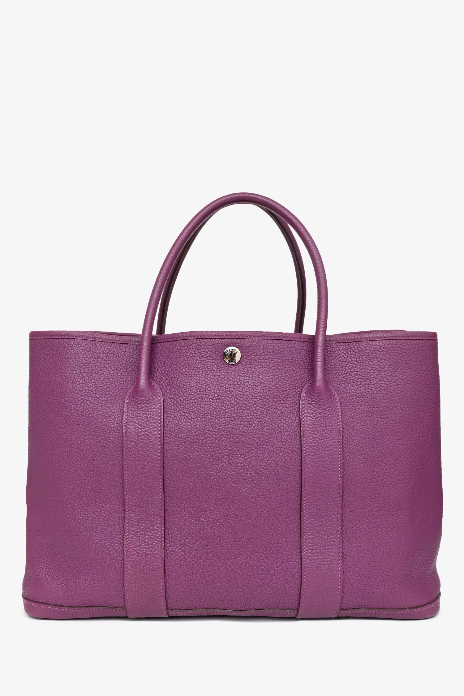 Refresh availabilityHermès 2014 Purple Clemence Leather Garden Party 36. Snap closure at top and expandable sides. Dual rolled leather handles. Palladium hardware. Lined interior with wall zip pocket. Tonal stitching.