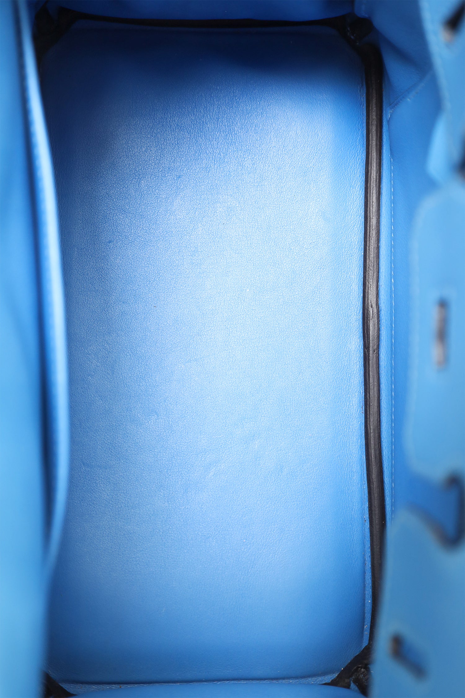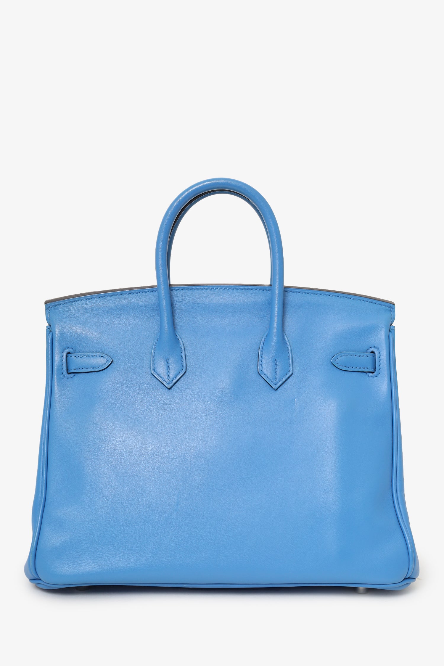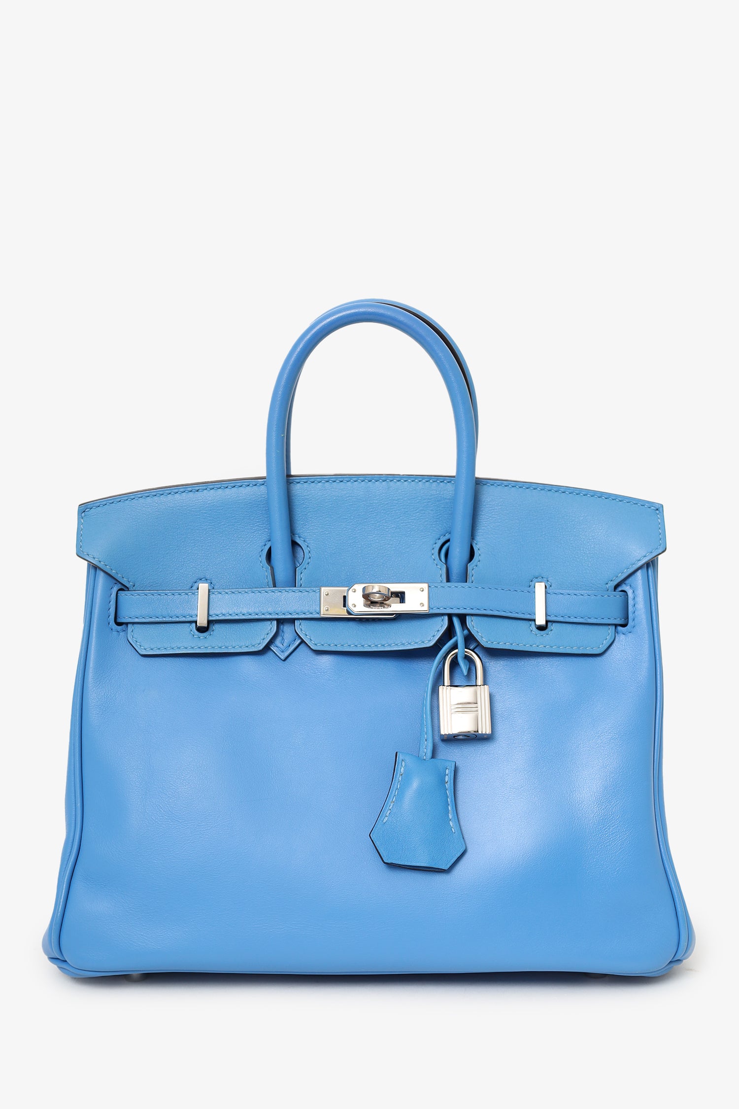 Refresh availabilityHermès 2015 Blue Swift Leather Birkin 25. Front fold-over flap and side straps with turn-lock closure. Twin top handles. Protective studs on bottom. Interior zip and slip pocket. Includes clochette. Silver-tone hardware. Tonal stitching.