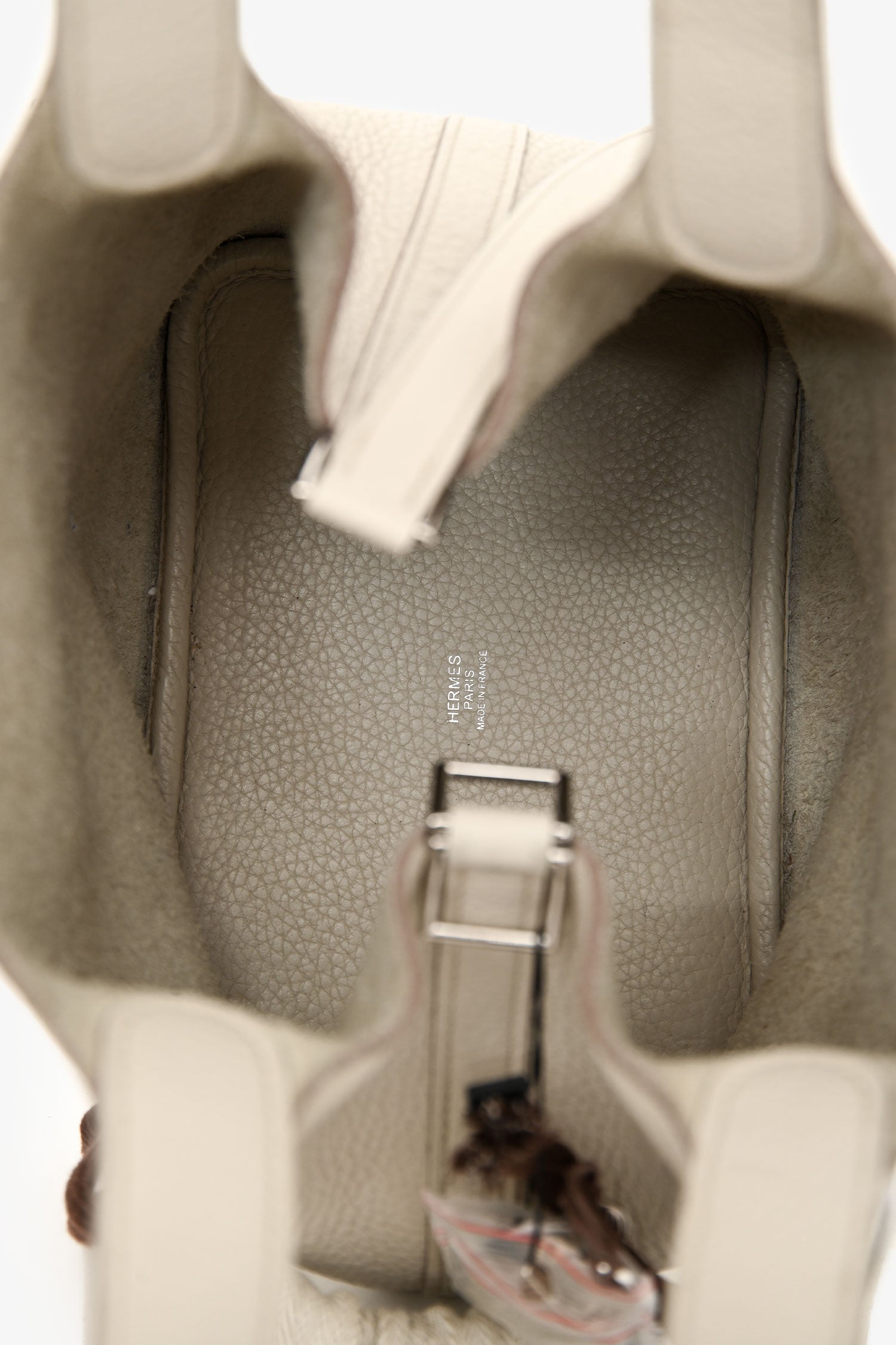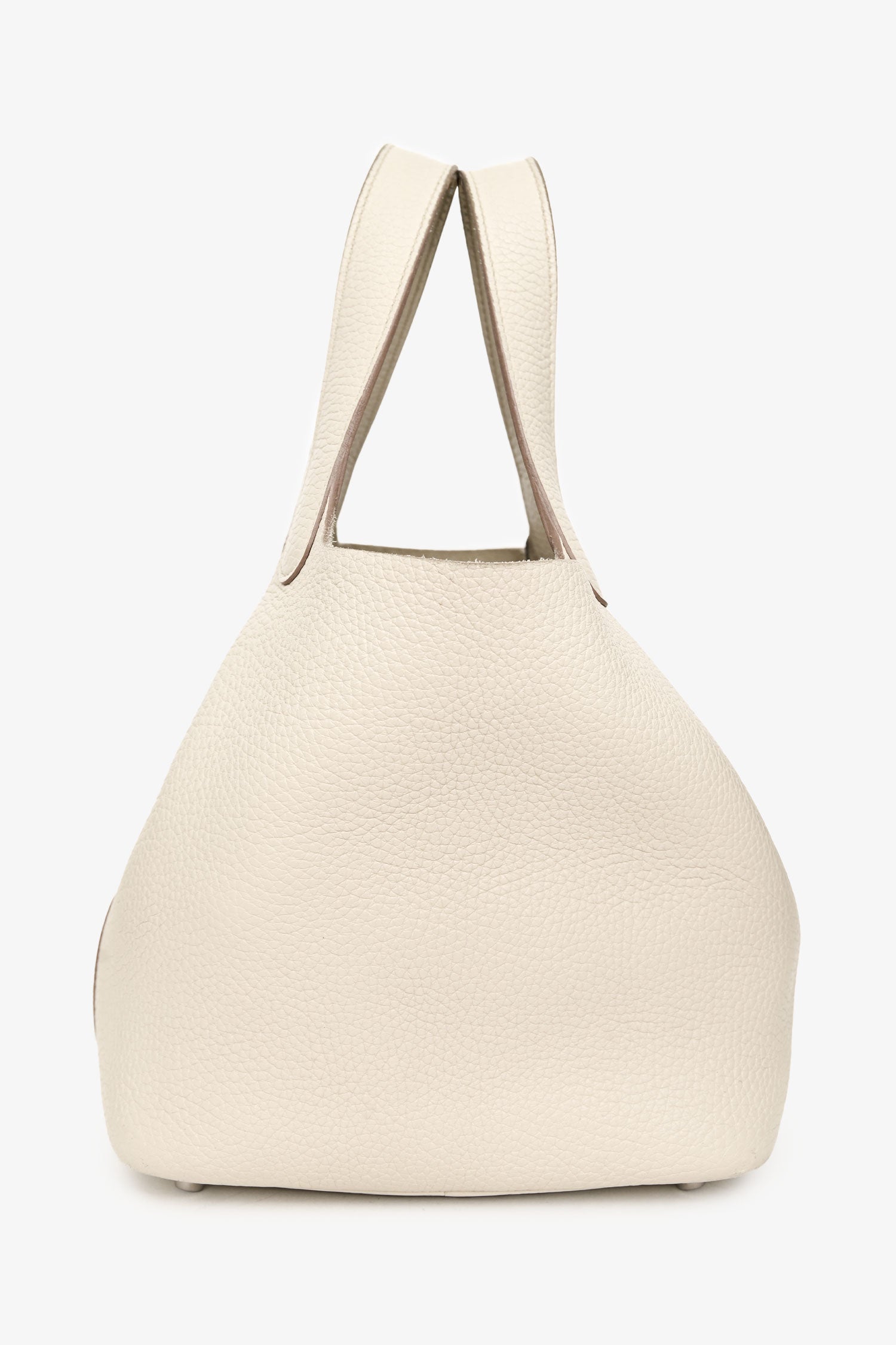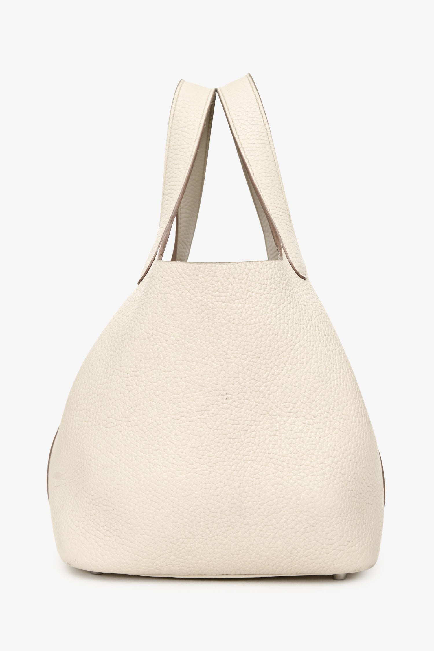 Refresh availabilityHermès 2018 White Clemence Leather Picotin 18. Top strap closure. Dual flat top handles. Suede-lined open interior. Inclusions: Lock and keys. Palladium hardware. Tonal stitching.