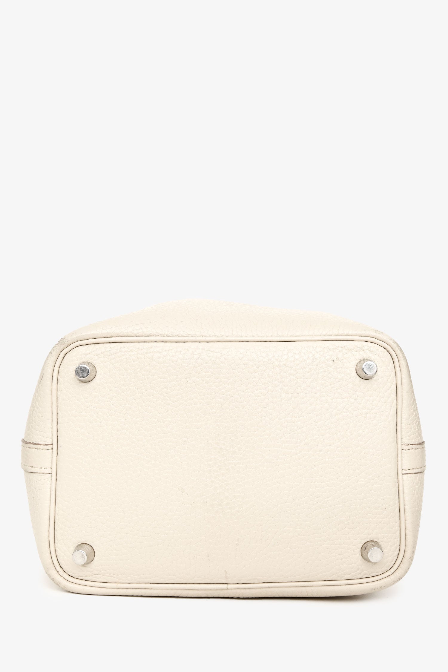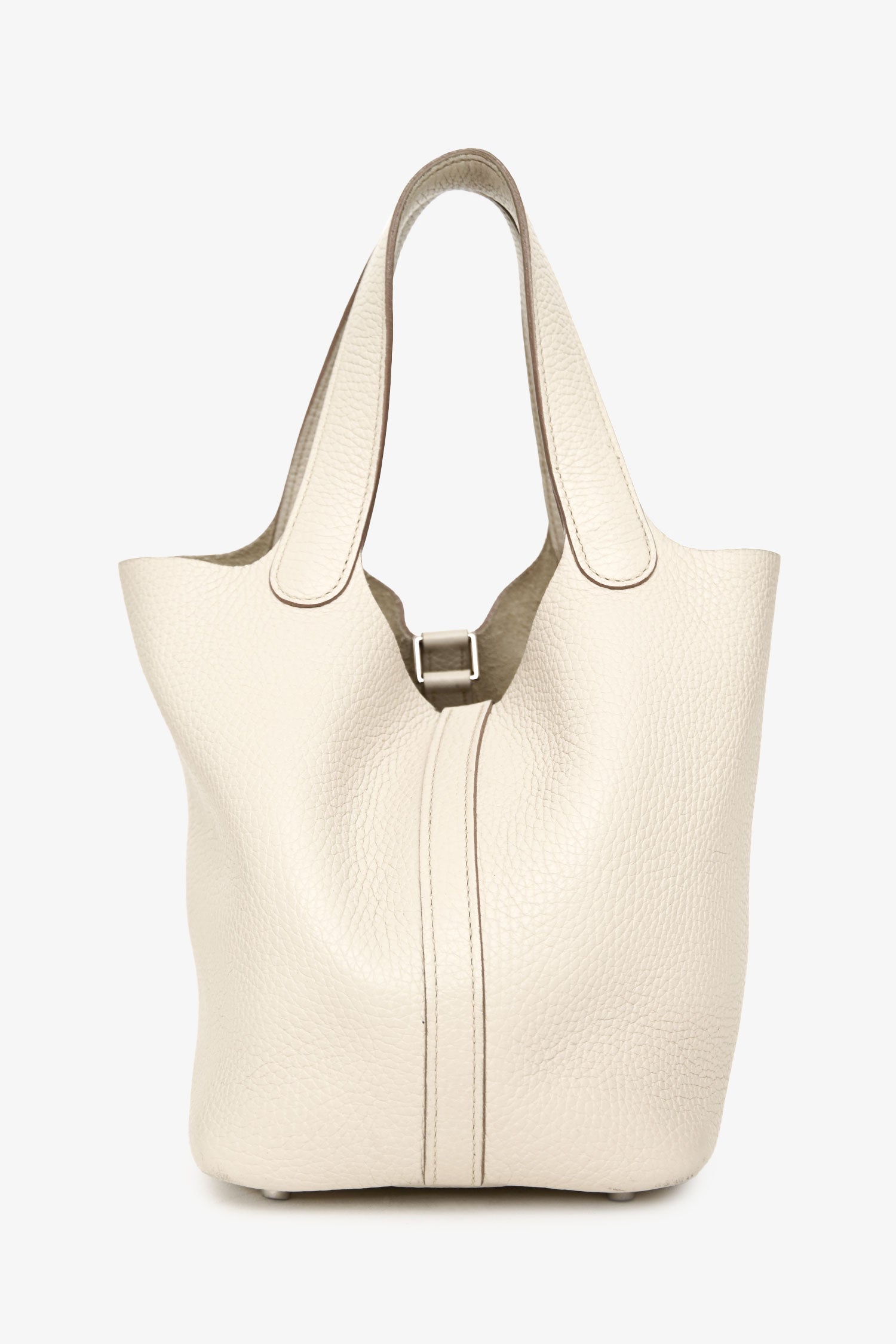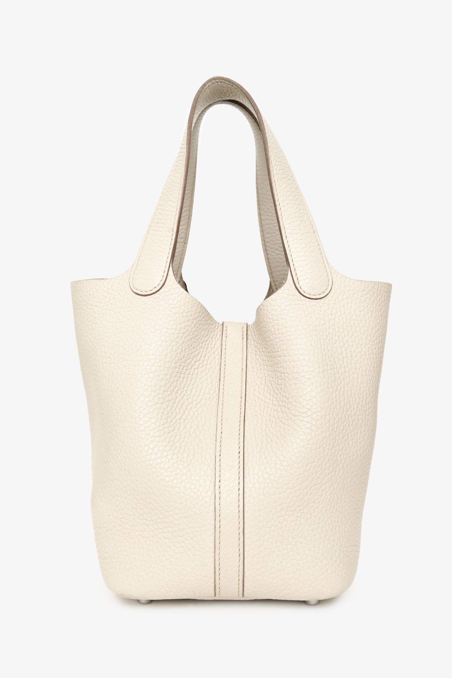 Refresh availabilityHermès 2018 White Clemence Leather Picotin 18. Top strap closure. Dual flat top handles. Suede-lined open interior. Inclusions: Lock and keys. Palladium hardware. Tonal stitching.
