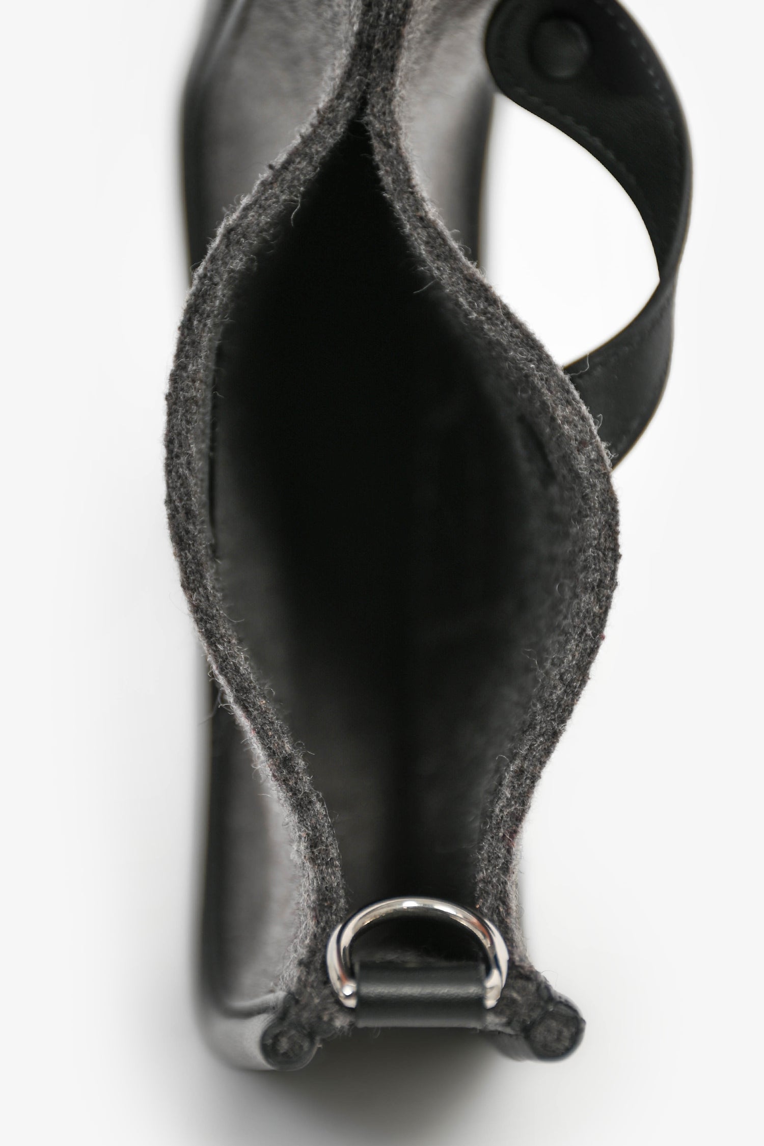 Refresh availabilityHermès 2019 Grey Felt Black Leather Trimmed Evelyne TPM. Perforated 'H'. Press snap closure. Leather trimming. Silver-tone hardware. Unlined. Canvas strap. Tonal stitching.
