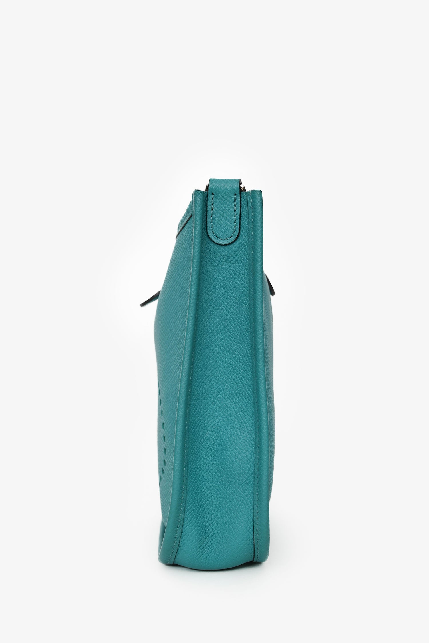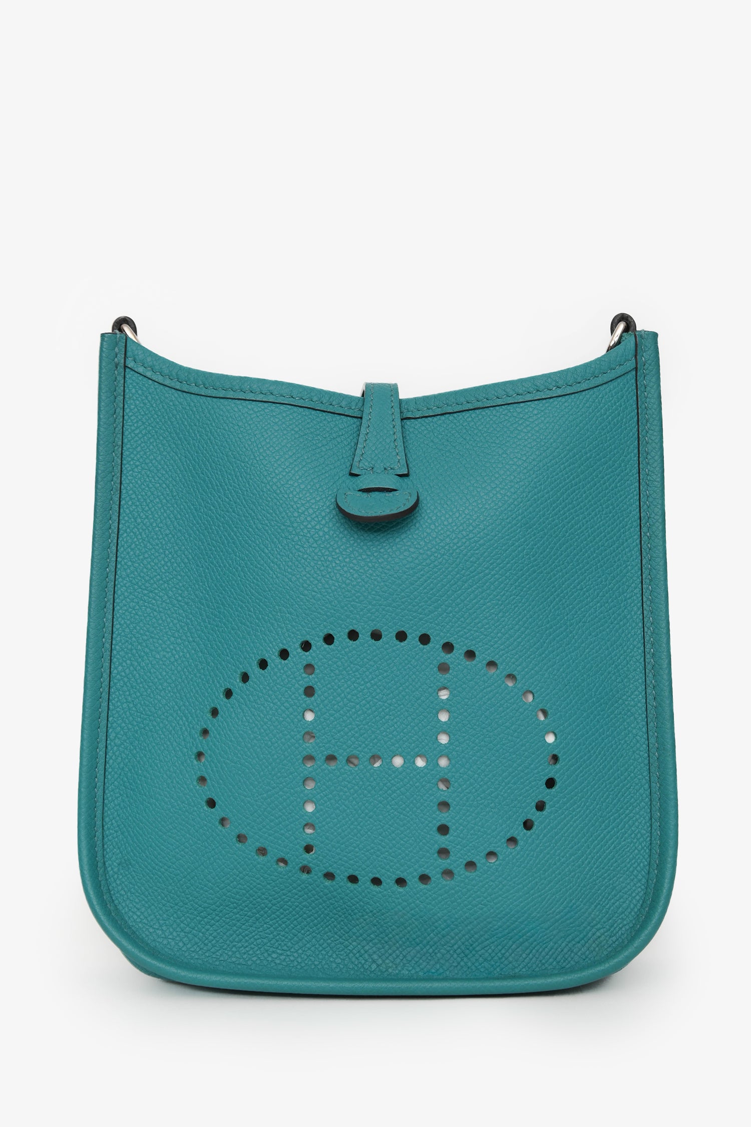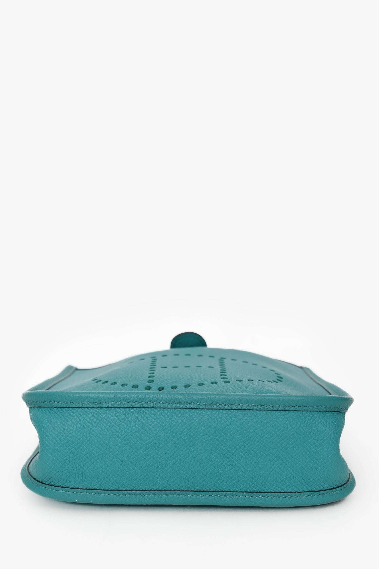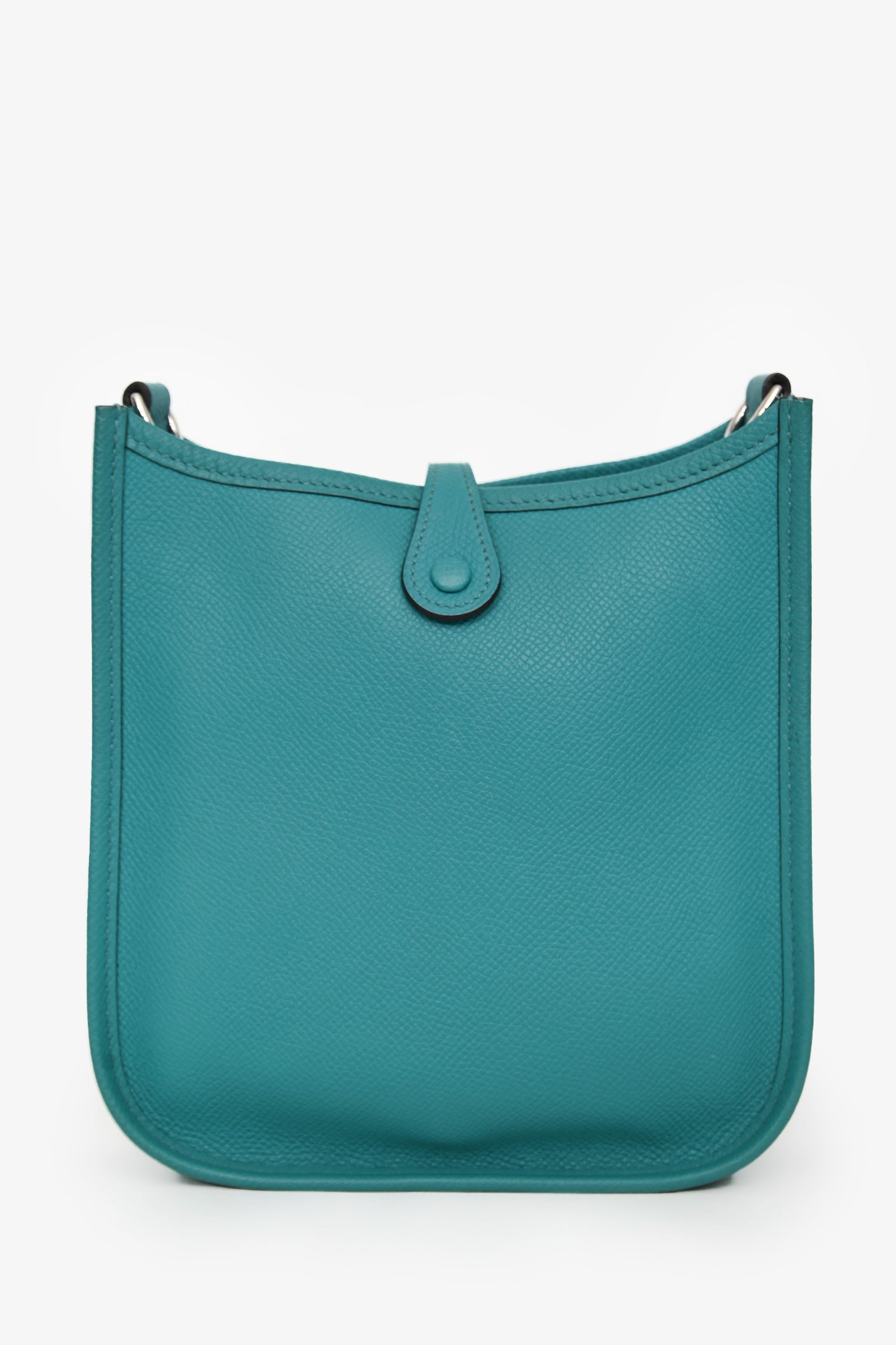 Refresh availabilityHermès 2019 Turquoise Clémence Evelyne I Très Petite Modèle 16. Snap tab closure. Detachable shoulder strap. 1 main compartment. Clémence leather construction. Silver-tone hardware. Tonal stitching.