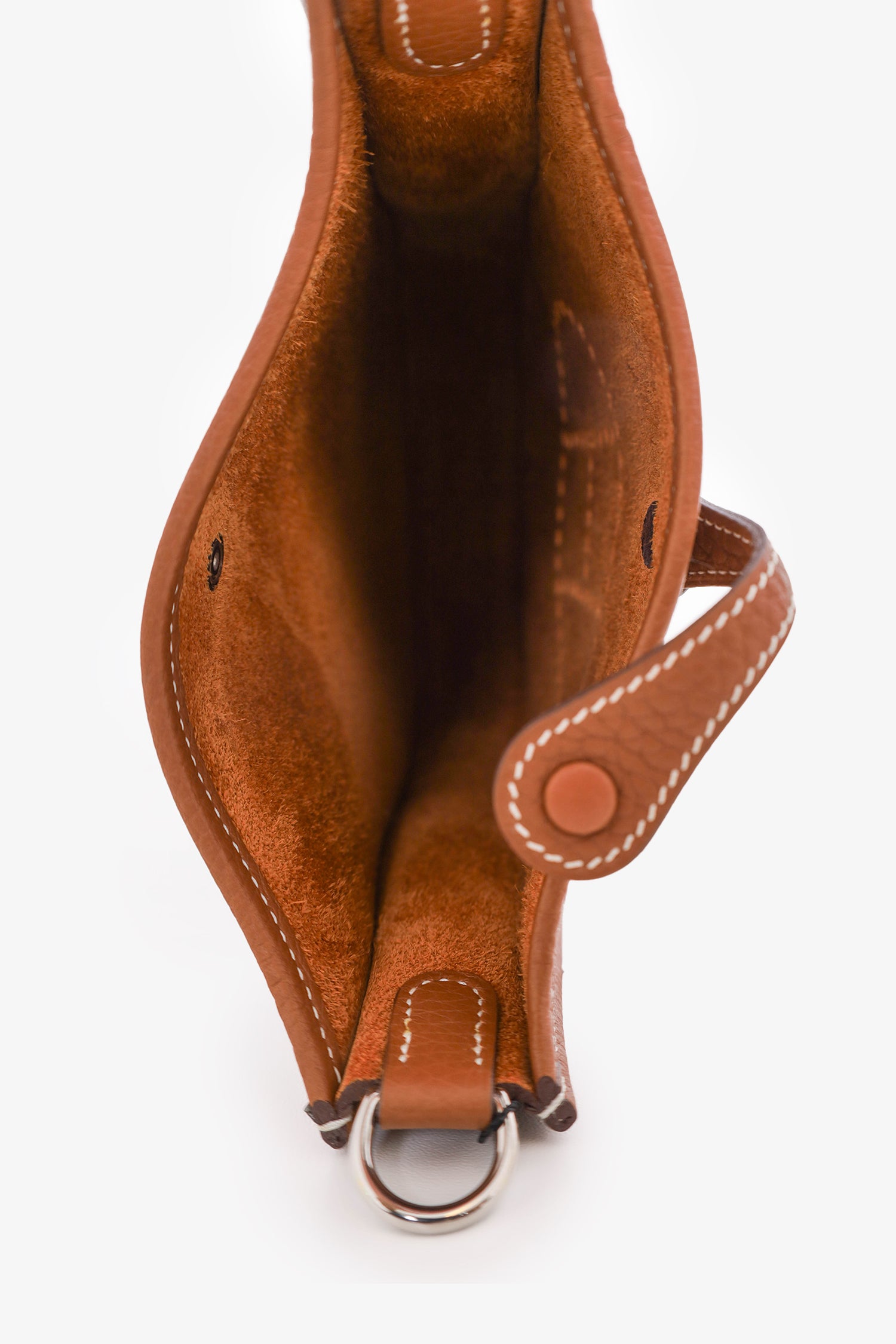 Refresh availabilityHermes 2020 Gold Clemence Leather Evelyne TPM Crossbody. Open top with single snap button closure. Open suede interior. Removable crossbody strap. Silver-tone hardware. Contrast stitching.