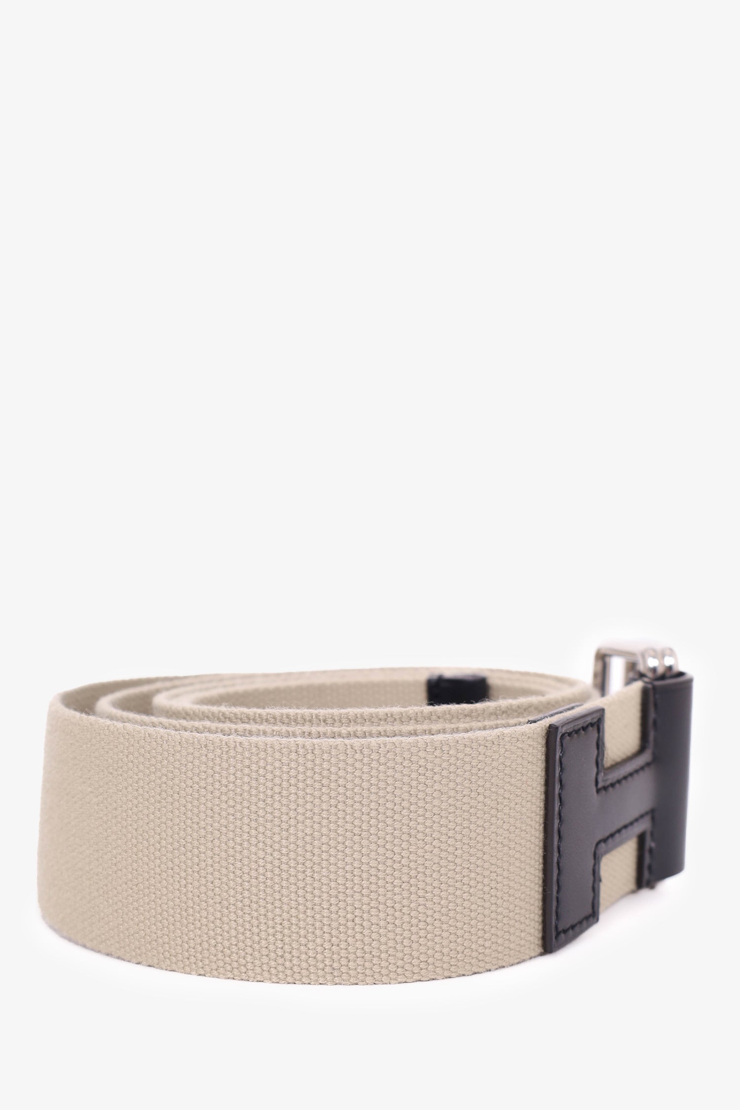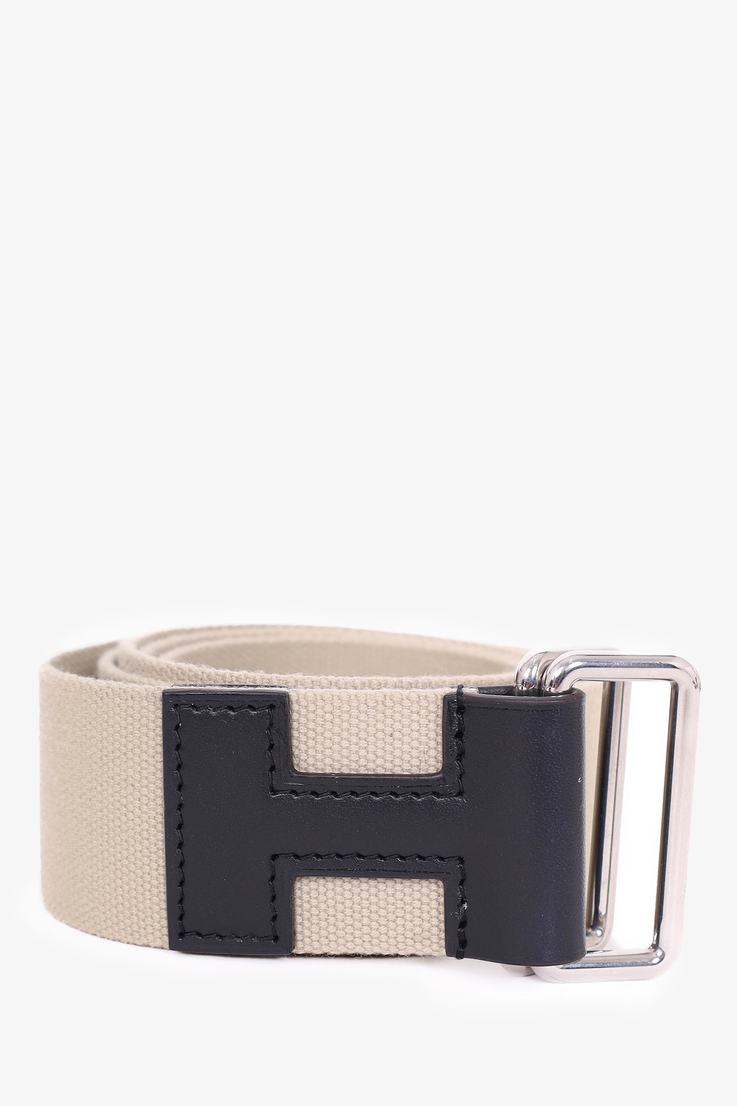 Refresh availabilityHermès 2021 Beige/Black Nomade 40 Belt. Leather belt in Hunter cowhide and strap in polycotton with palladium-plated buckle. Adjustable pull through buckle closure. Tonal stitching. Comes with original dustbag.