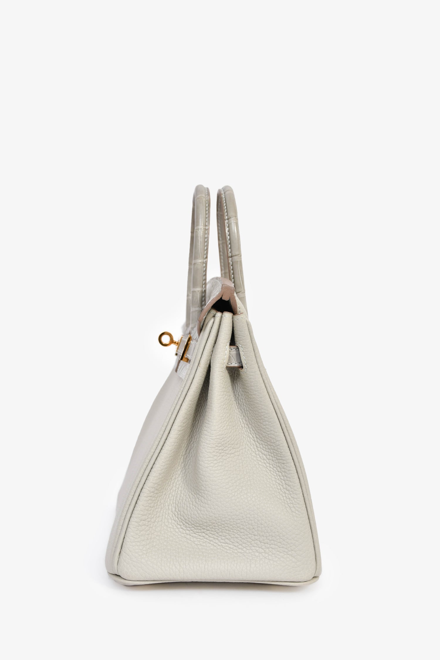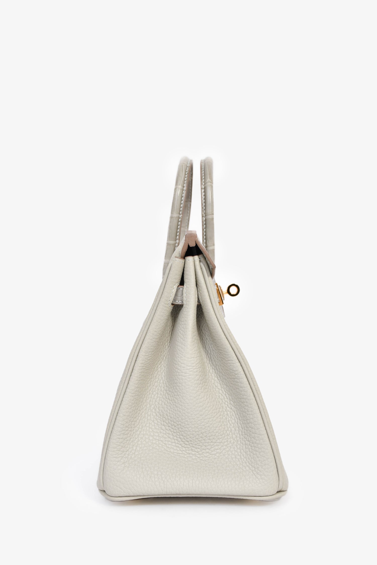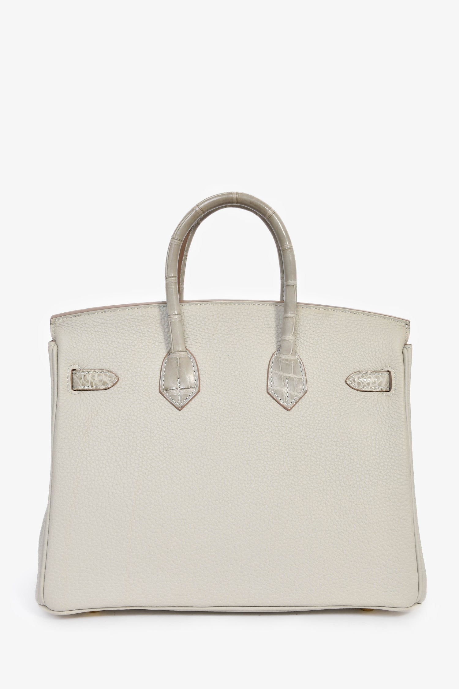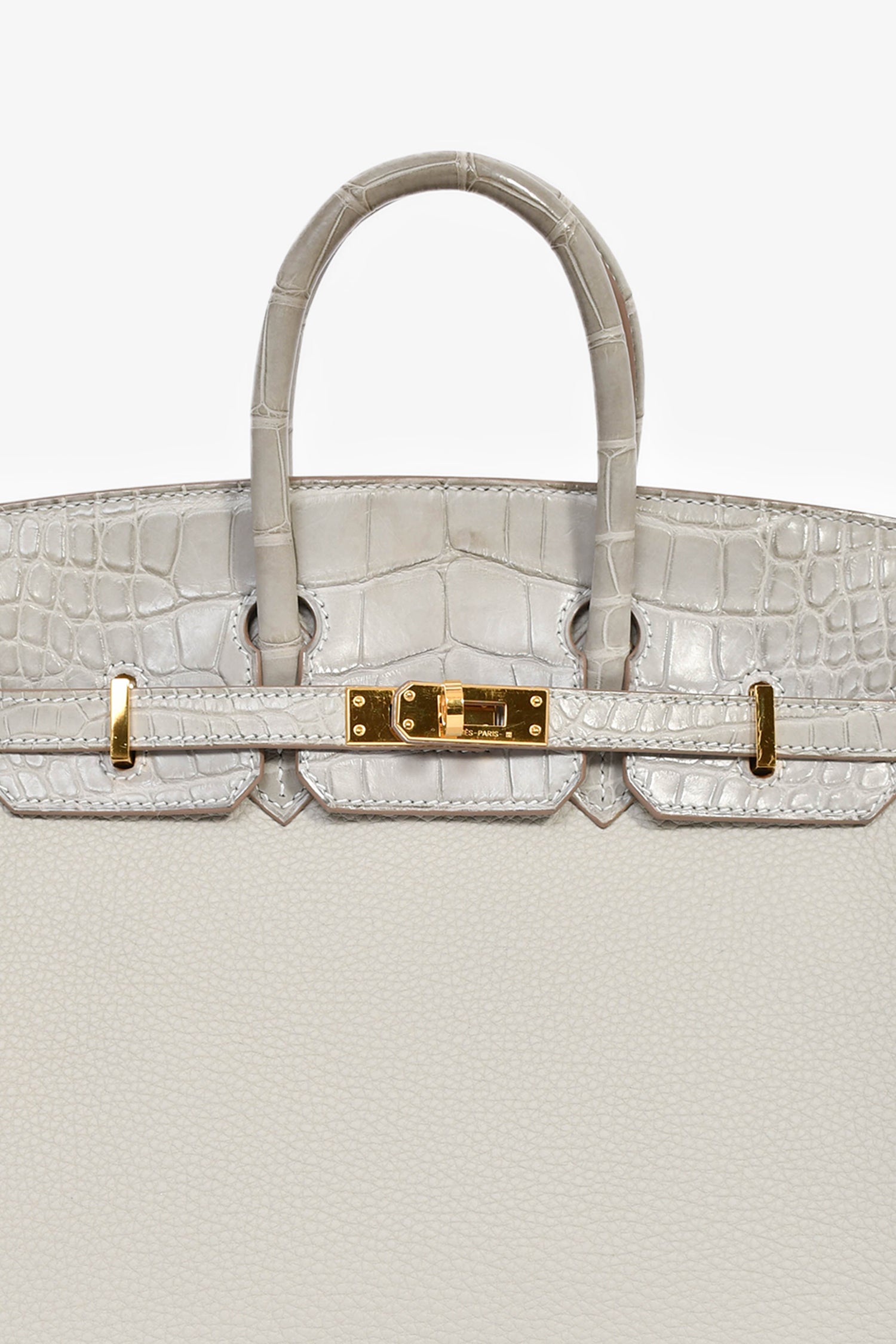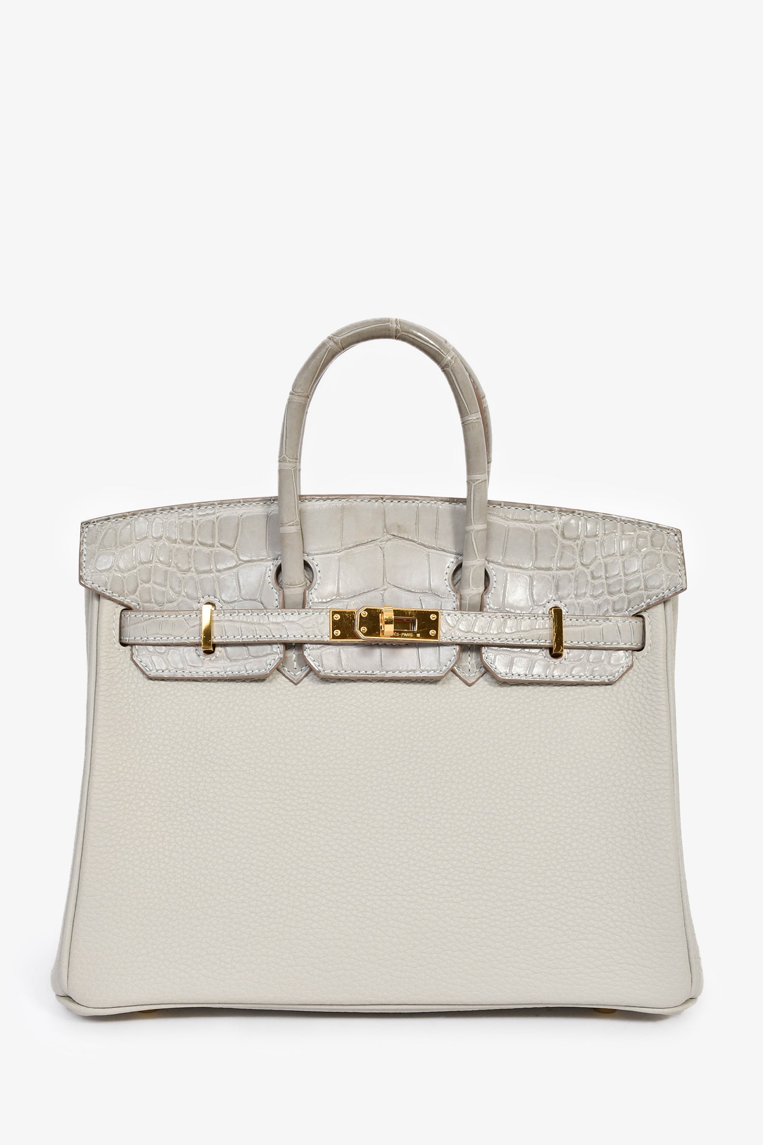 Refresh availabilityHermès 2023 Pearl Grey Clemence/Alligator Birkin 25. Front fold-over flap with 2 pull straps and a turn-lock closure. Dual rolled handles. 3 interior compartments: 1 zip and 2 slip. Comes with a clochette, lock, and 2 keys. Gold-tone hardware. Contrast stitching.
