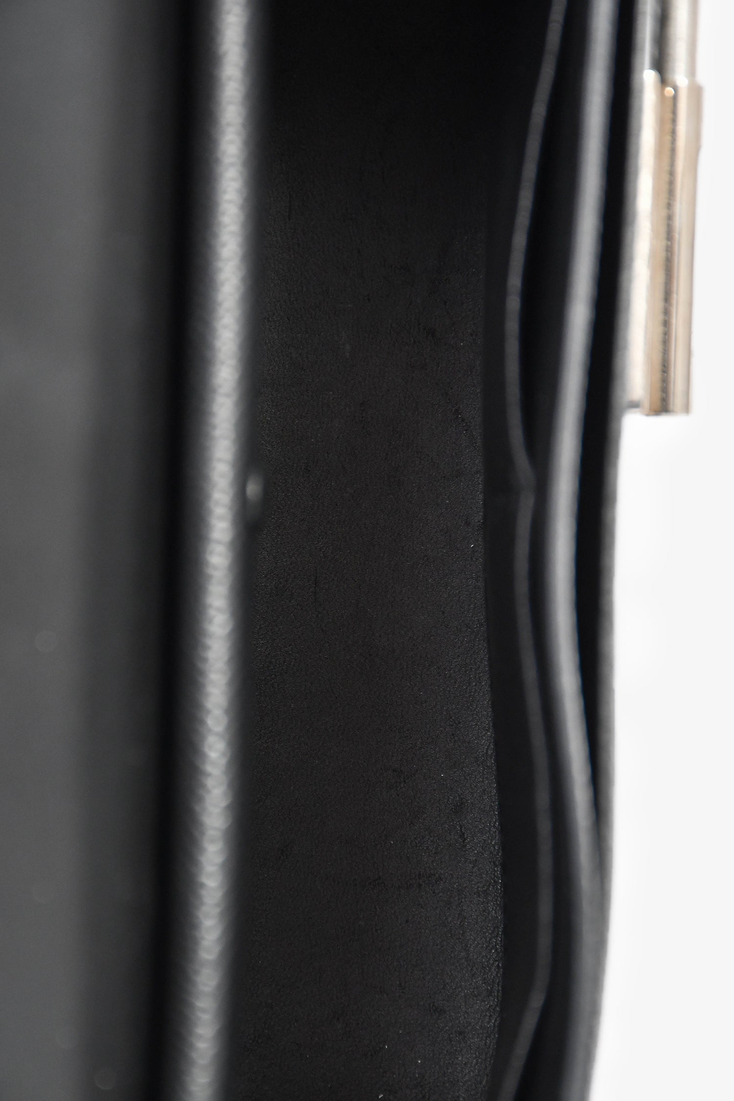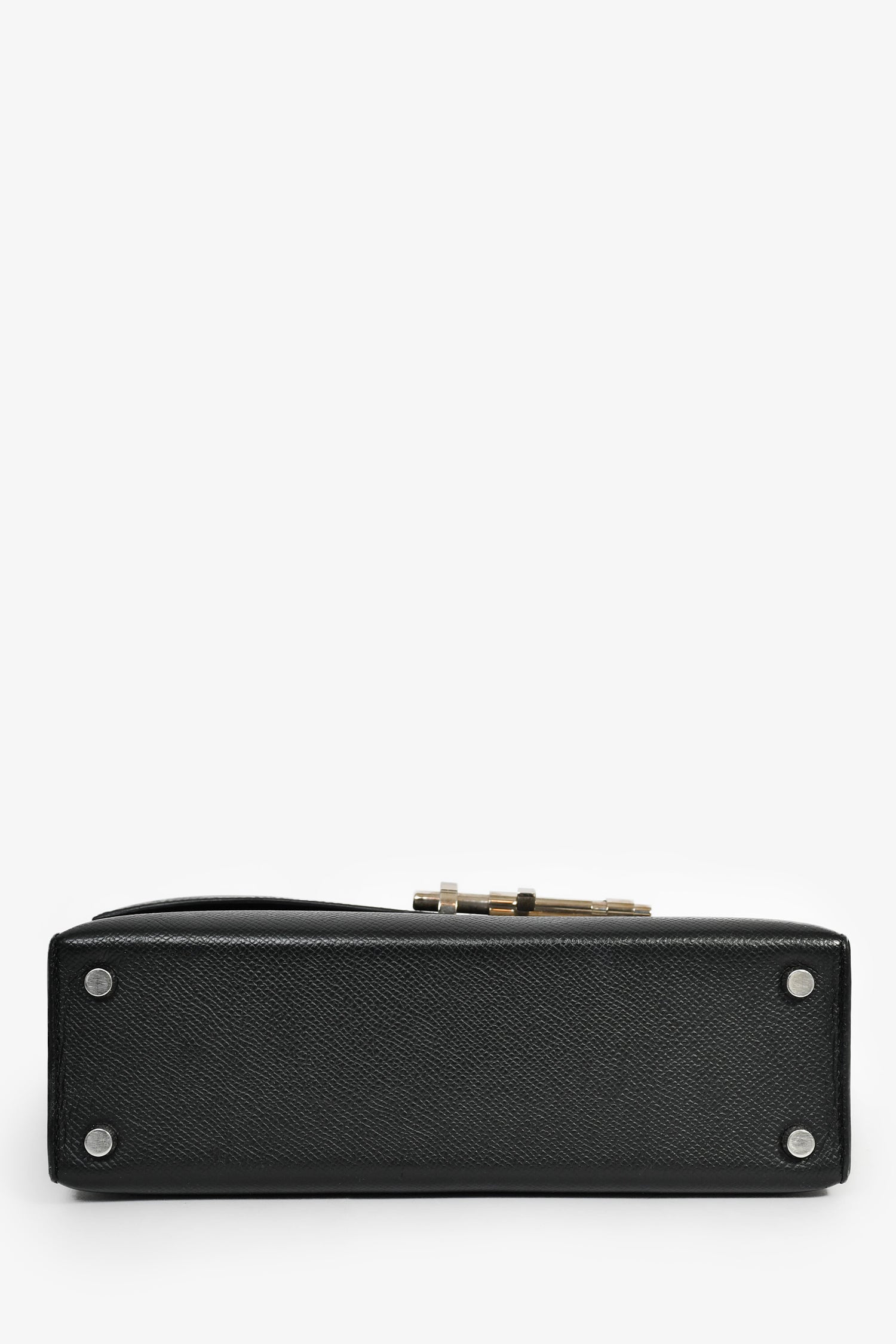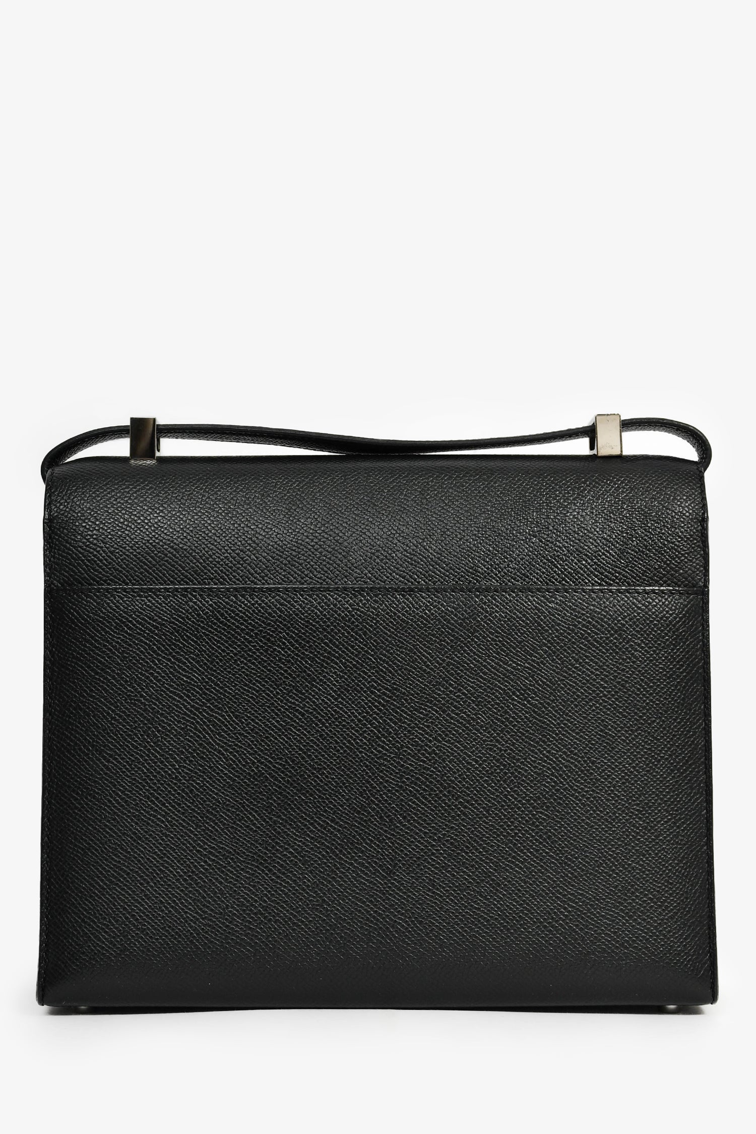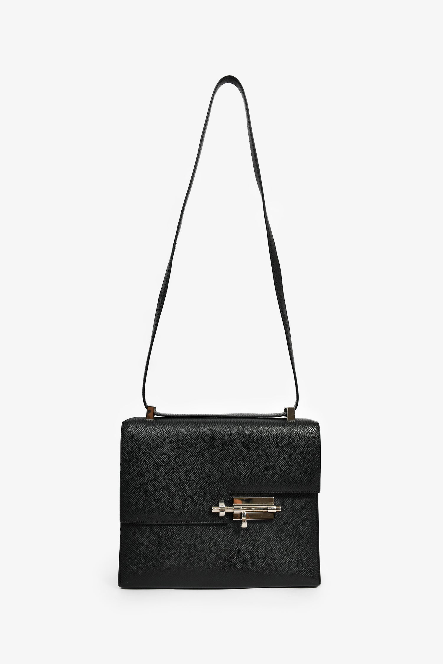 Refresh availabilityHermes Black Epsom Leather Verrou 23 Shoulder Bag. Pull-through closure. Front fold-over flap with push-lock closure. Shoulder strap. Single rear exterior slip pocket. Protective base studs. Lined interior. 2 interior slip pockets. Silver-tone hardware. Tonal stitching.