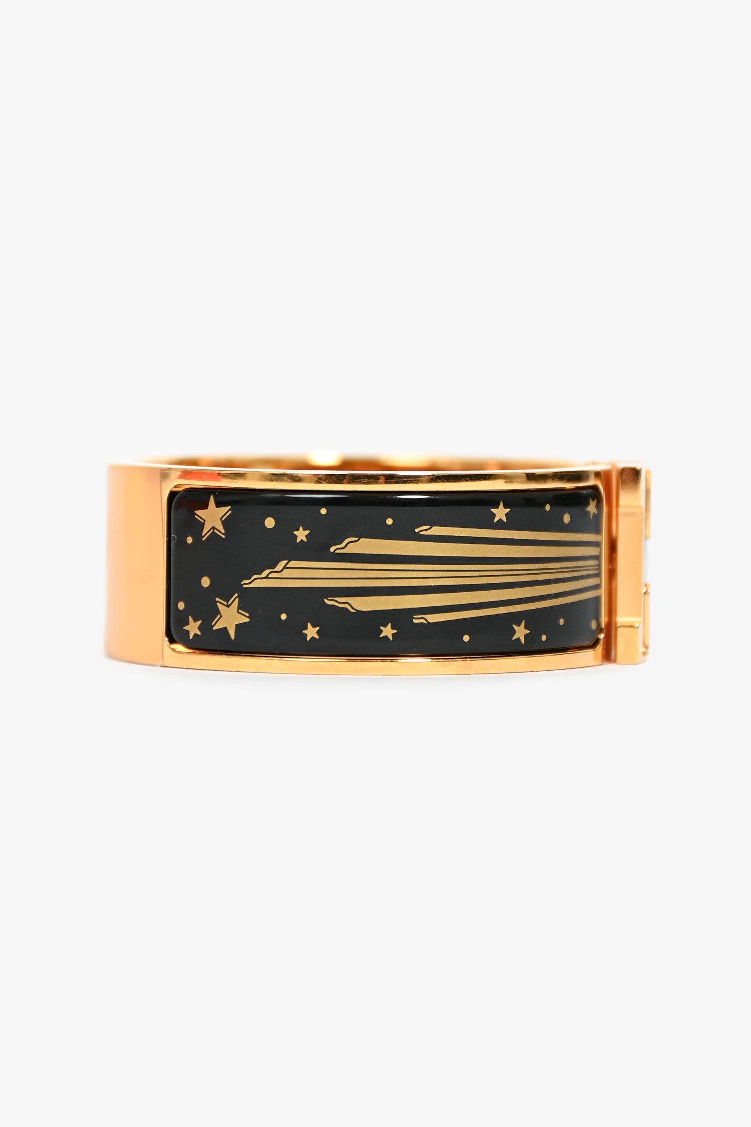 Refresh availabilityHermès Black/Gold Enamel Printed H 'Poste et Cavalerie' Clic Clac Bracelet. 'H' turn-lock closure. Black enamel.