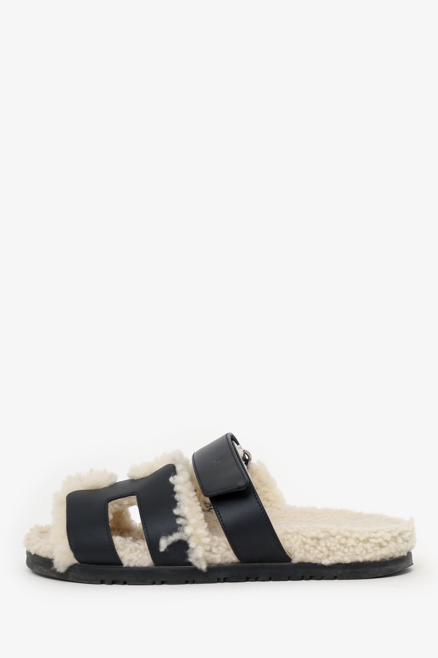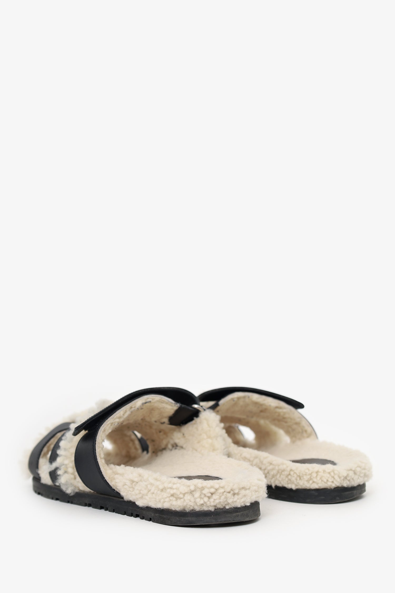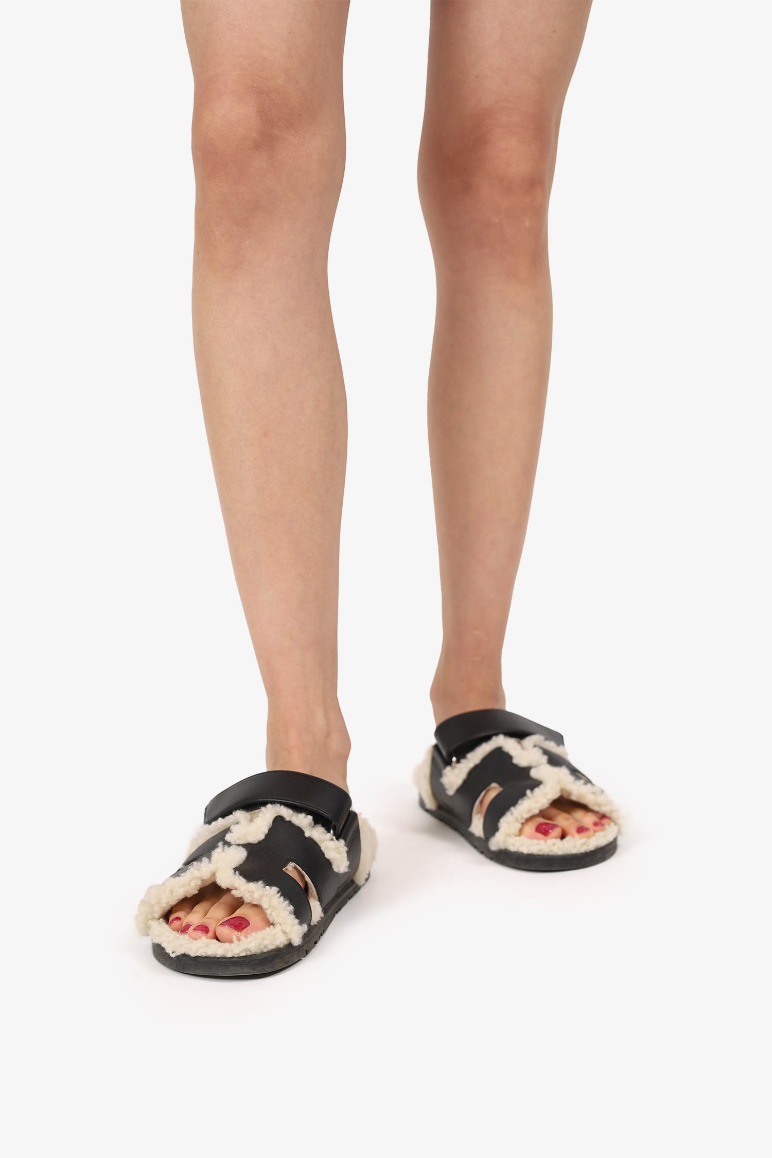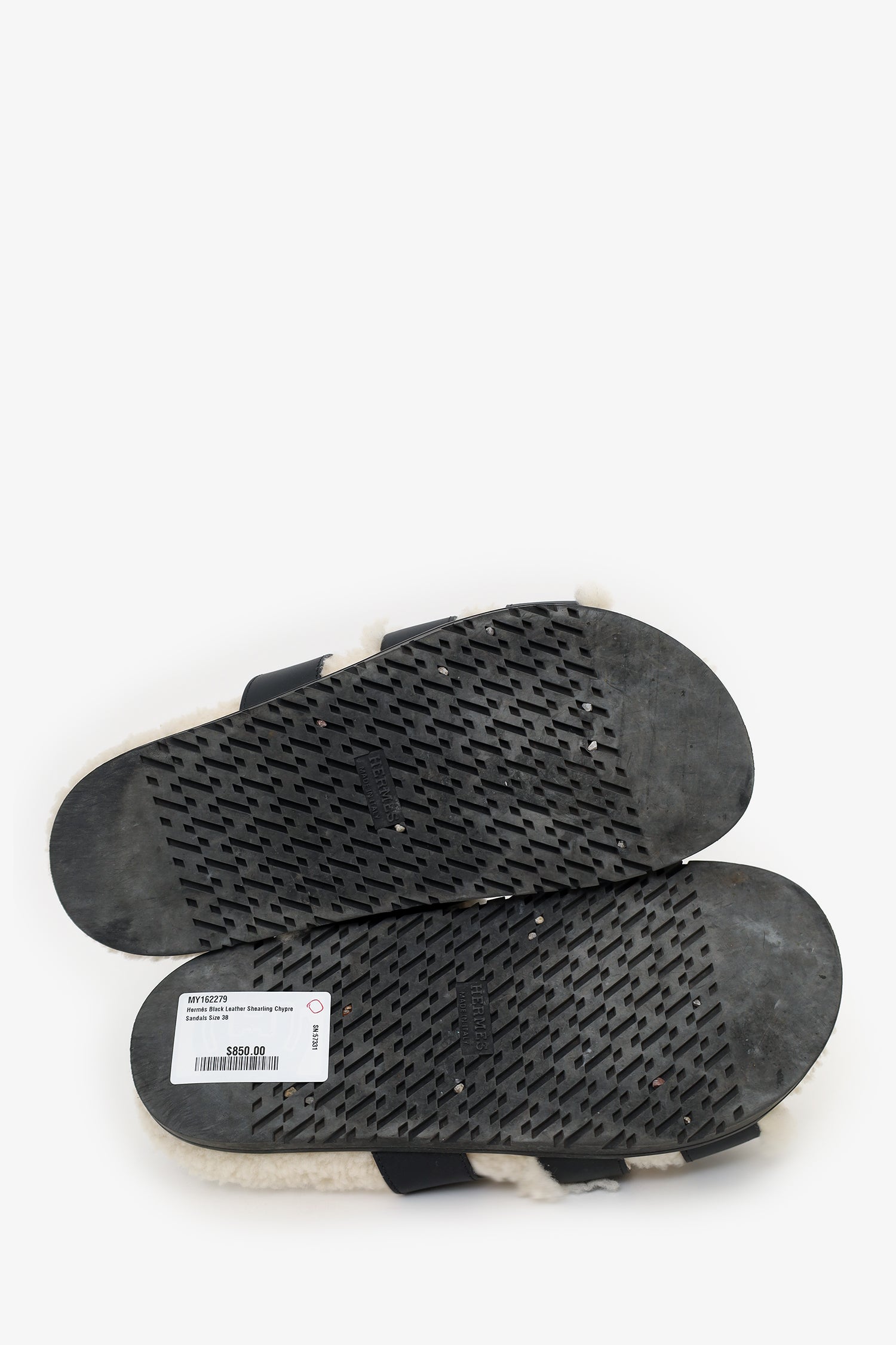 Hermès Black Leather Shearling Chypre Sandals Size 38