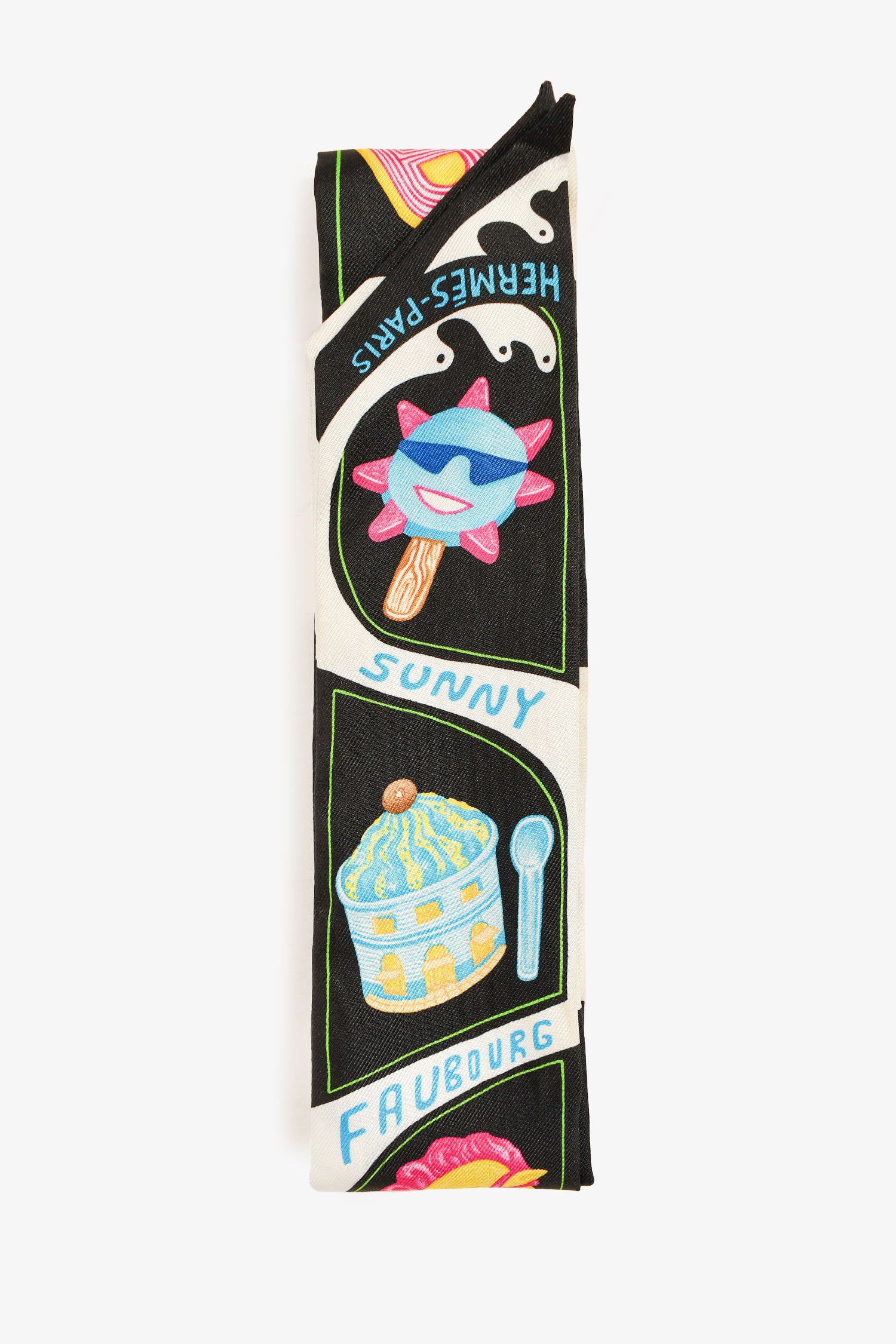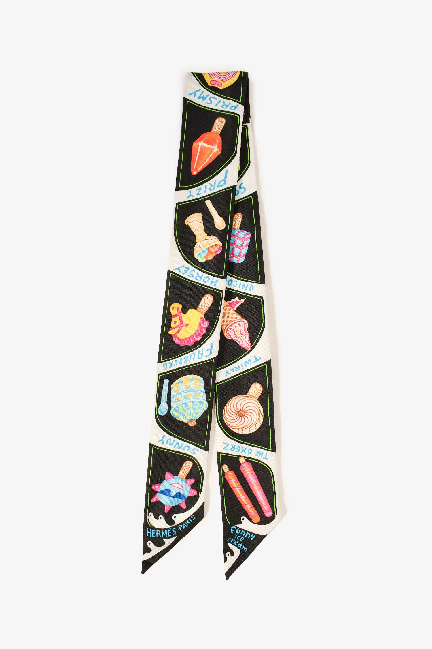 Refresh availabilityHermès Black Multicolour 'Funny Ice Cream' Printed Silk Twilly. Tonal stitching.
