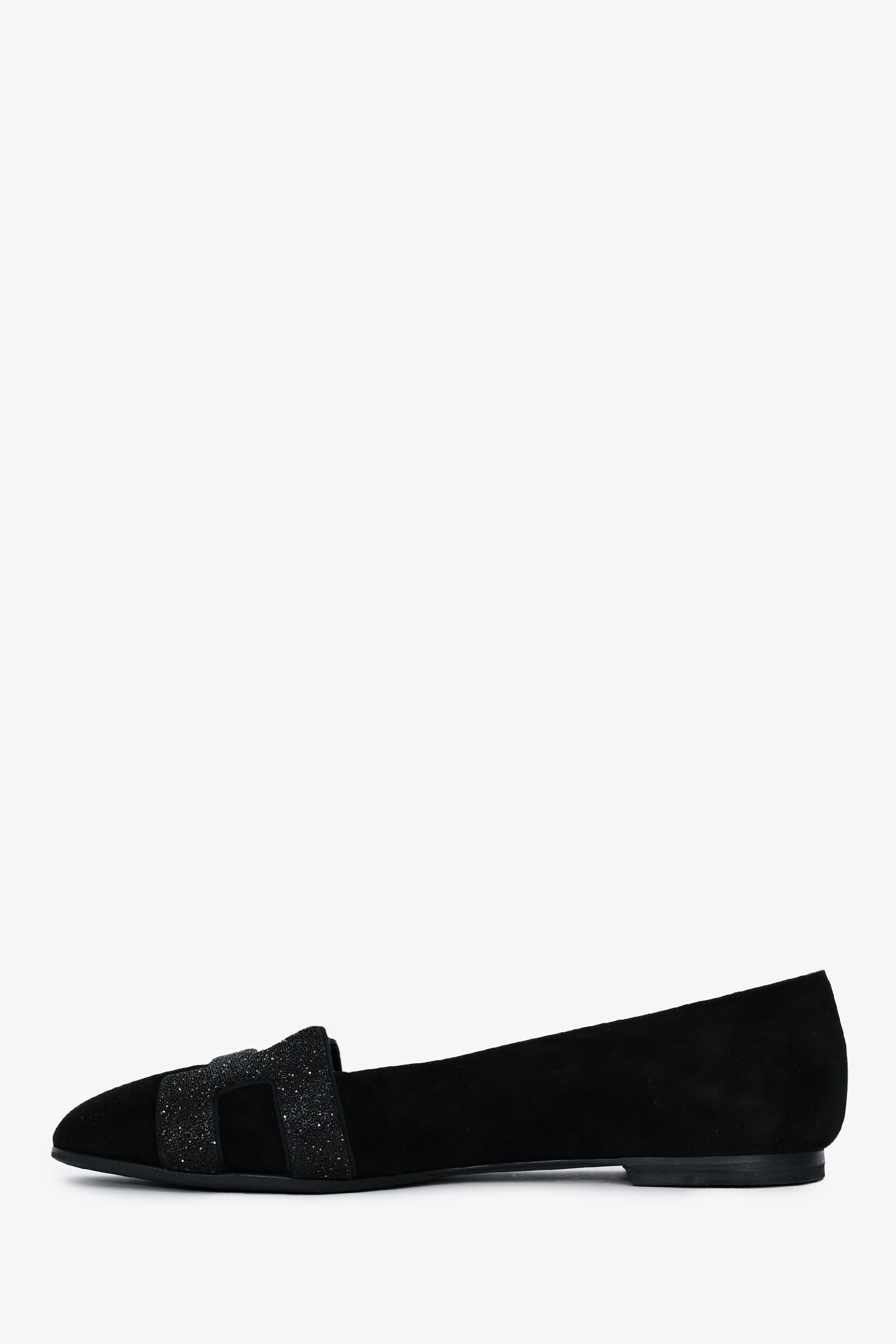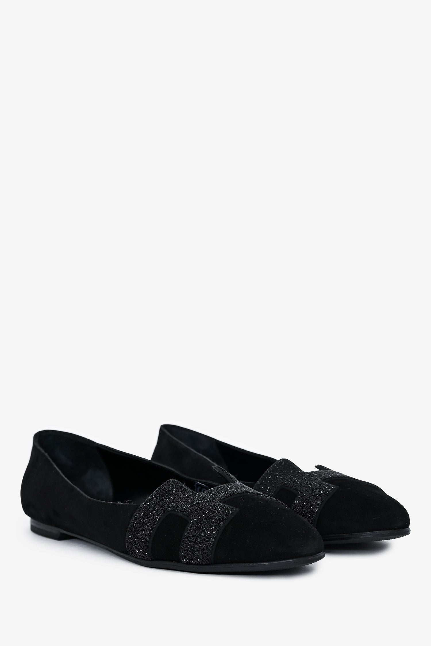 Refresh availabilityHermes Black Suede Leather Crystal Embellished H Logo Nice Flats. Round toe. Crystal 'H'. Leather insoles. Suede trim. Tonal stitching.