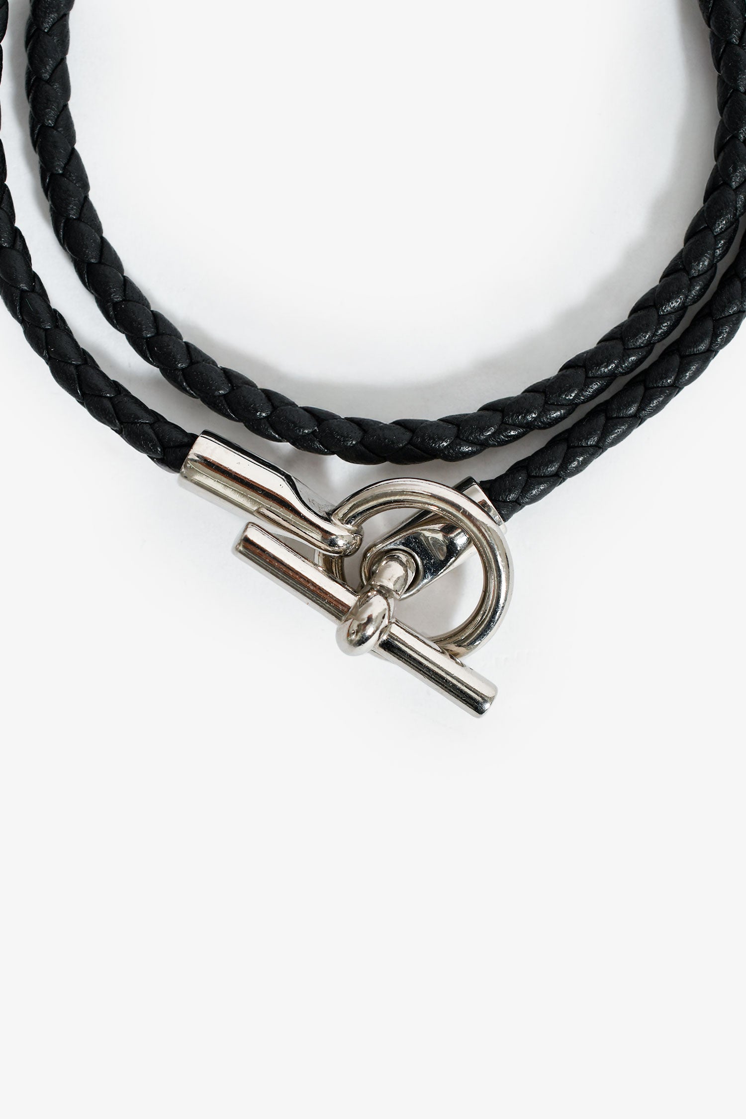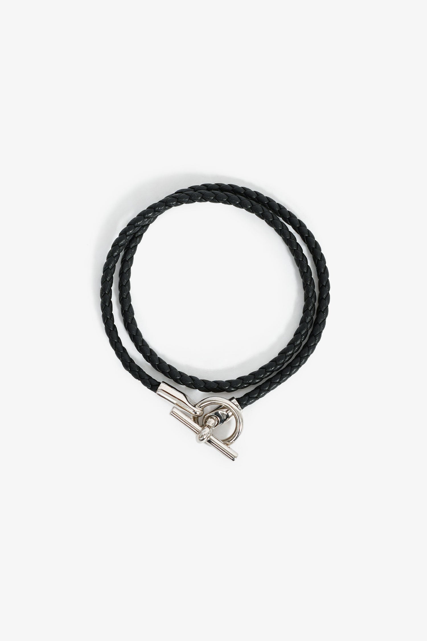 Refresh availabilityHermes Black/Silver Leather 'Glenan Double Tour' Bracelet. Toggle pull-through closure. Silver-tone hardware. Tonal stitching.