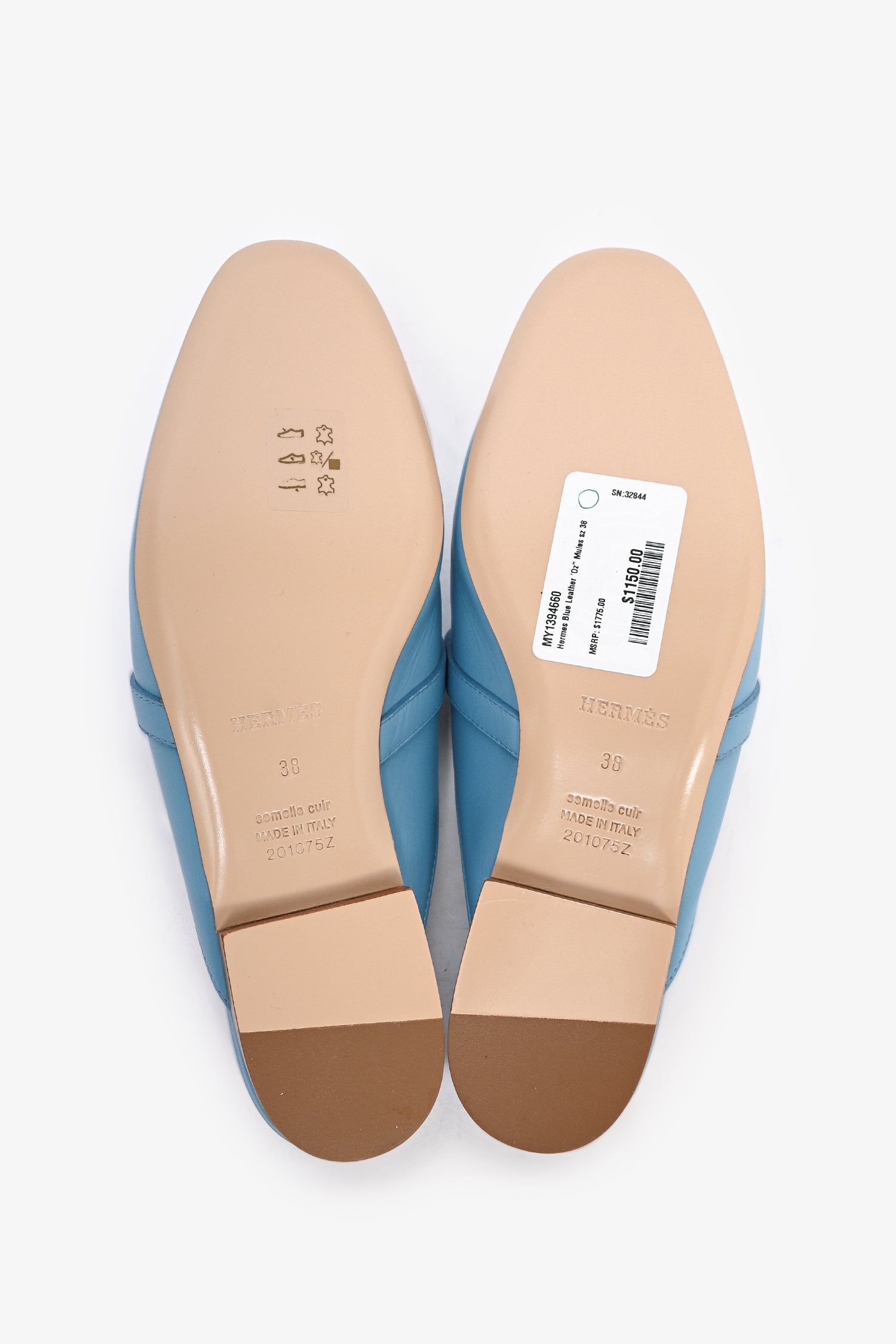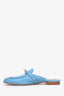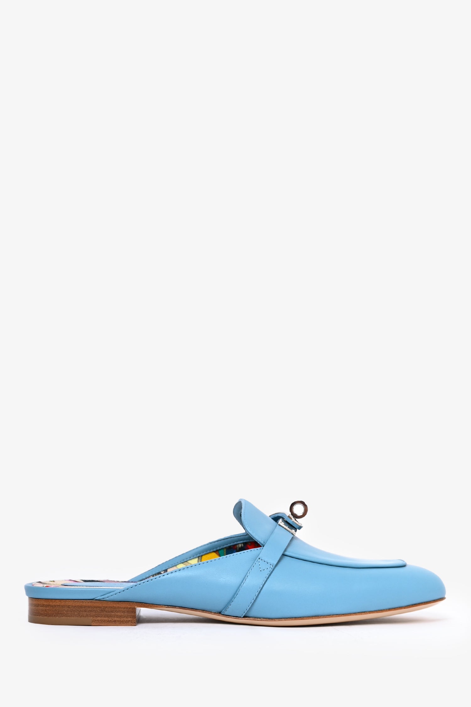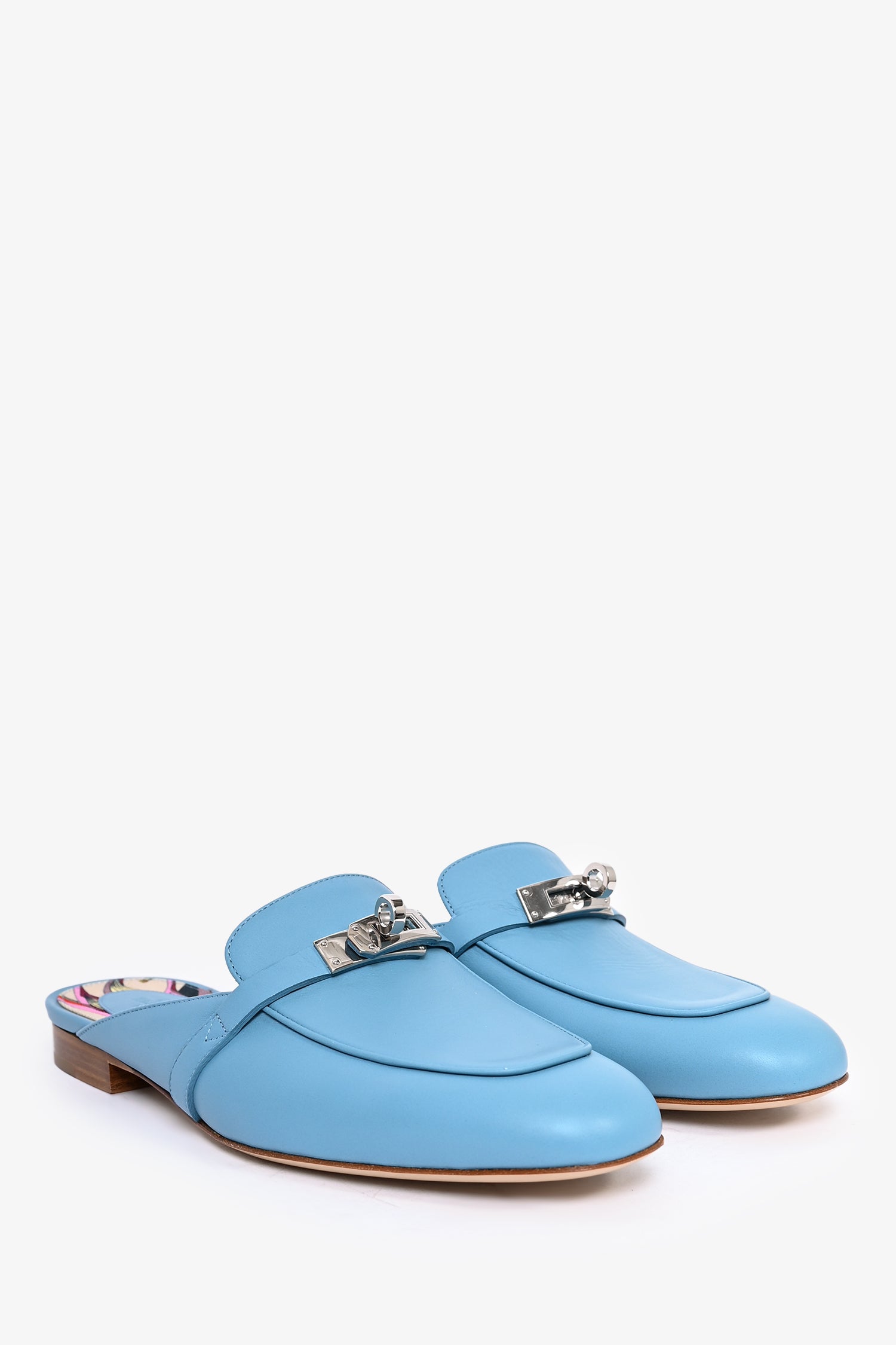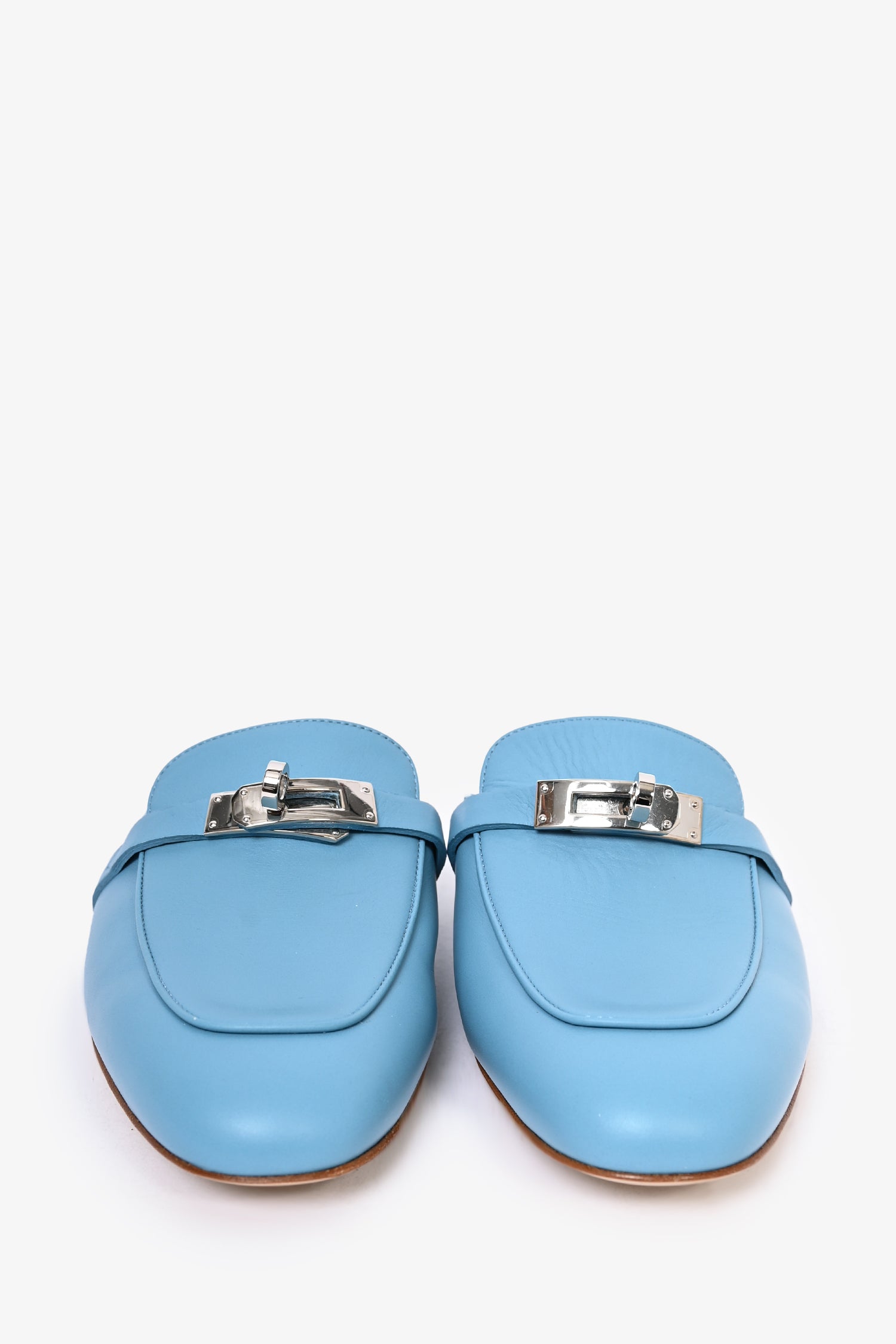 Refresh availabilityHermès Blue Leather 'Oz" Mules. Tonal stitching. Silver-tone hardware.
