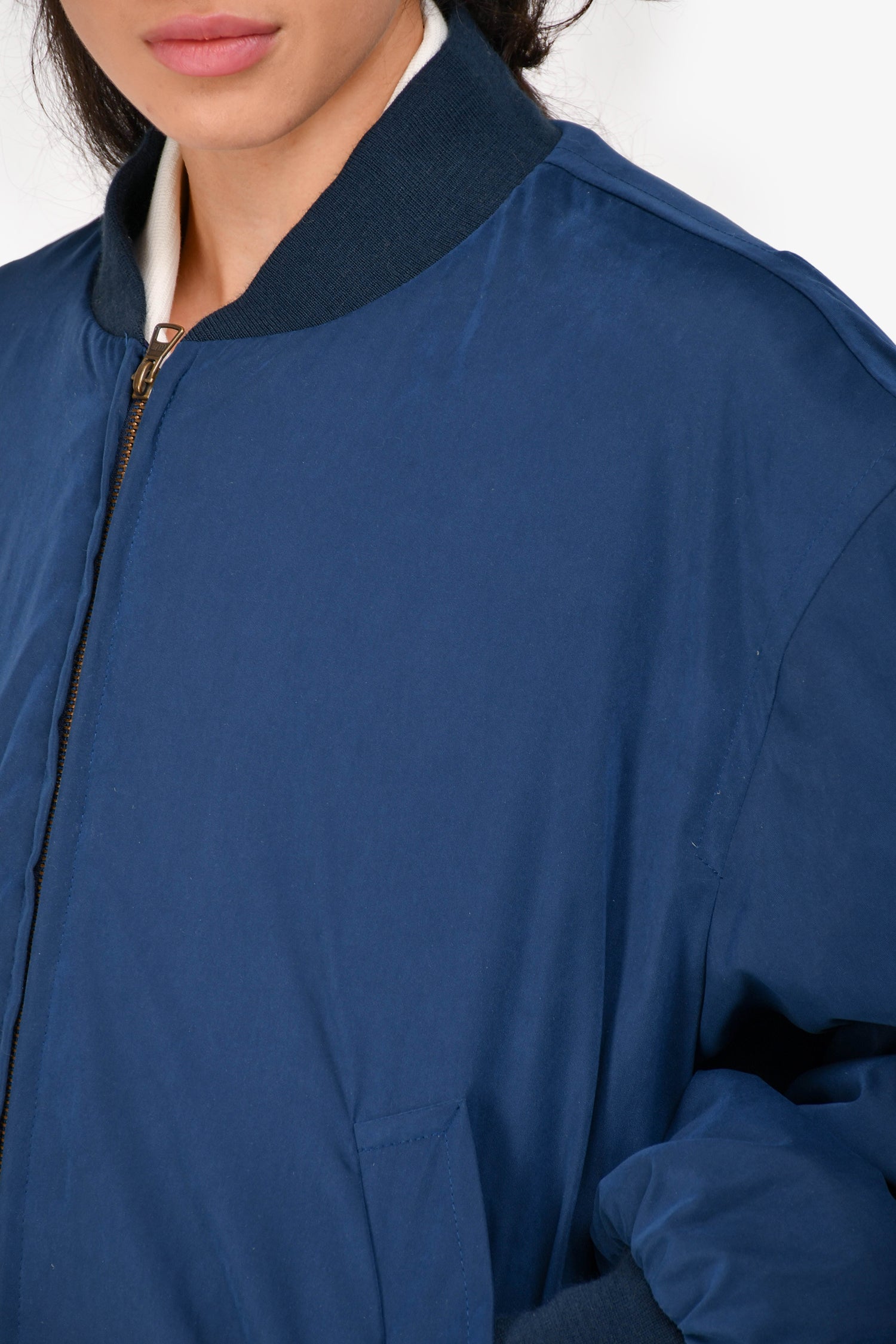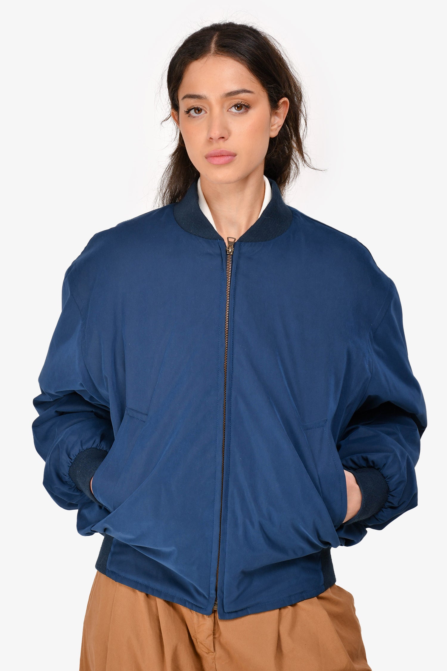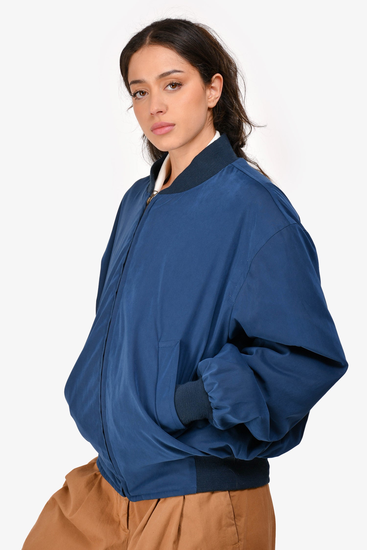 Refresh availabilityHermès Blue Silk Reversible Bomber Jacket. Front zip-up closure. Pockets on both sides. Gold-tone hardware. Tonal stitching.