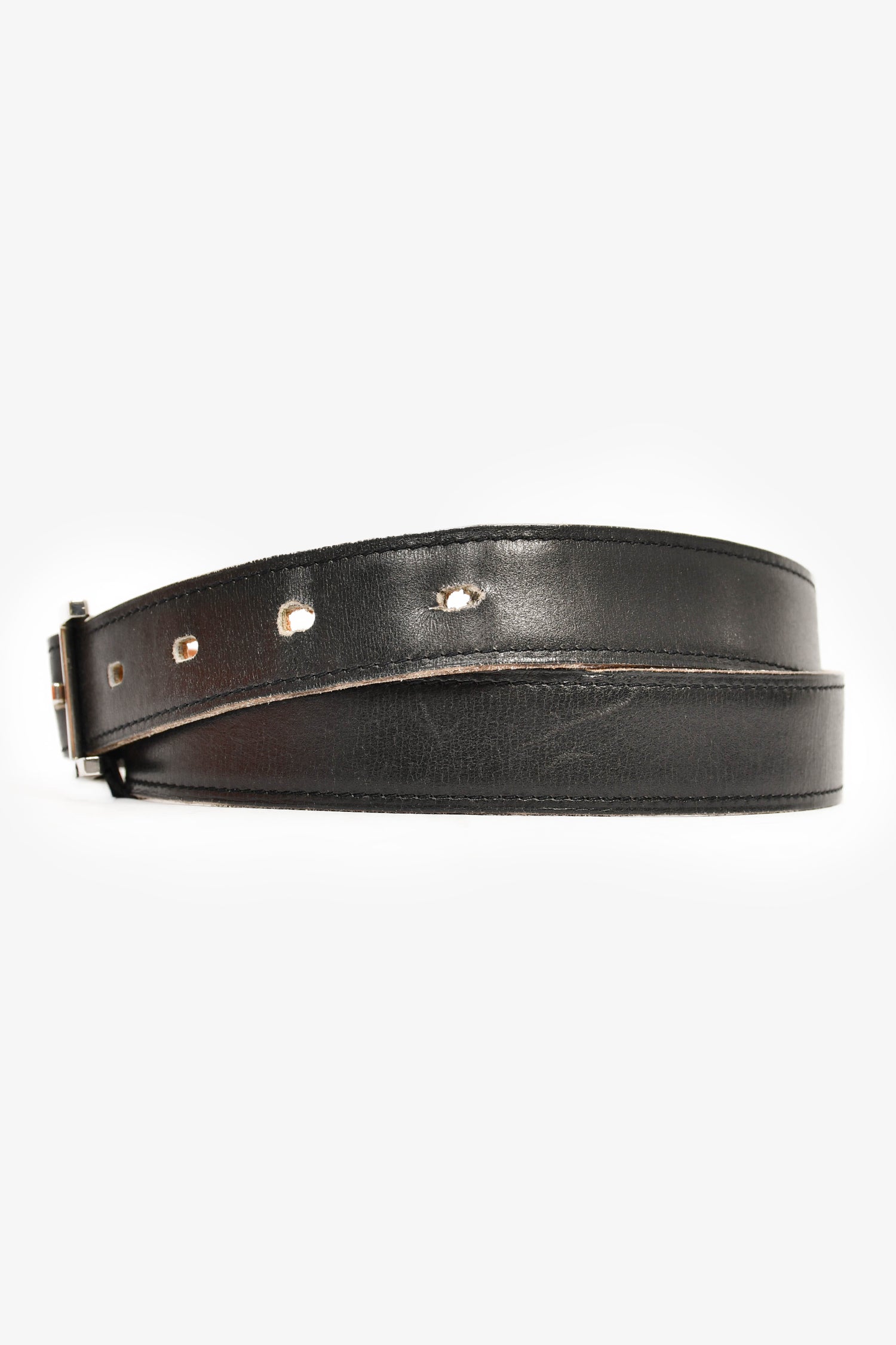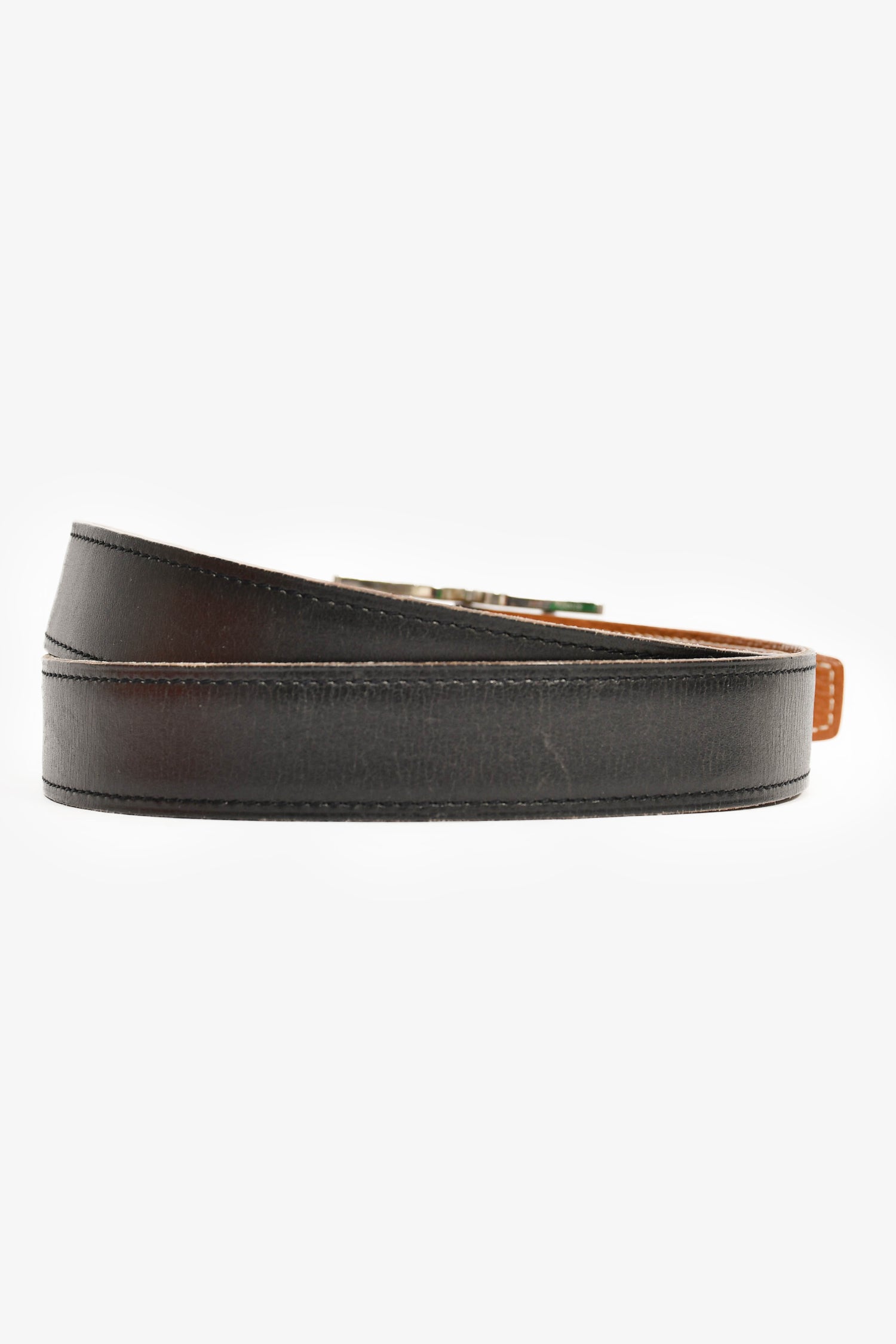 Condition: This item is in fair pre-loved condition with scratches on hardware. Some wear on the edge of the coated leather trimming. Wear and creasing on the first two belt hole.