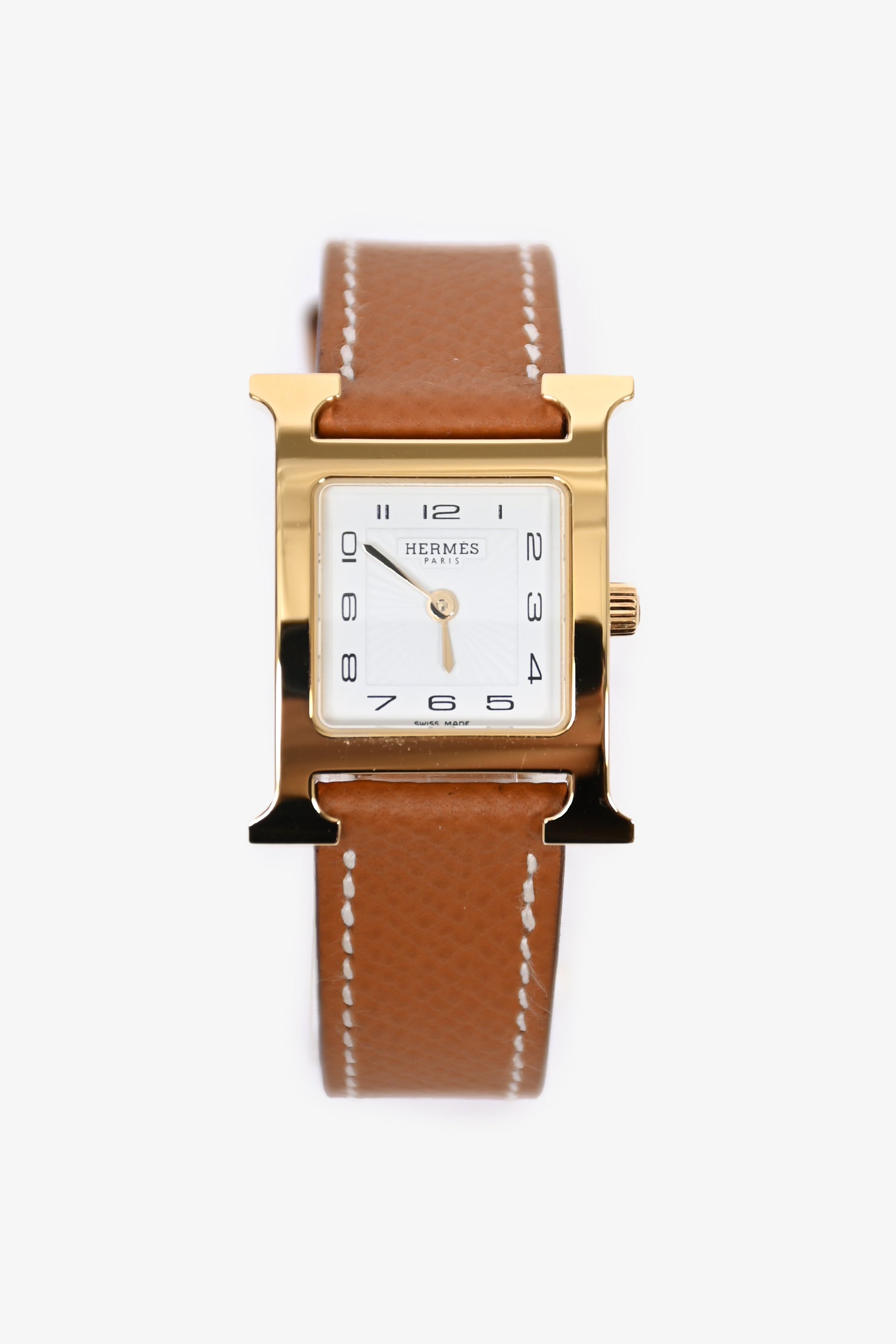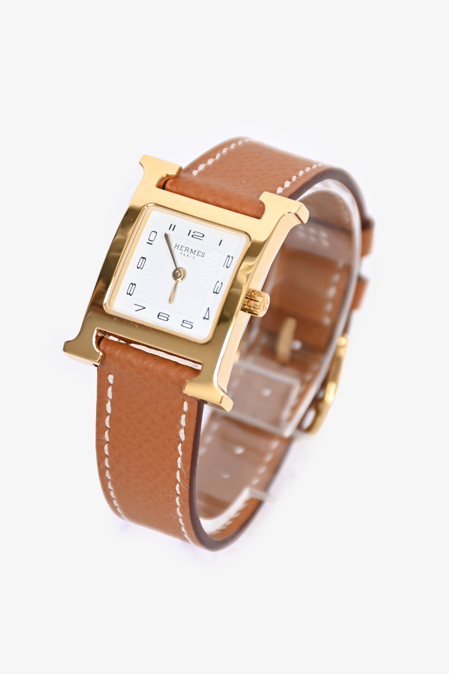 Refresh availabilityHermès Gold Epsom Leather Small 25mm Heure Watch. Contrast stitching. Rectangular 'H' face. Epsom leather wrist band with perforated holes. Gold-tone pin buckle.