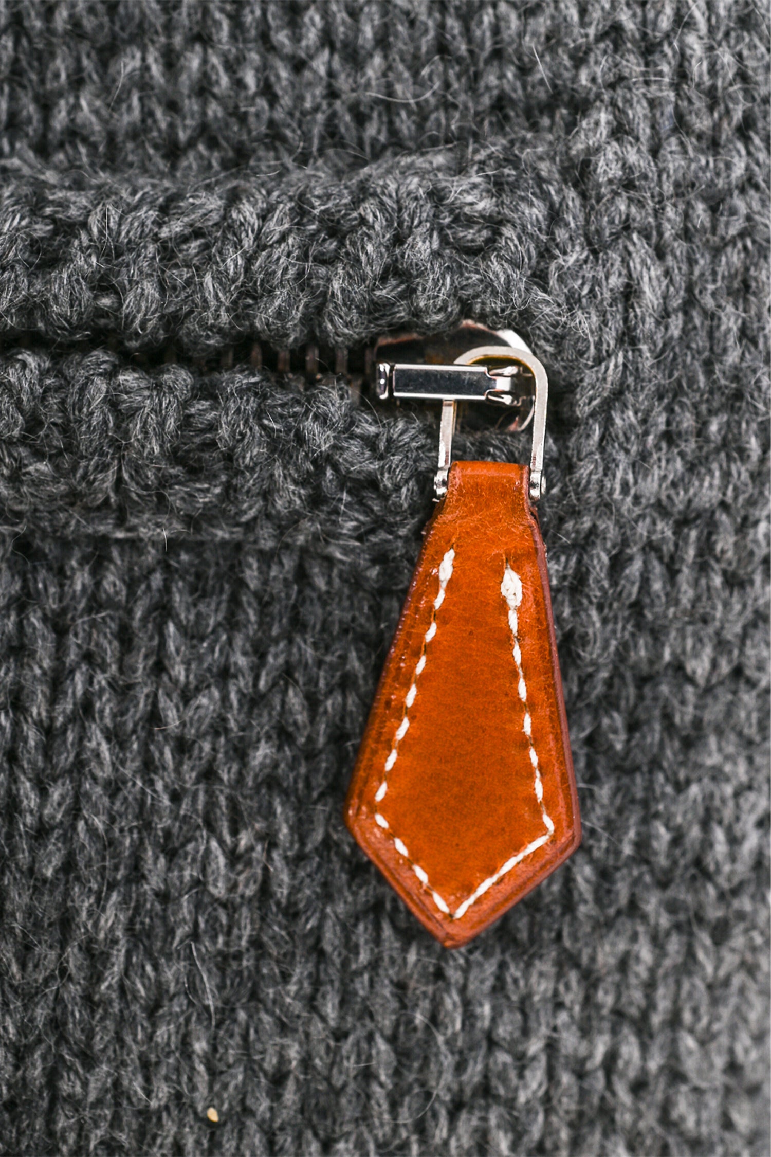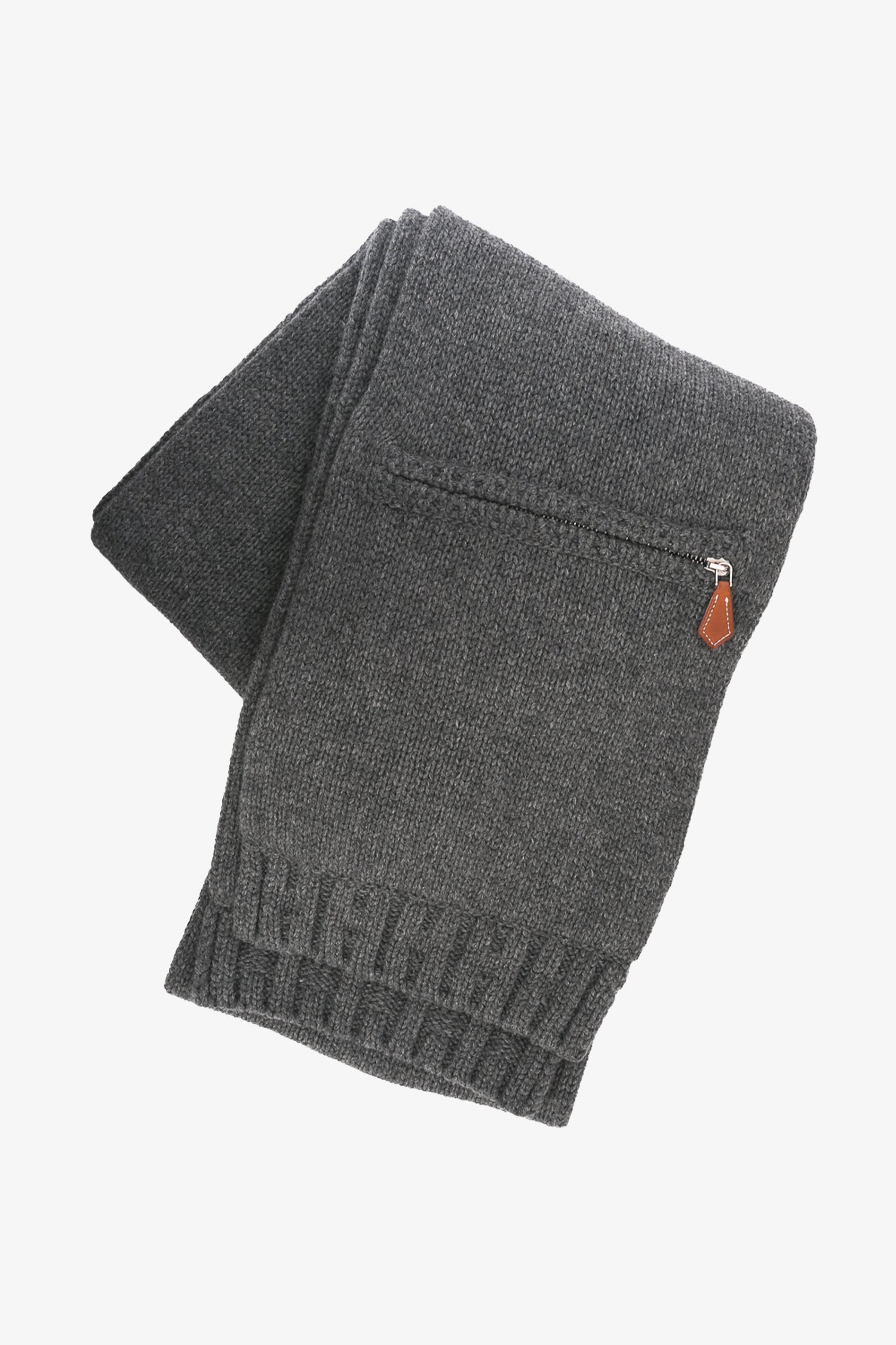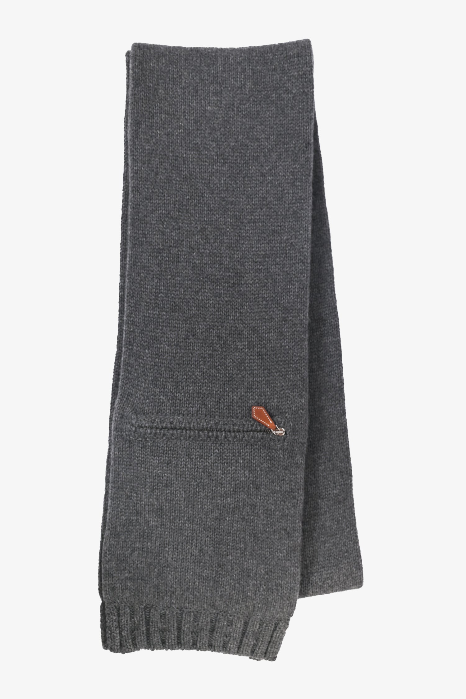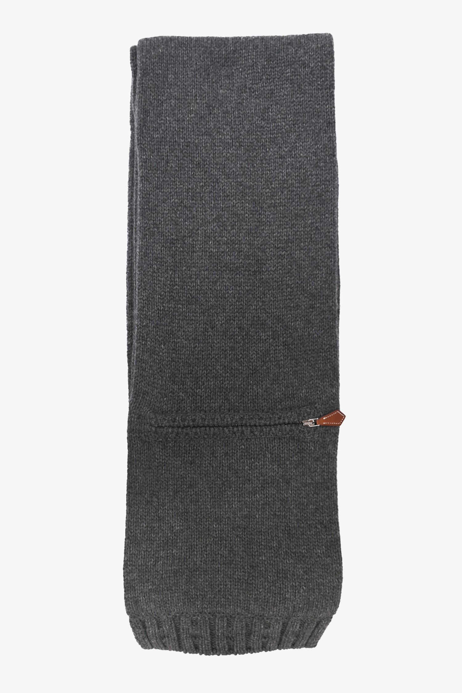 Refresh availabilityHermès Grey Cashmere Zip Pocket Detail Scarf. Zip pocket with brown leather pull tab. Ribbed ends. Silver-tone hardware.