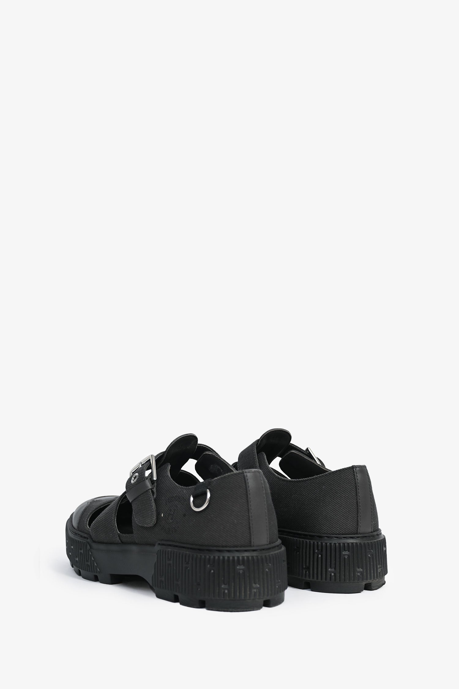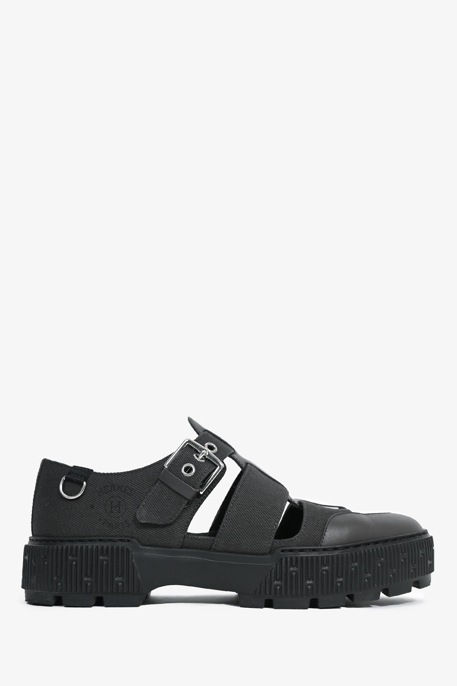 Refresh availabilityHermès Grey Leather/Canvas Fisherman Shoe. Almond toe. Side buckle closure. Silver-tone hardware. Tonal stitching.