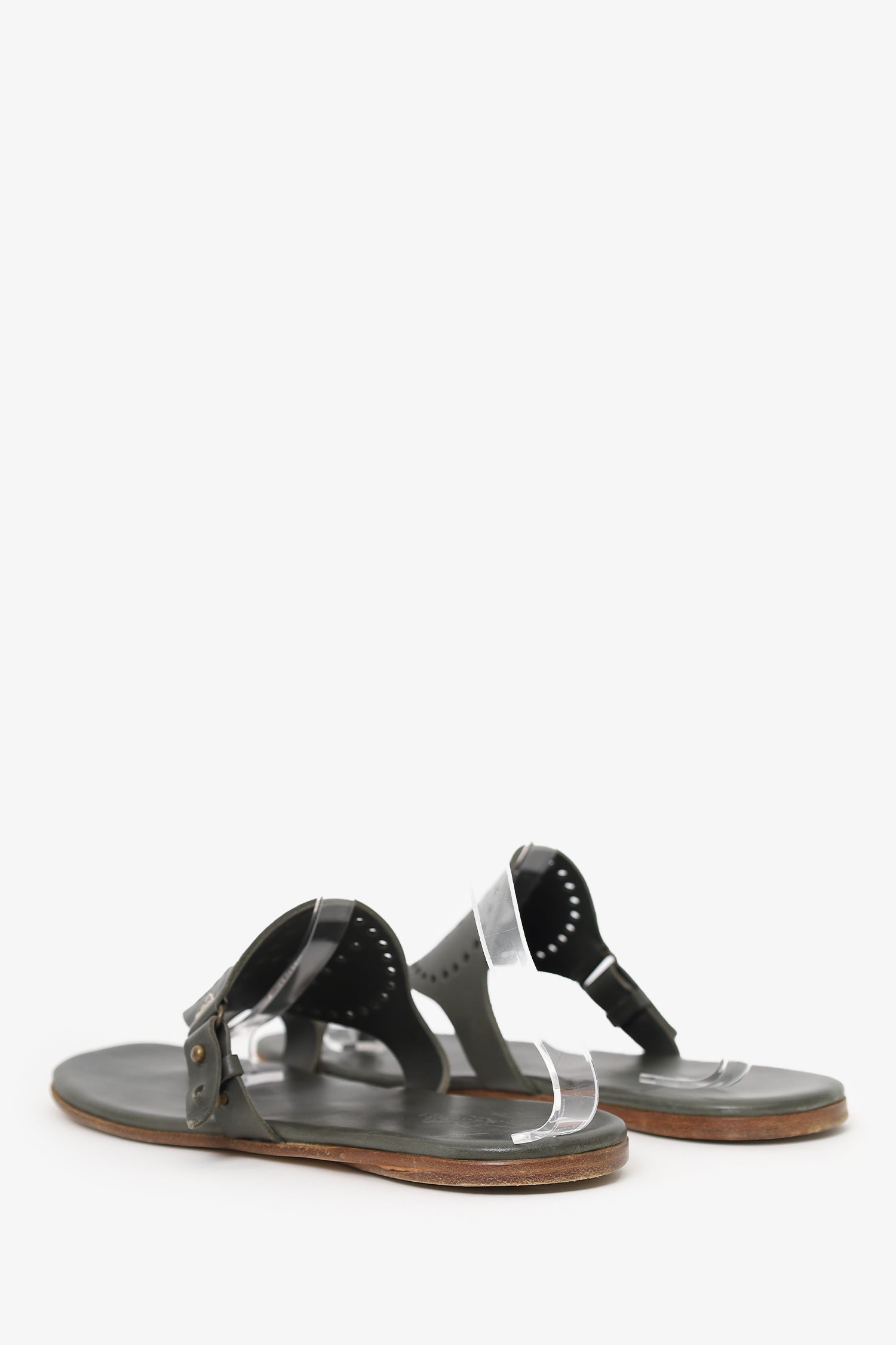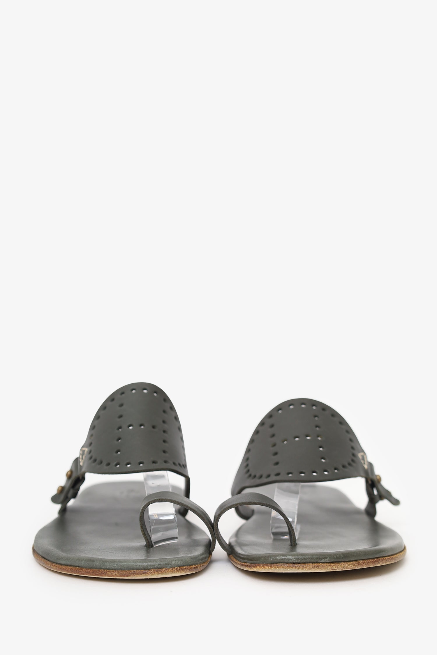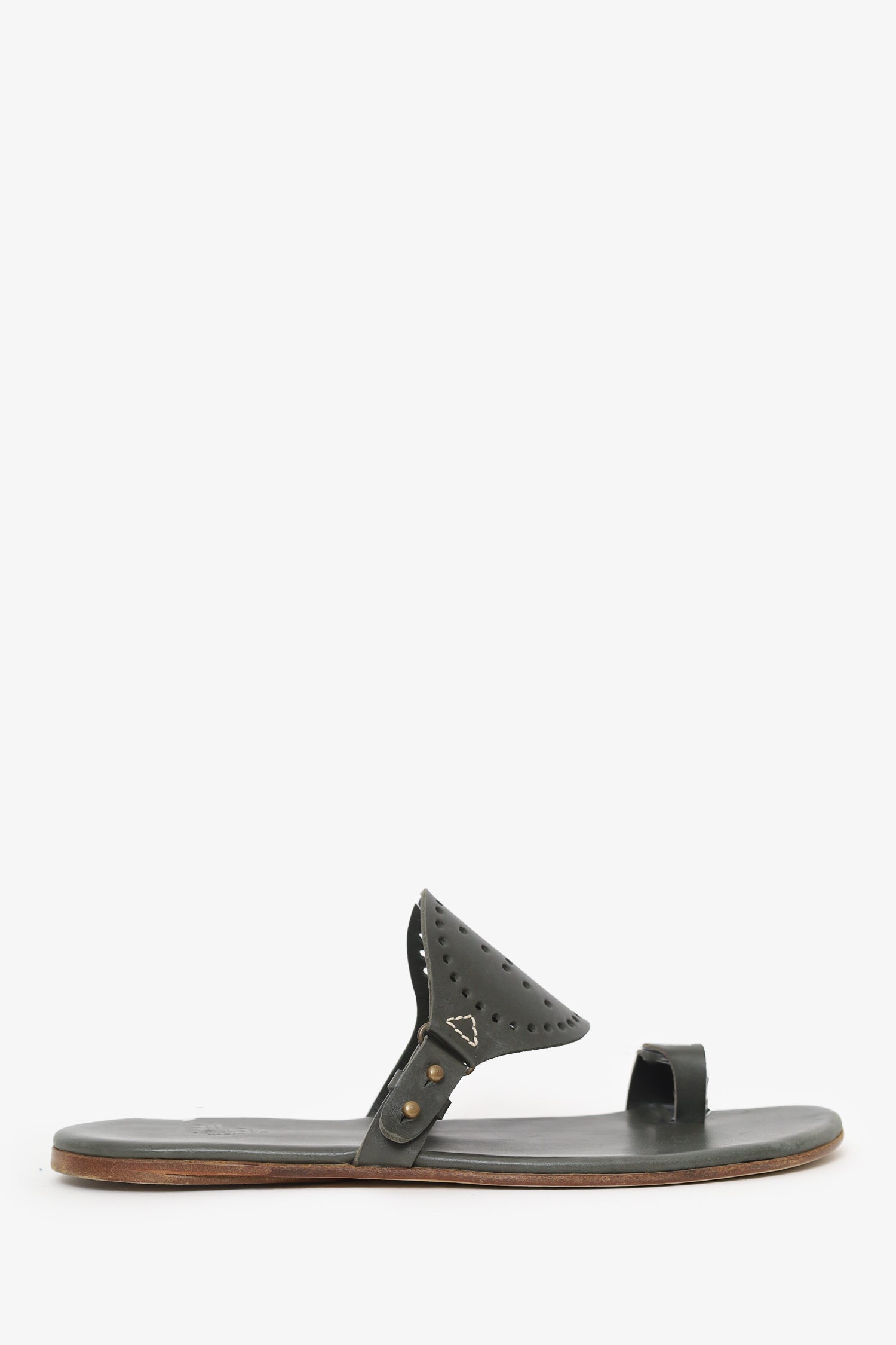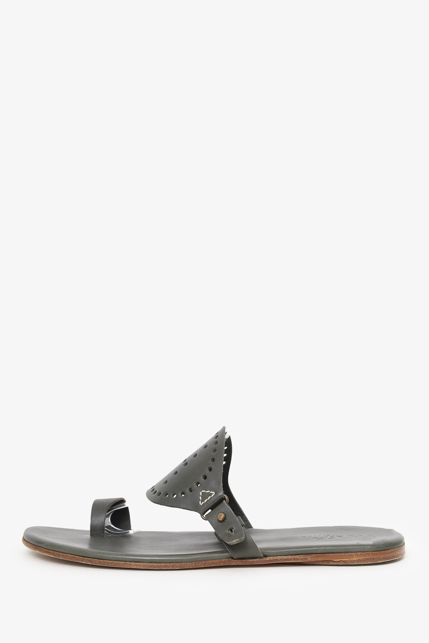 Refresh availabilityHermès Olive Leather Hera Sandals. Slip-on. Open-round toe with toe loop. Perforated vamp with adjustable push-pin closure. Tonal stitching.