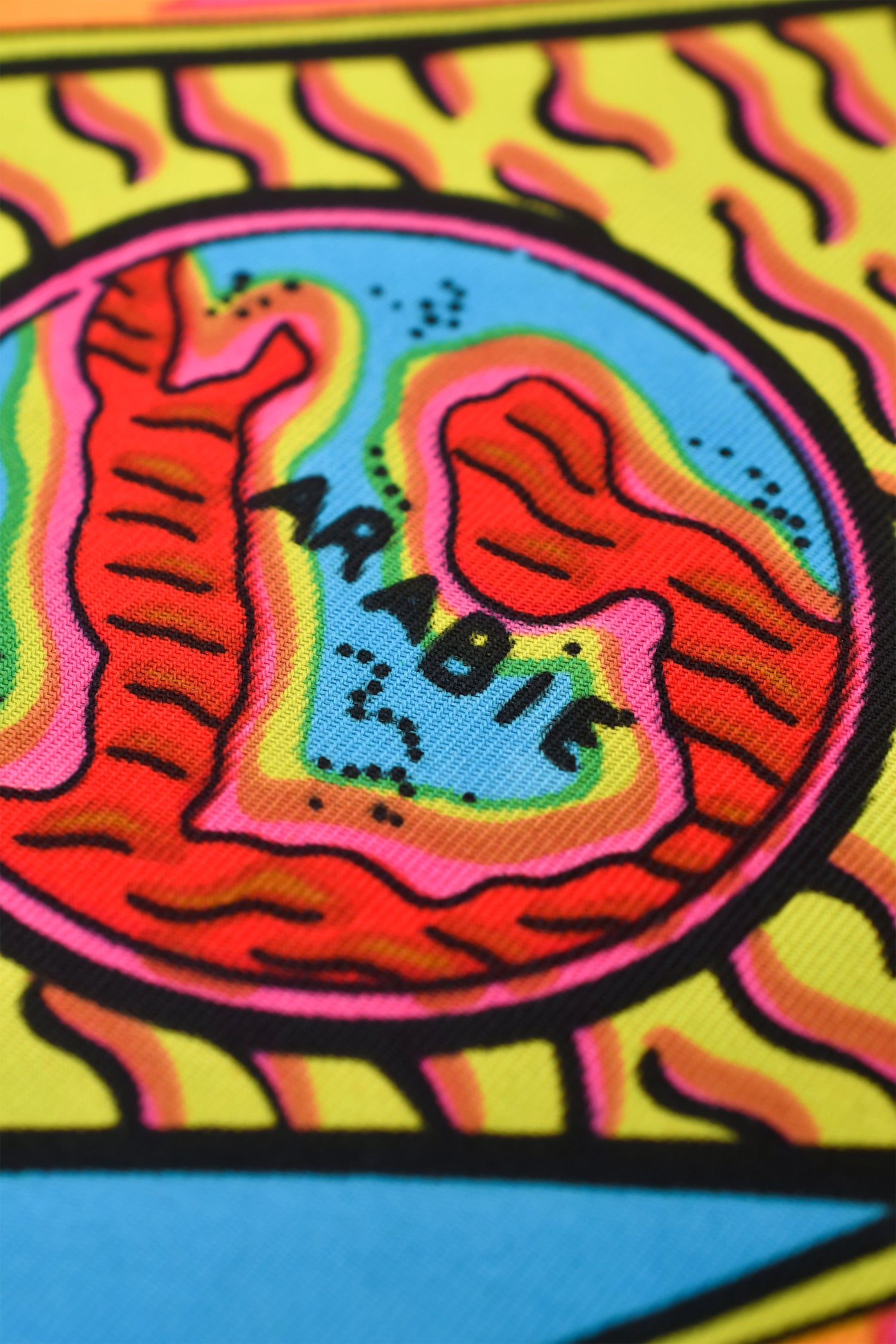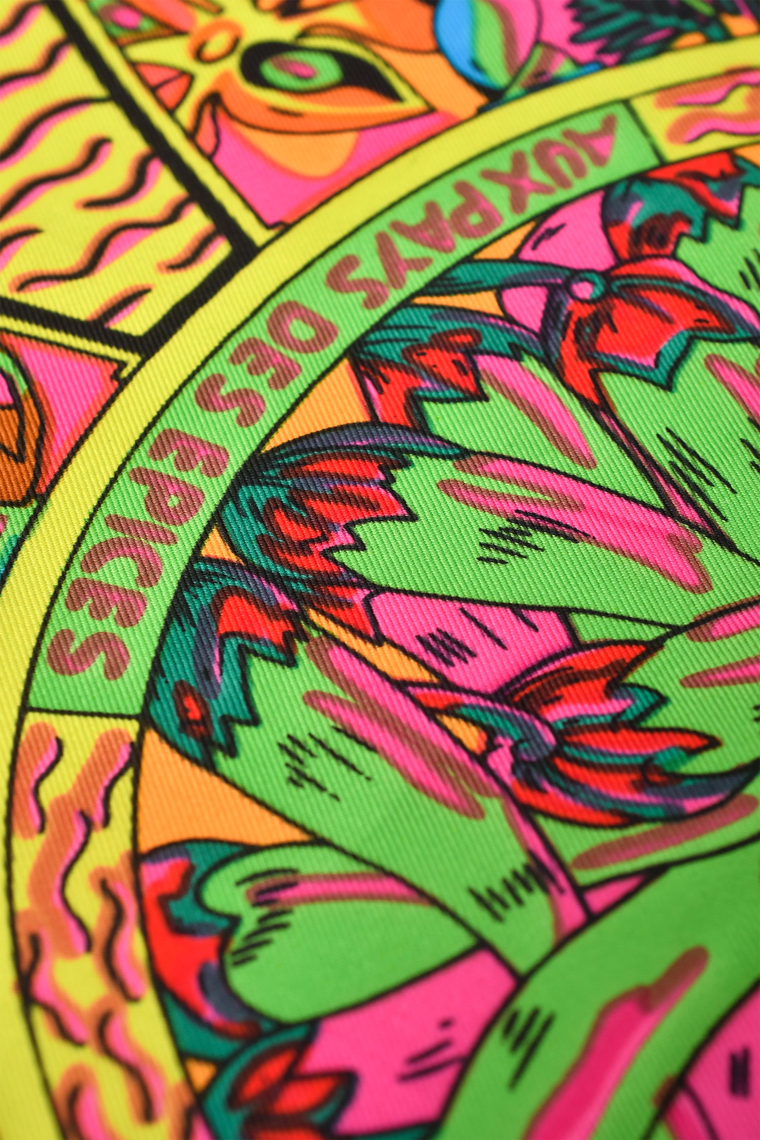 Refresh availabilityHermès Pink/Blue/Green Silk 'Aux Pays Des Epices' Carre 140. Tonal stitching.