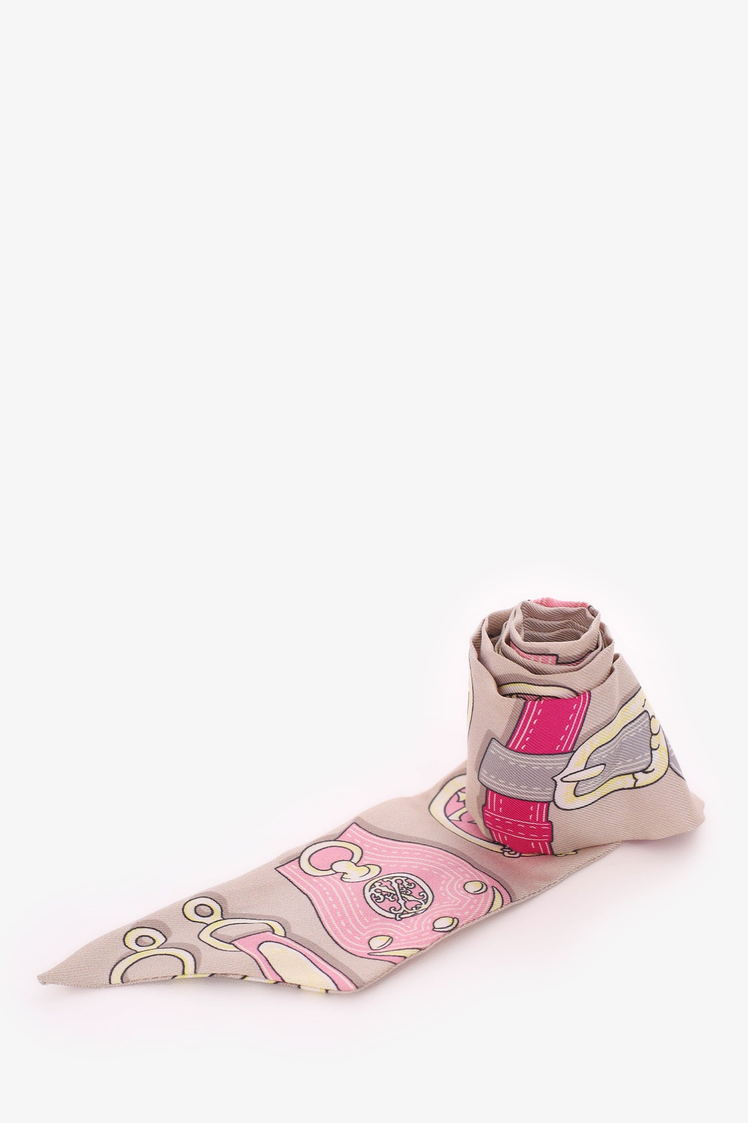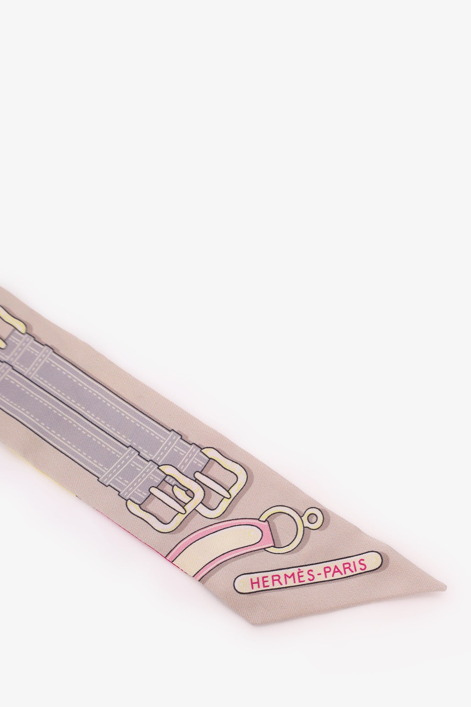 Refresh availabilityHermès Pink/Blue Silk Buckle Print Twilly. Tonal stitching.