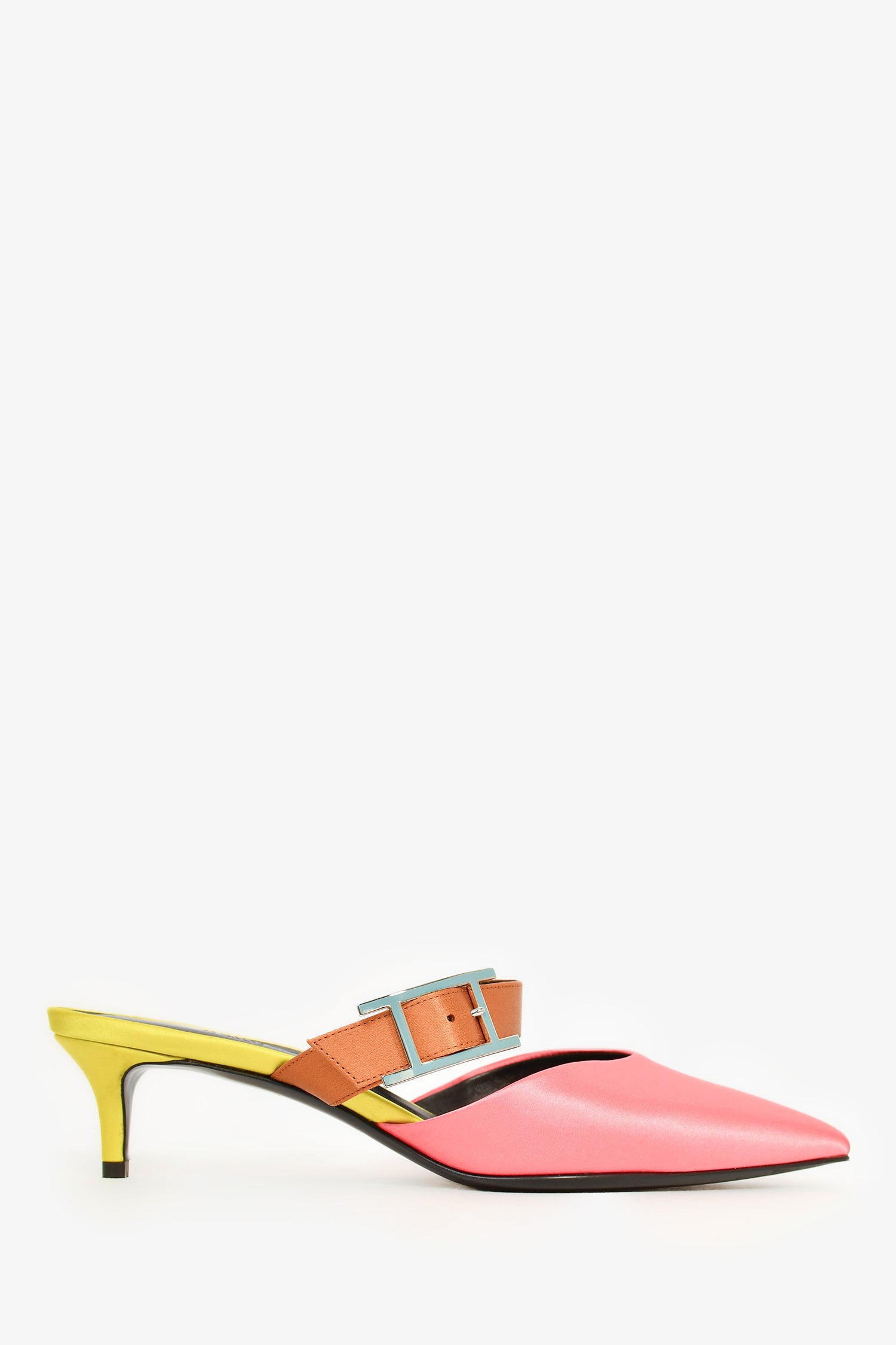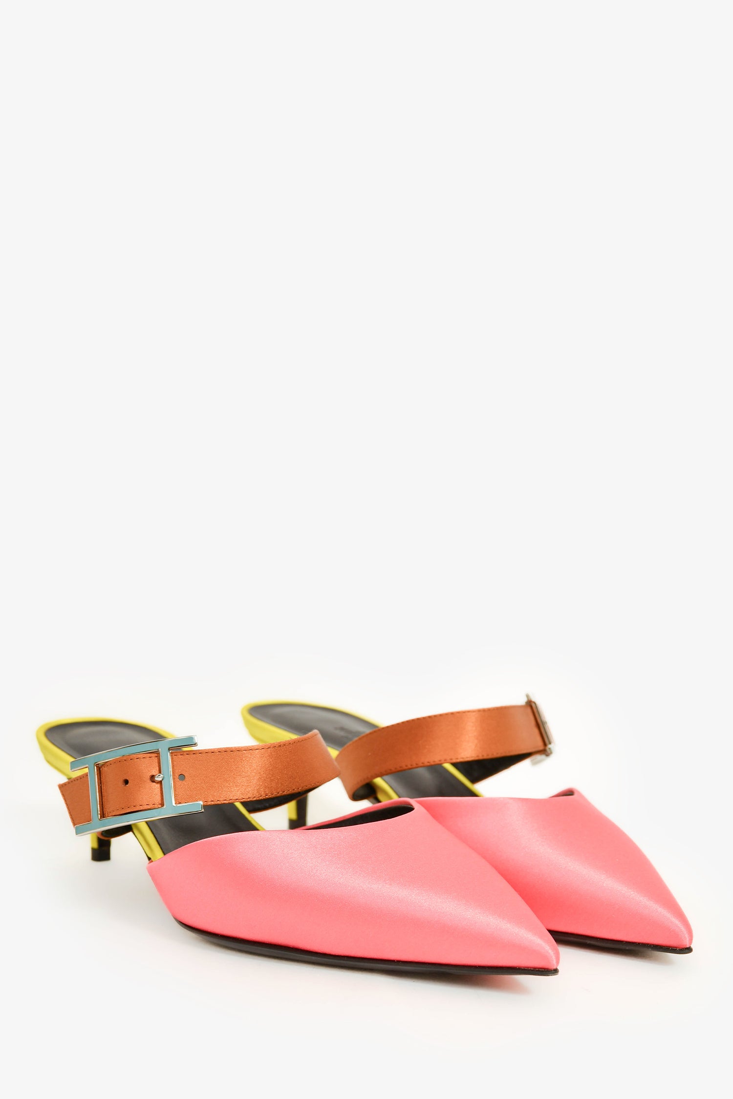 Refresh availabilityHermès Pink/Yellow/Brown Satin Pointed Kitten Heels. Pointed toe. Leather insole. Satin strap with pin buckle. Kitten heel. Tonal stitching.