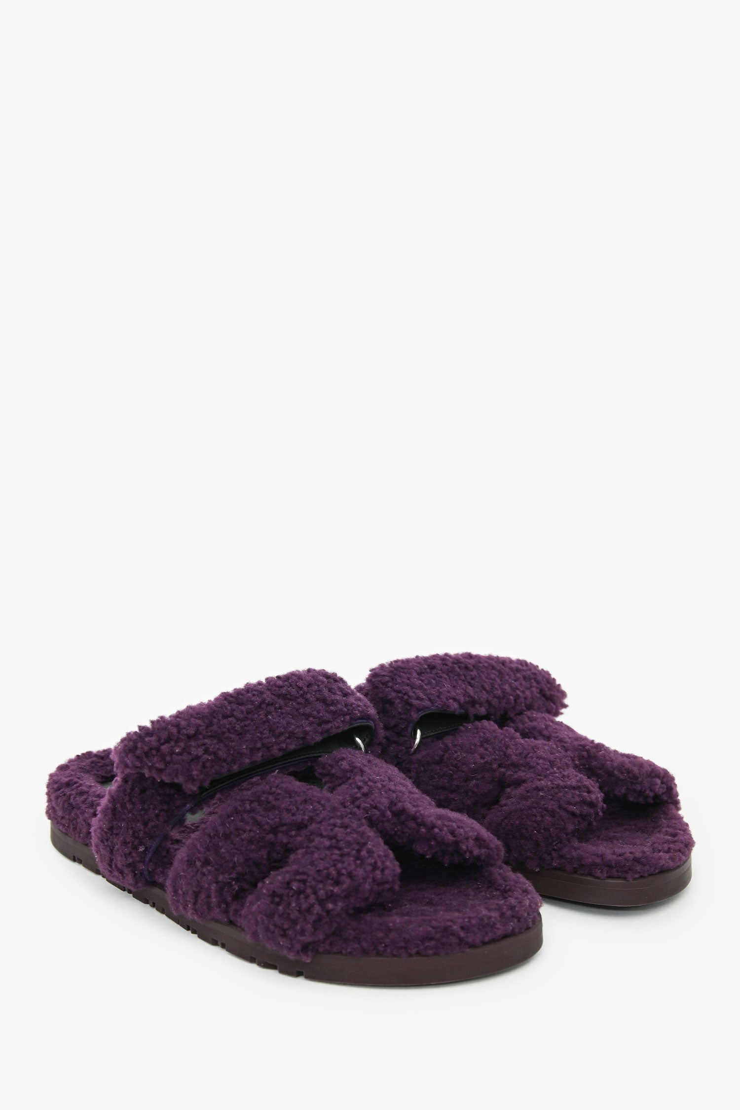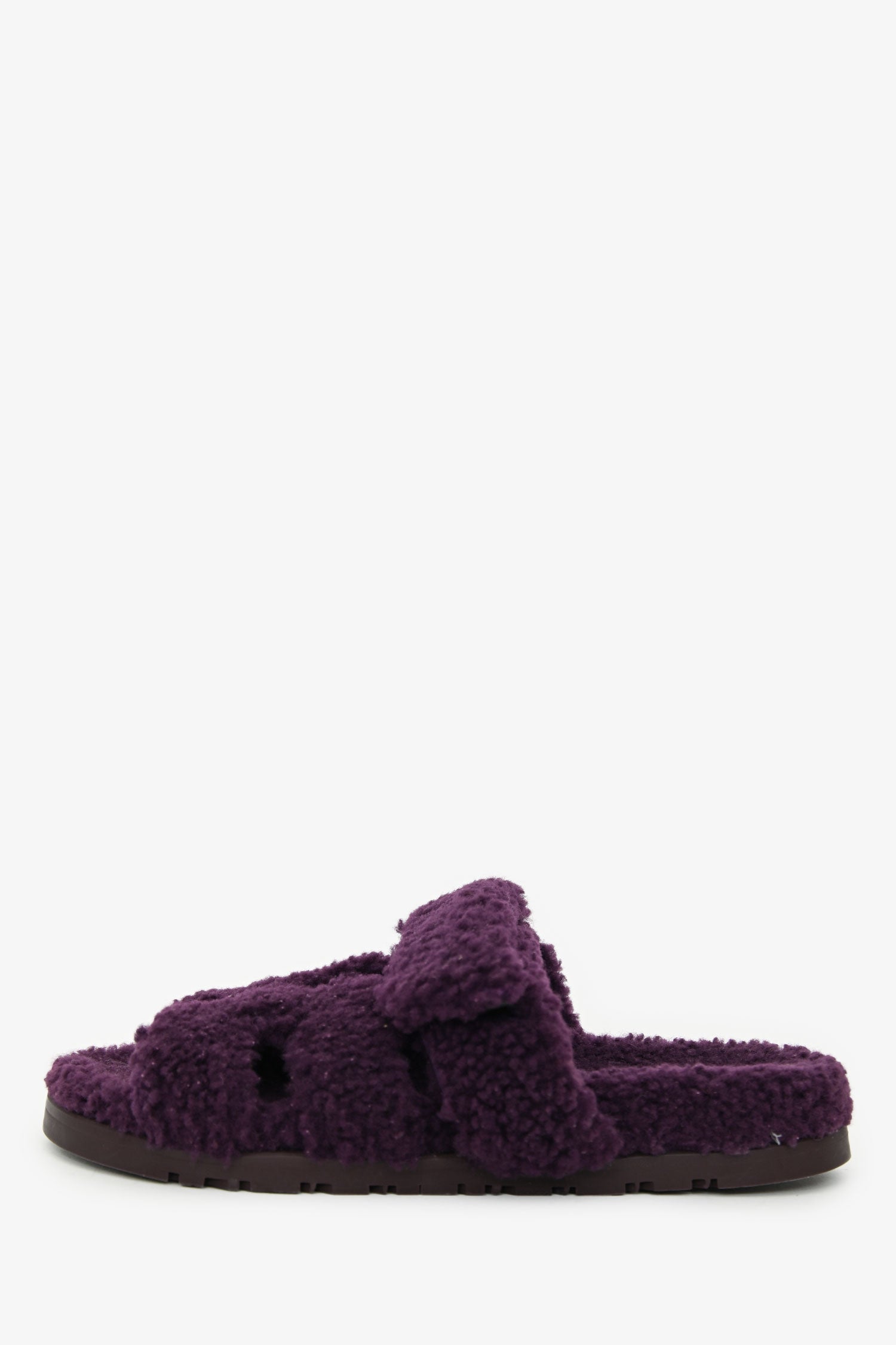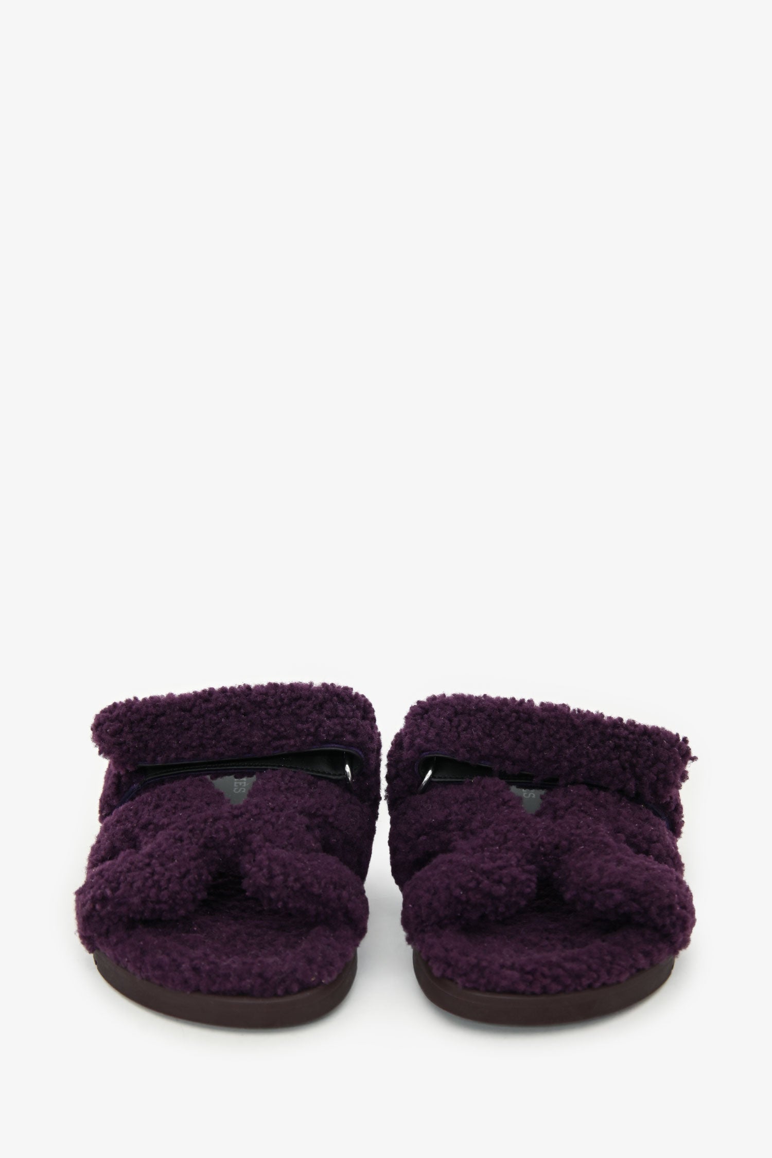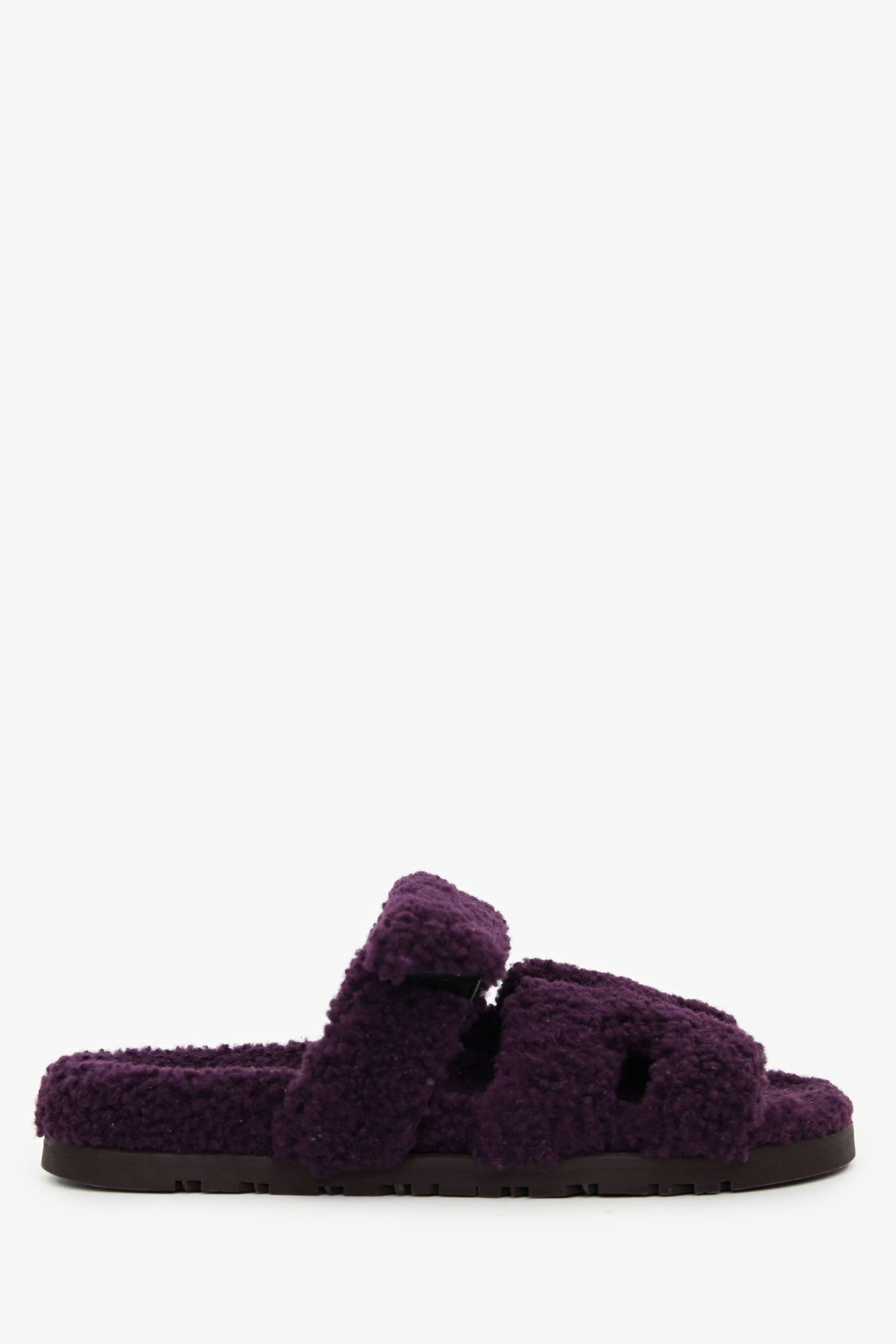 Refresh availabilityHermès Purple Shearling Leather Chypre Sandals. Slip-on. Round toe. Shearling velcro strap. Rubber soles. Tonal stitching.