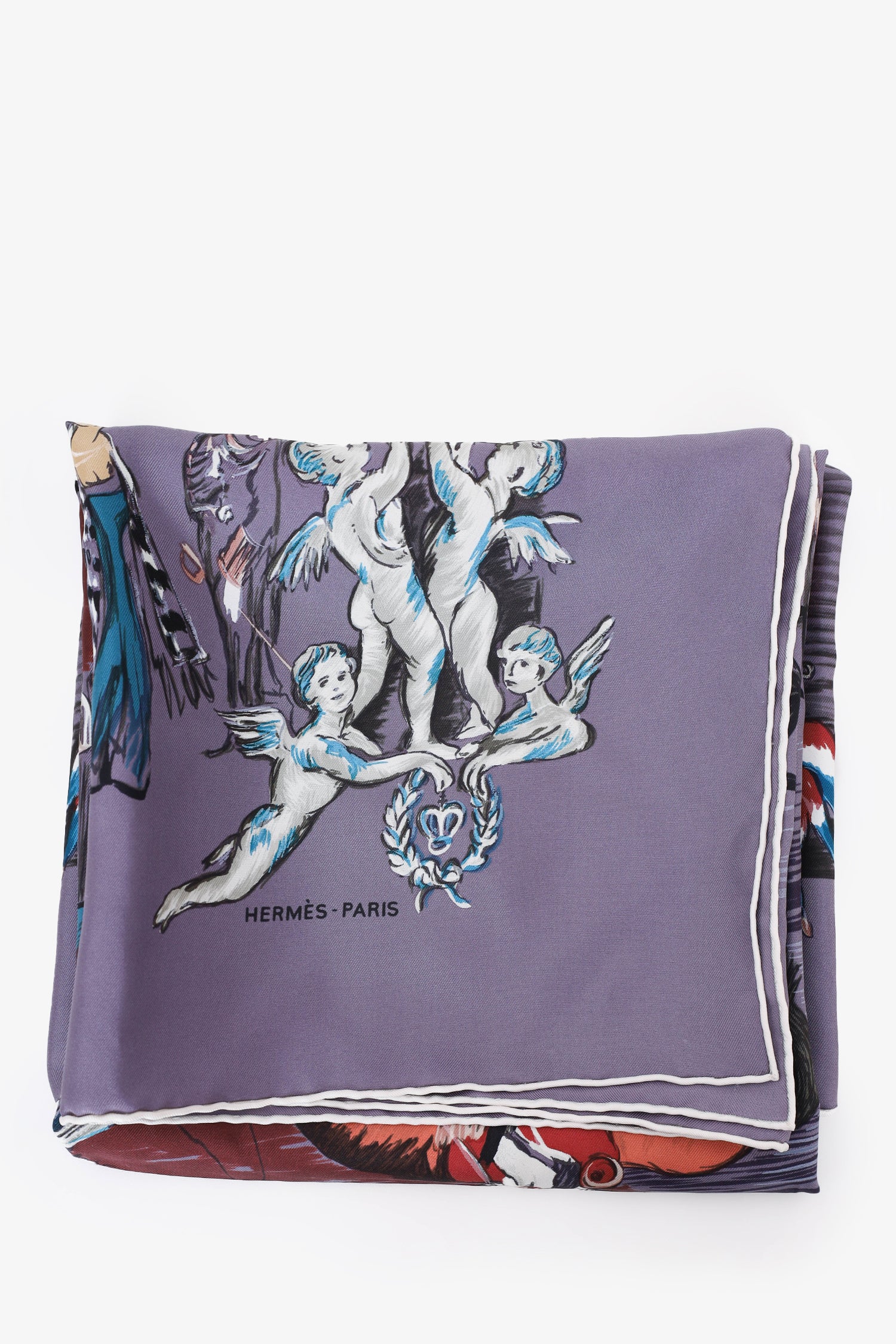 Refresh availabilityHermès Purple Silk Horse Clerc Print Scarf. Contrast trim. Tonal stitching.