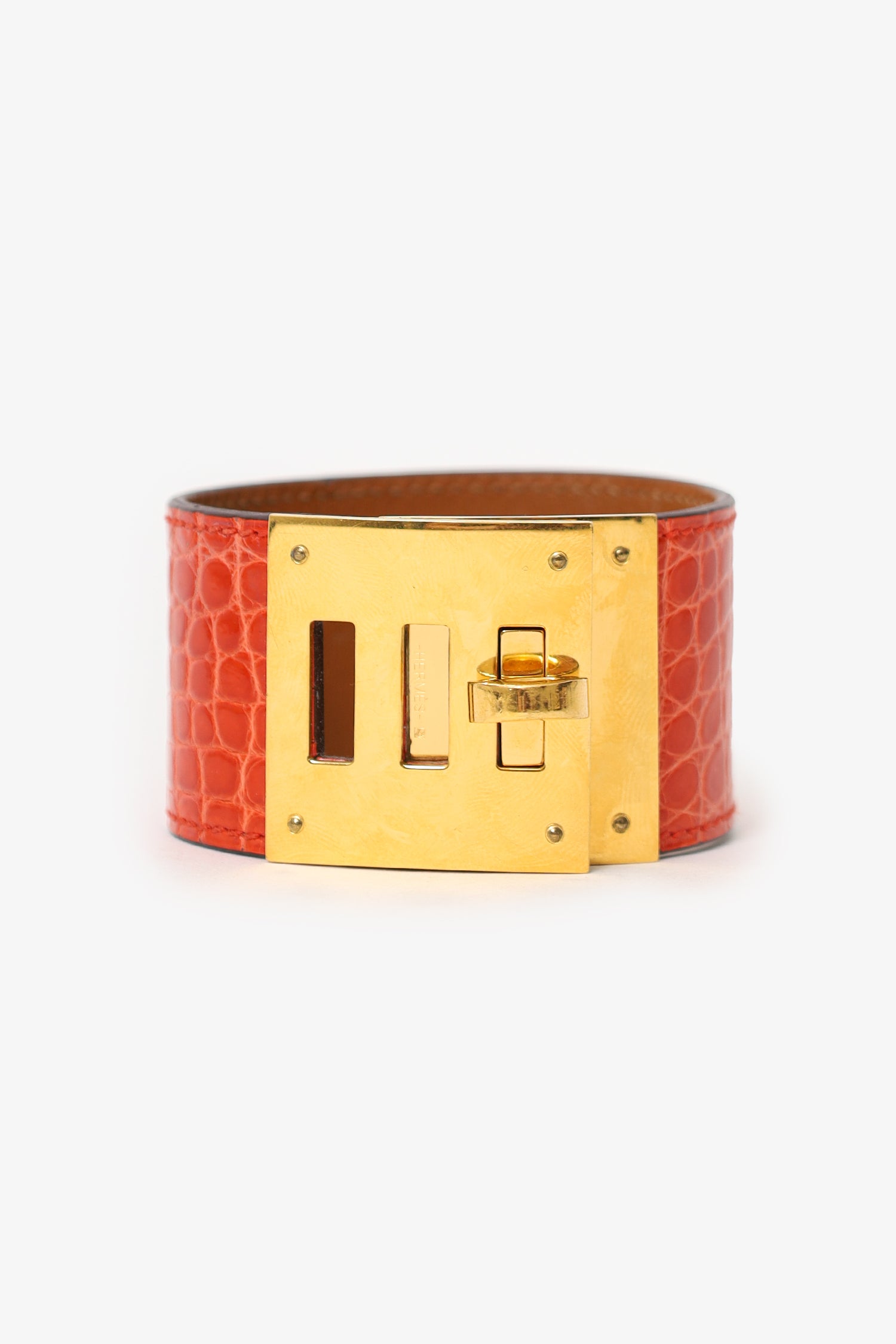Refresh availabilityHermes Red Crocodile Leather Gold Plated Kelly Dog Bracelet. Adjustable front turn-lock closure. Lined interior. Gold-tone hardware. Tonal stitching.
