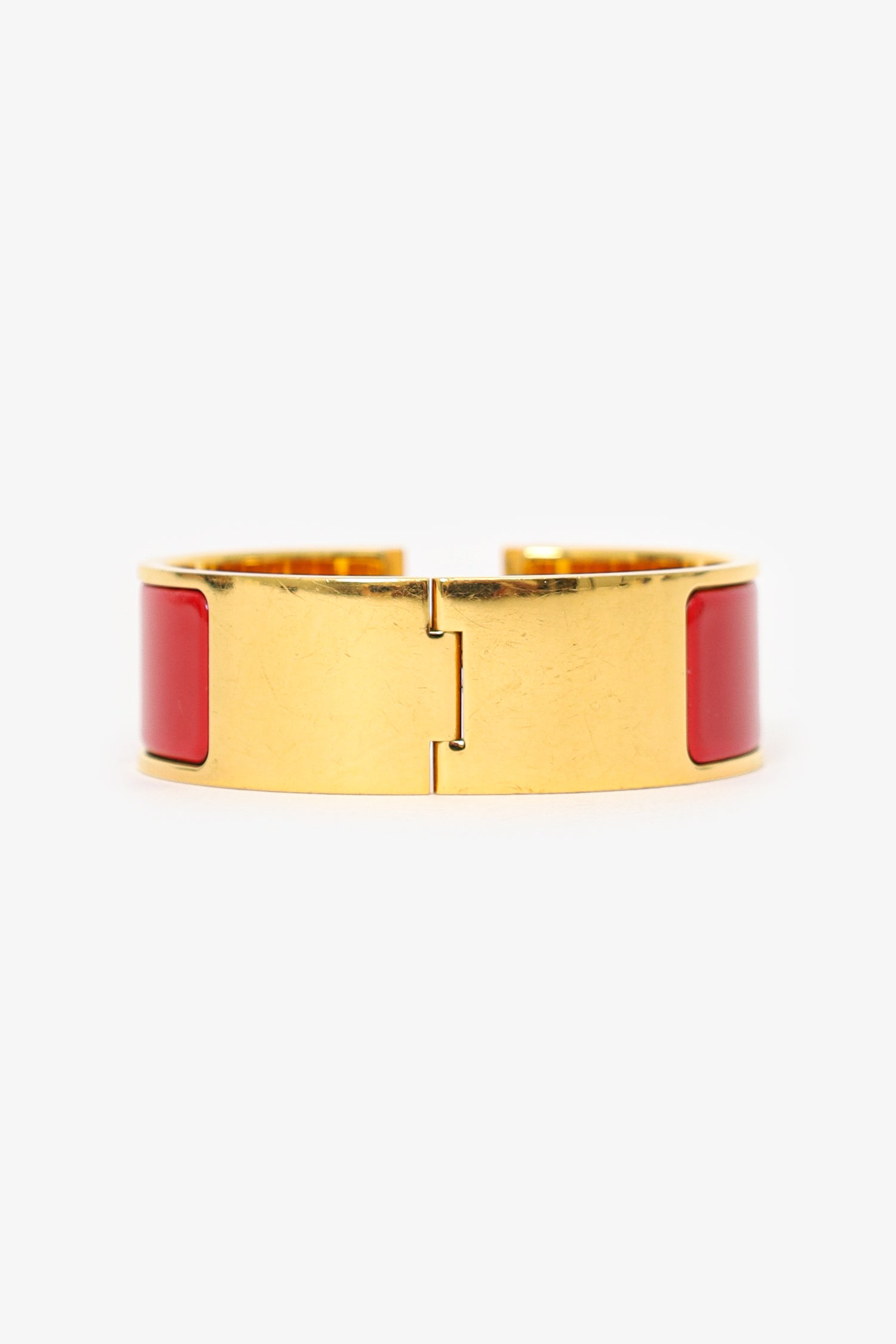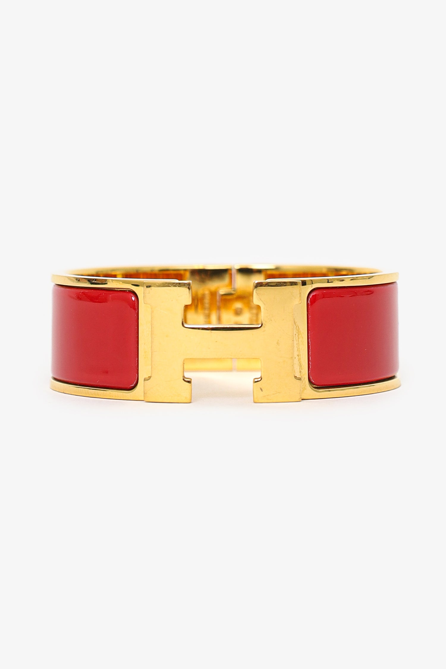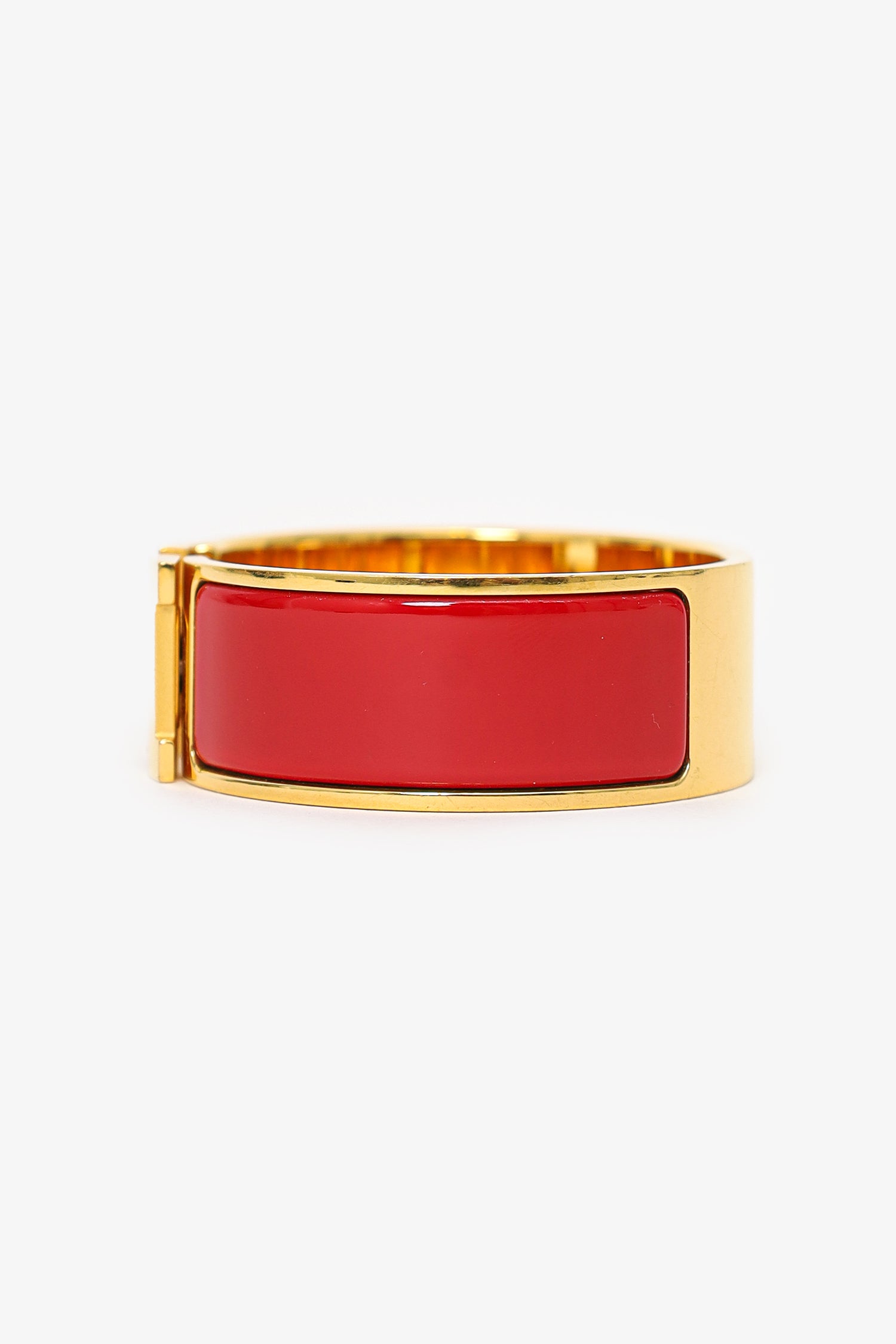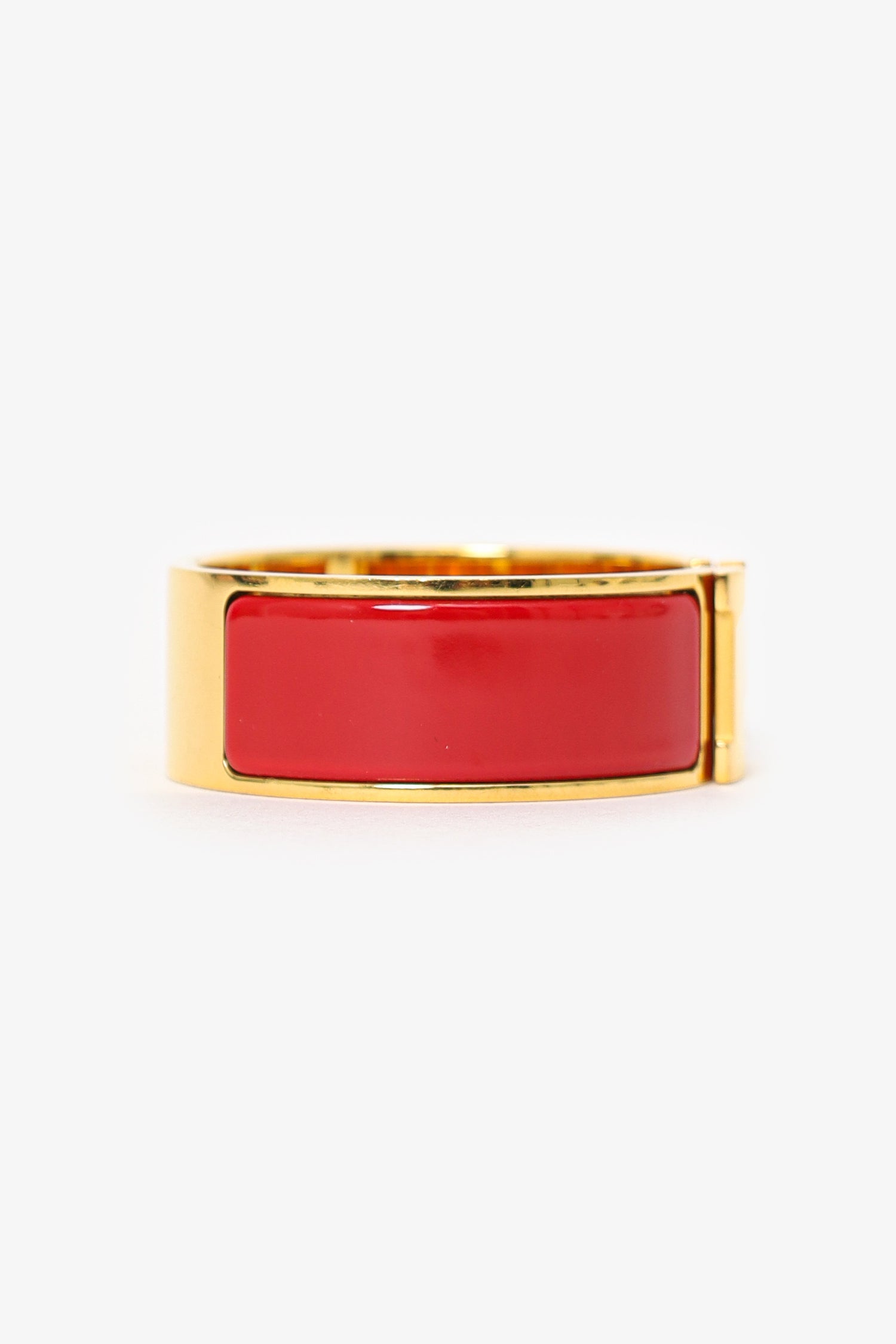 Refresh availabilityHermès Red Enamel/Gold Toned Metal Clic Clac Bracelet. Front flip-lock closure. Gold-tone hardware.
