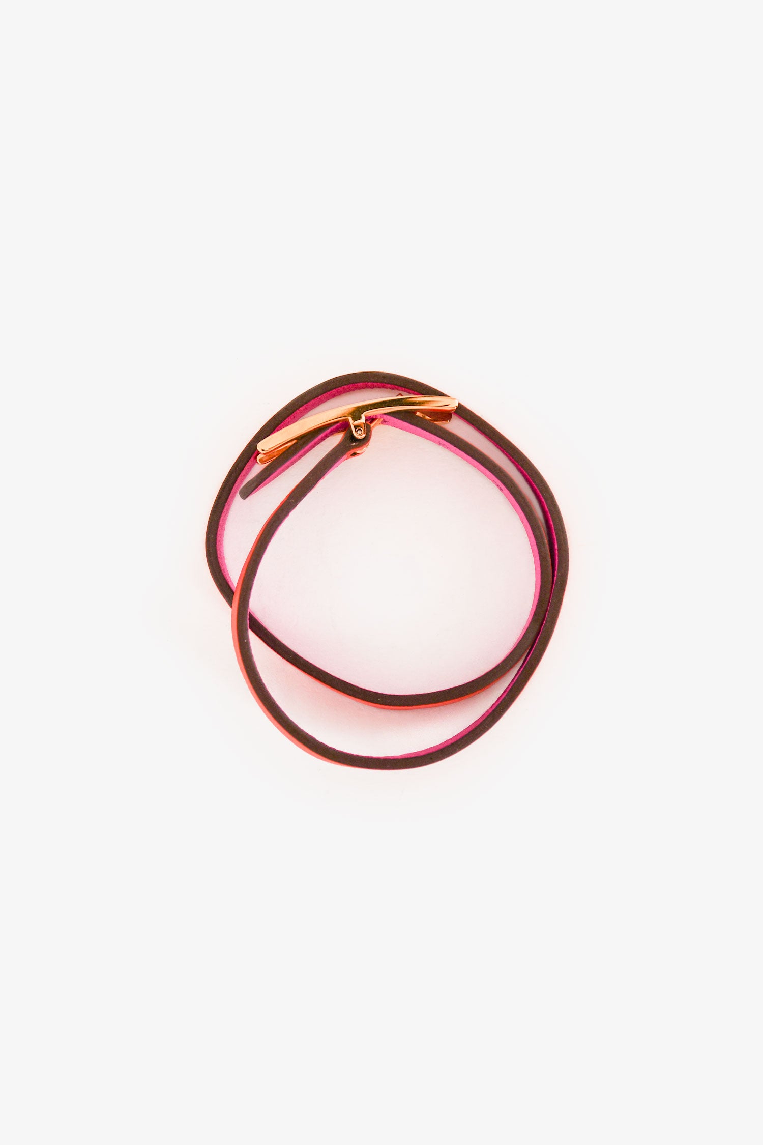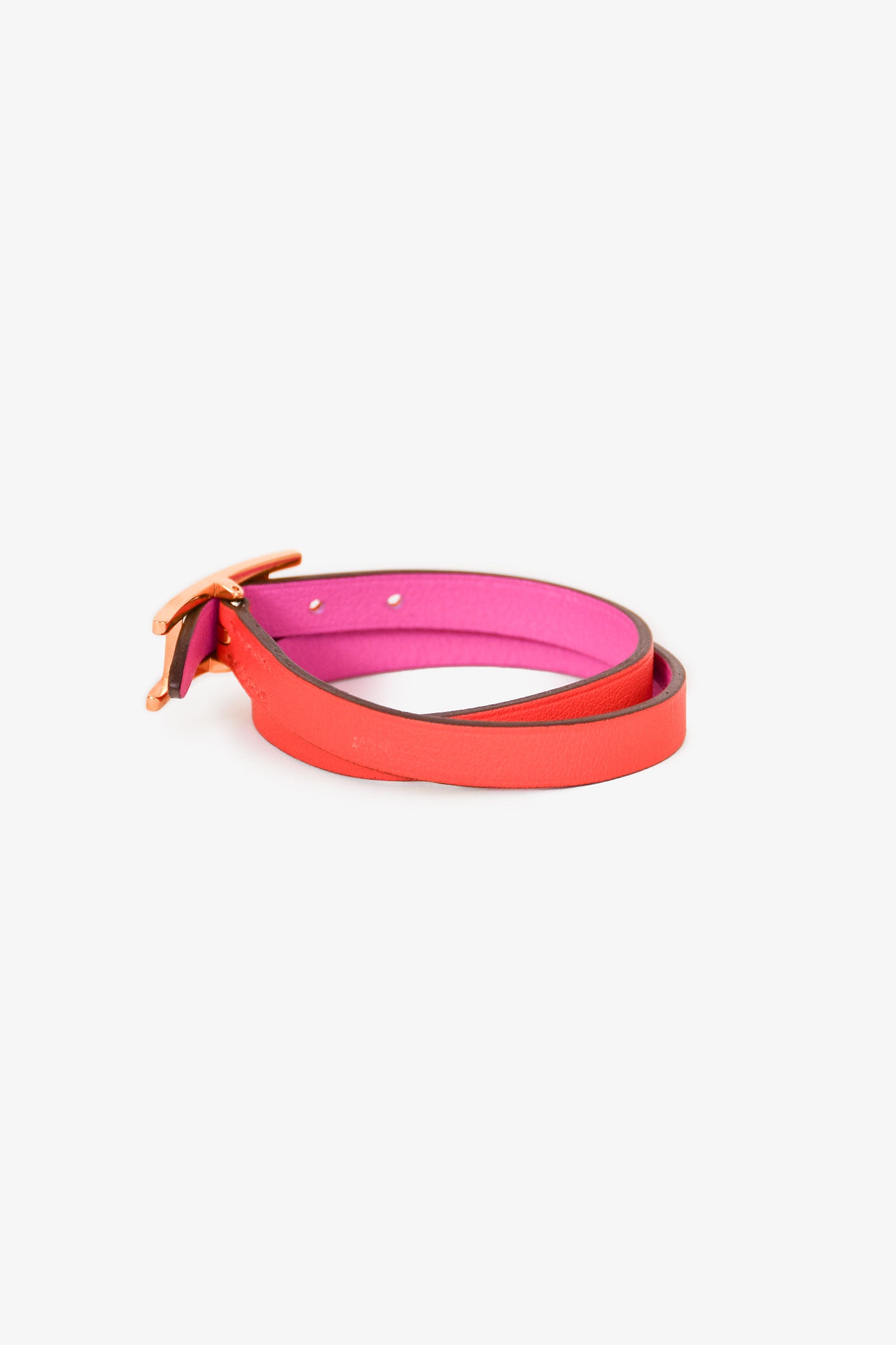 Refresh availabilityHermès Red/Pink Swift Leather Behapi Double Tour Bracelet. Gold-tone hardware. Coated trimming. Tonal stitching.