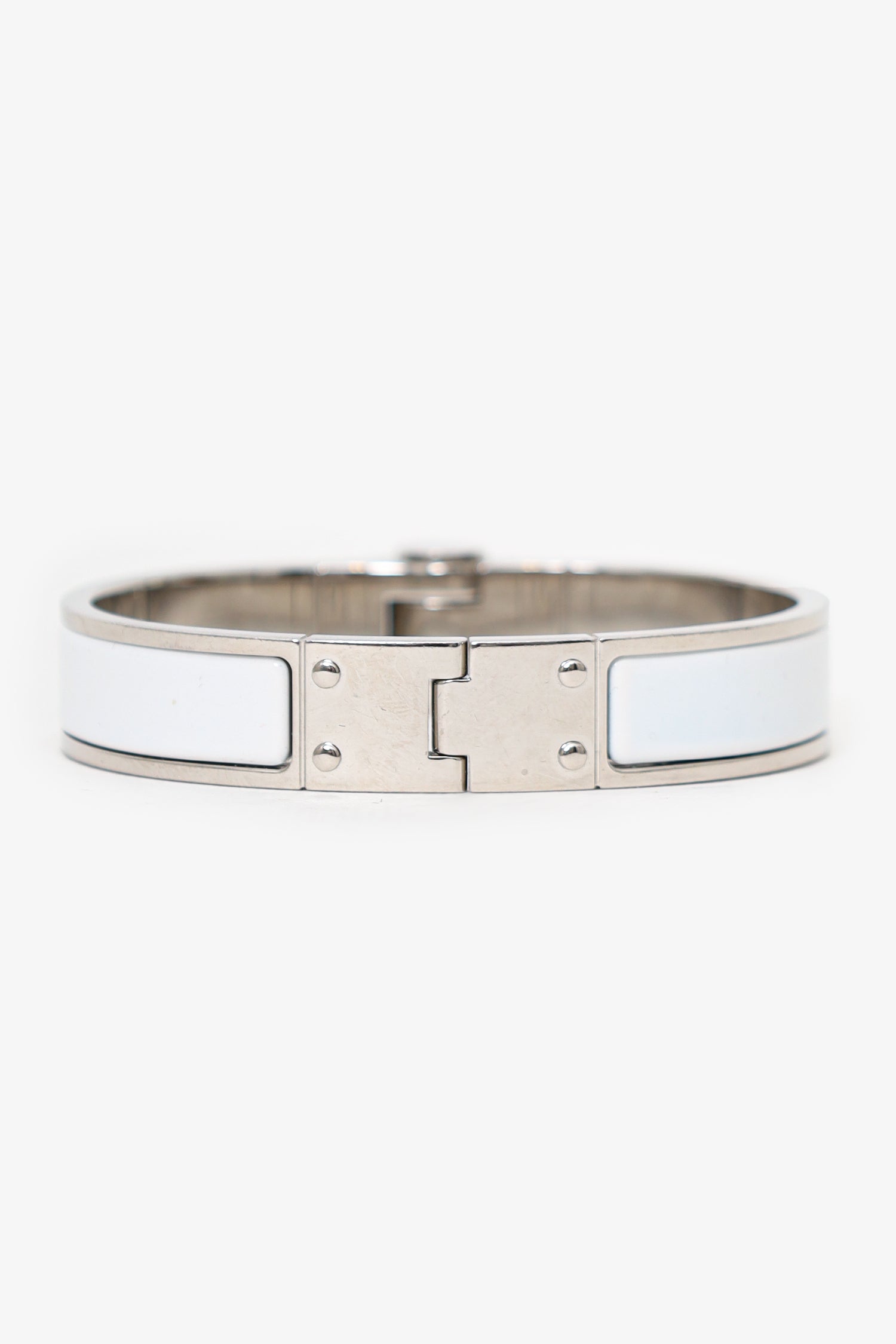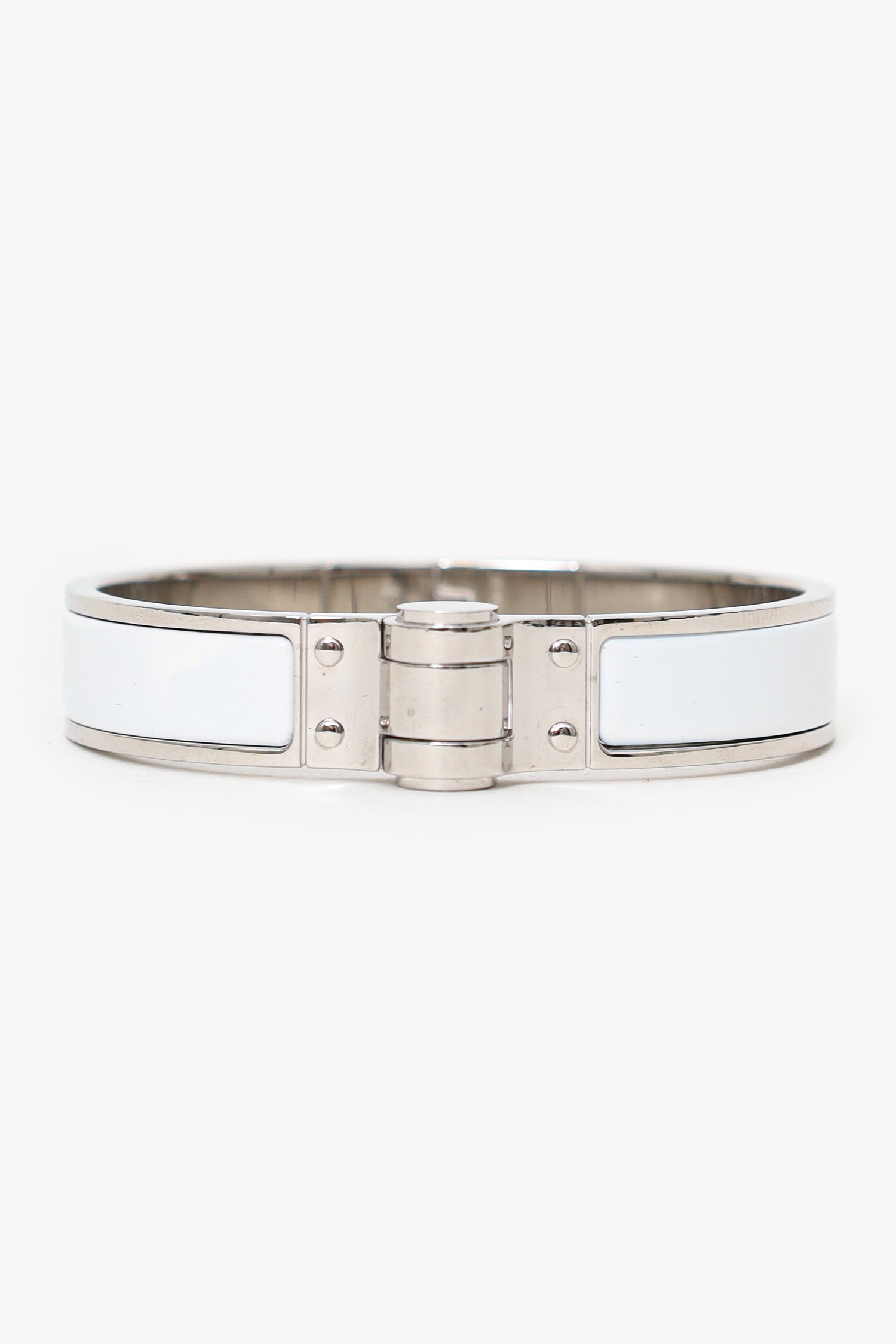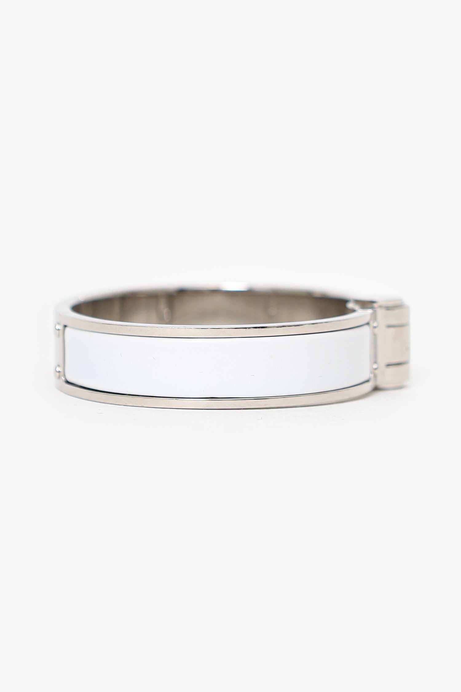 Refresh availabilityHermès Silver Toned/White Enamel Charnière Hinged Bracelet. Pinch-lock closure. Silver-tone hardware.