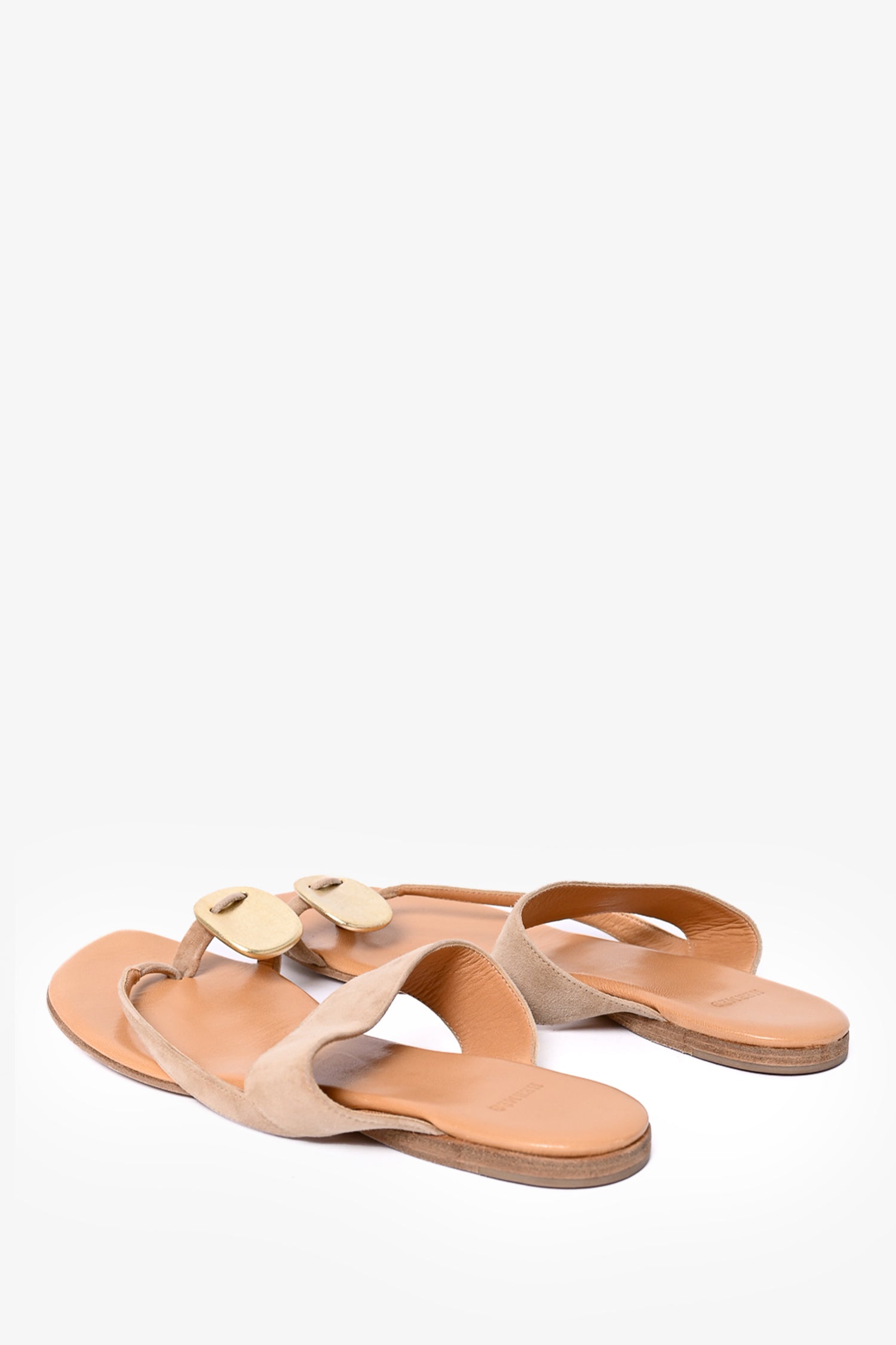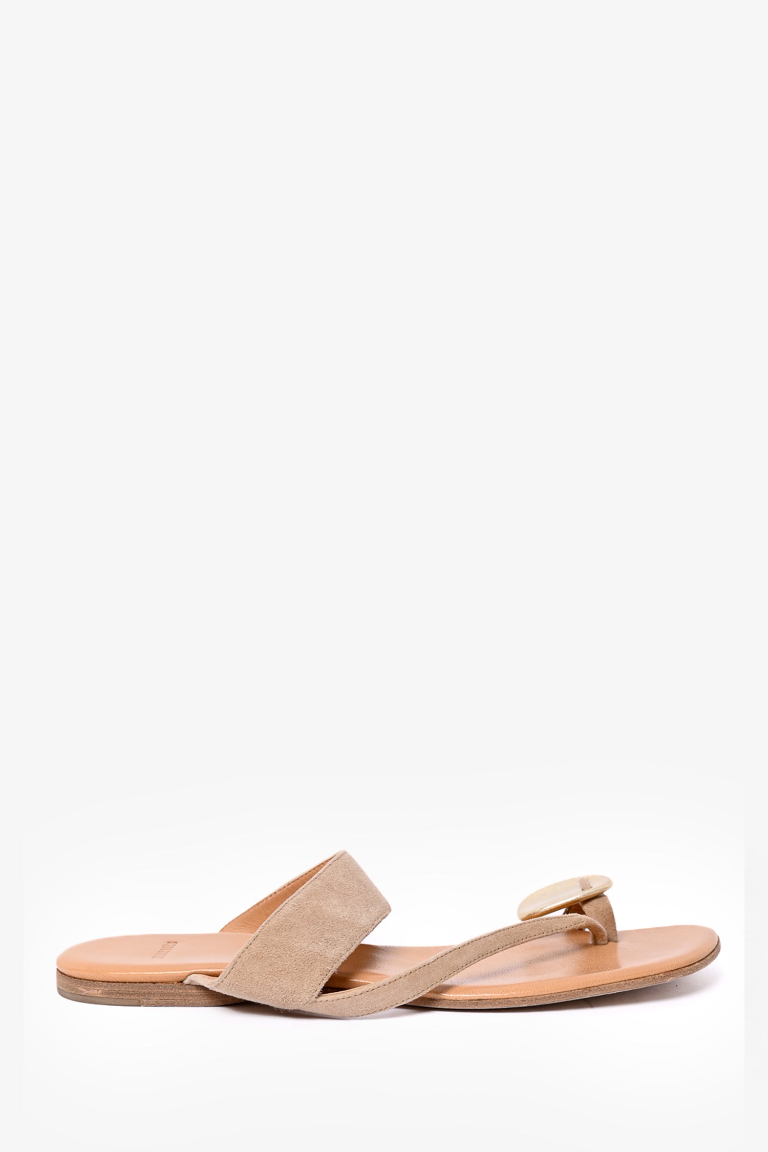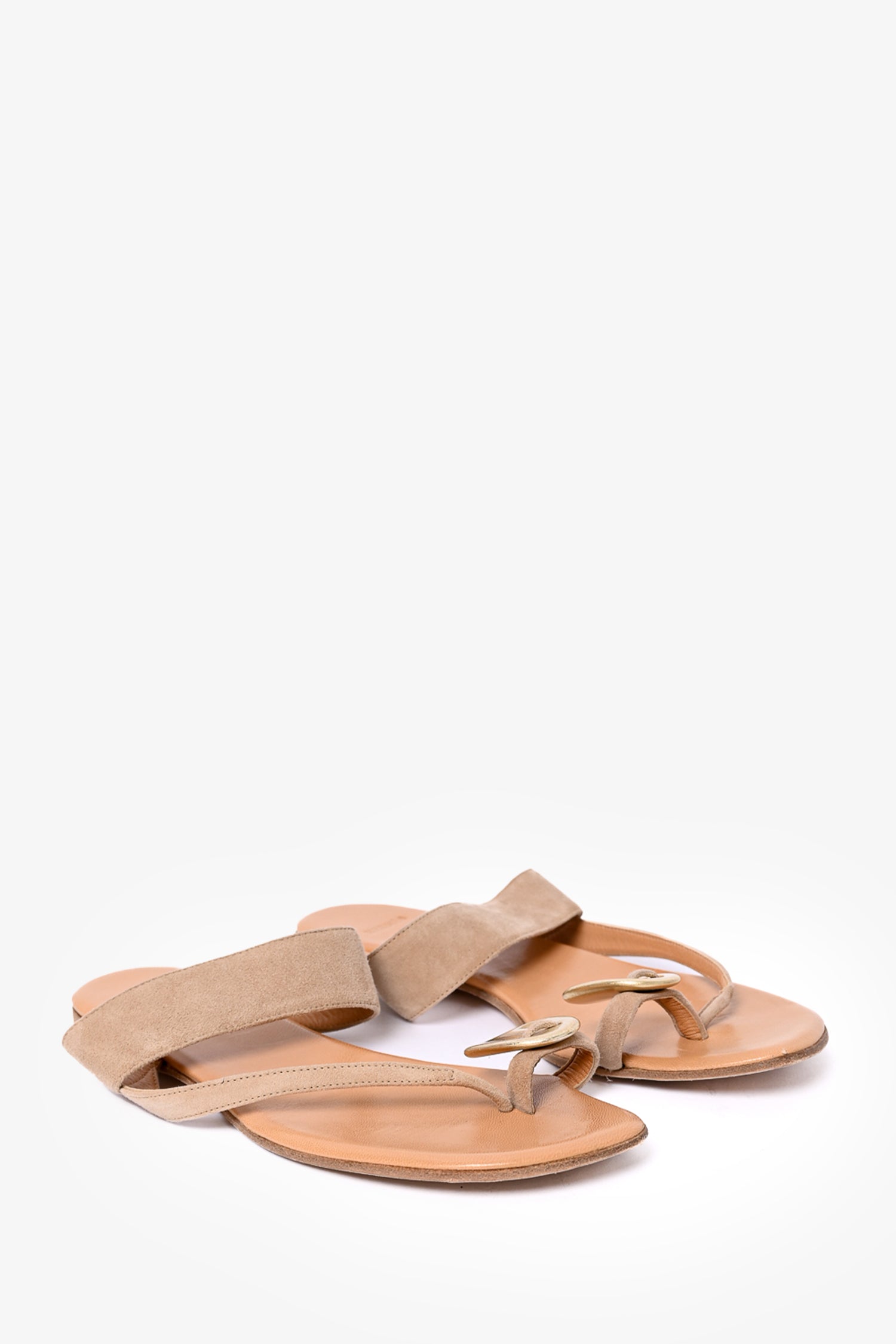 Refresh availabilityHermès Vintage Gold Taupe Suede Sandals. Tonal stitching. Suede taupe dual straps. Gold detail at toe loop.