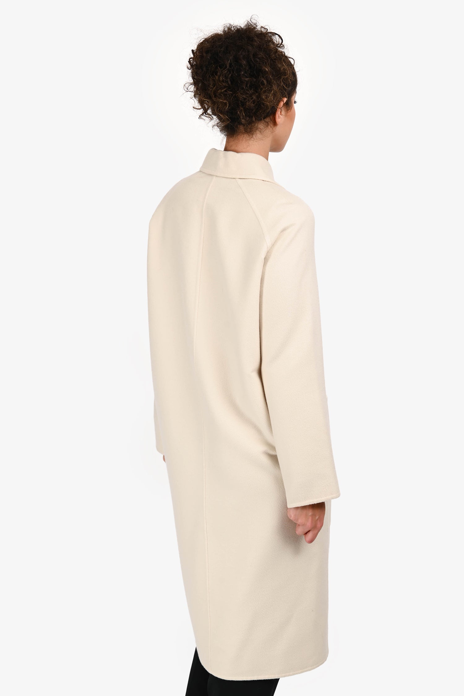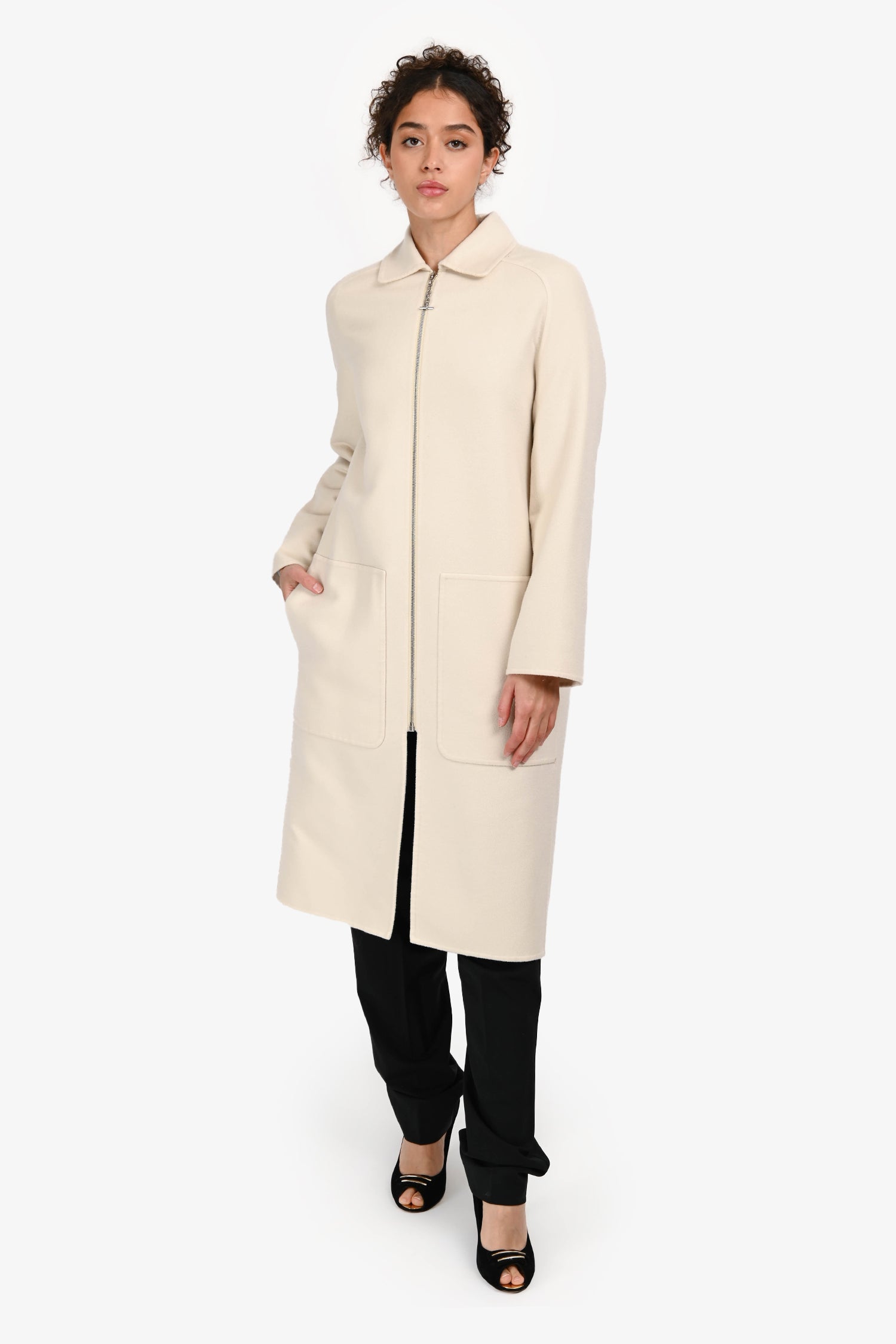 Refresh availabilityHermès White Cashmere Long Collared Coat. Slip-on. Front zip closure. 2 exterior slip pockets. Tonal stitching.