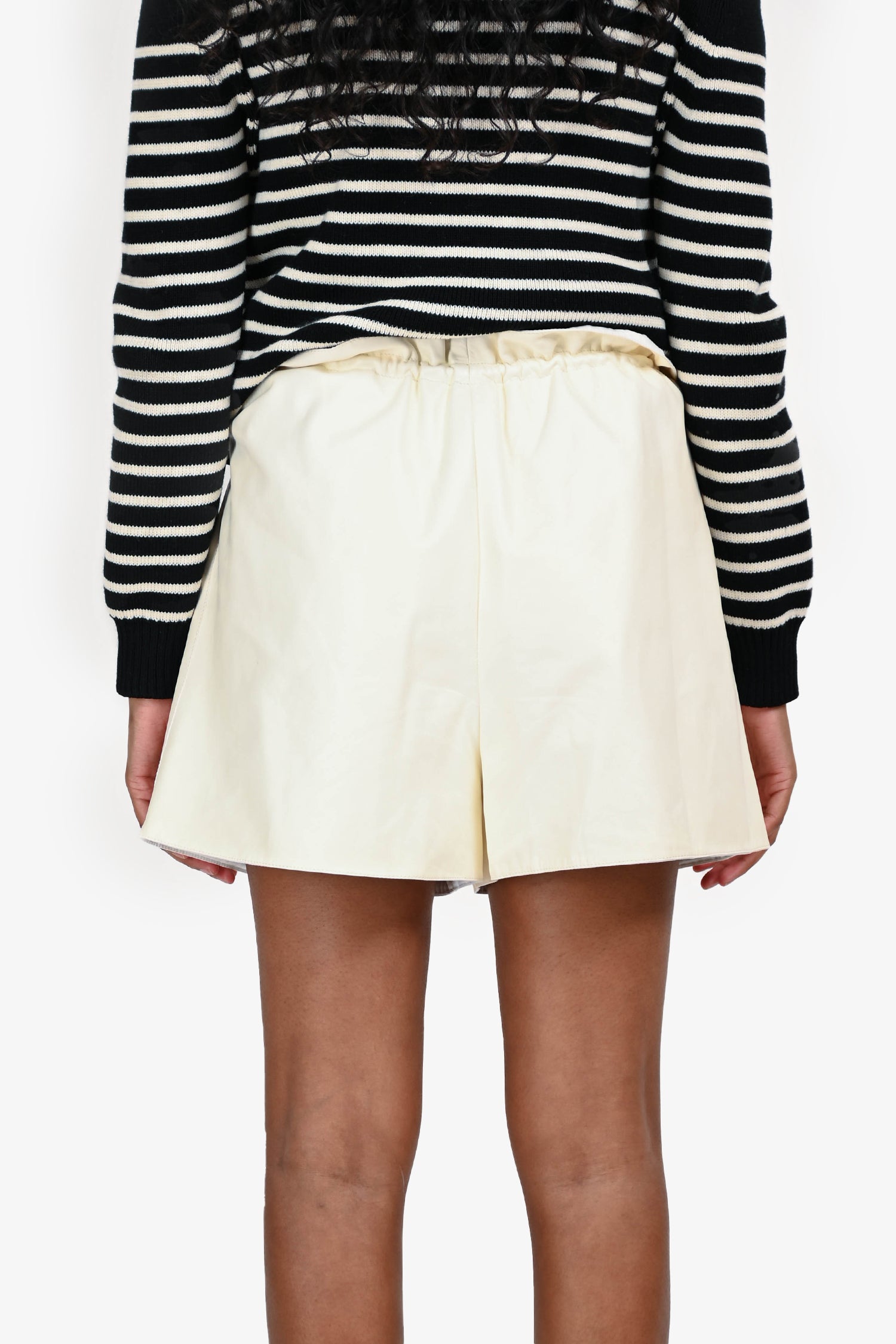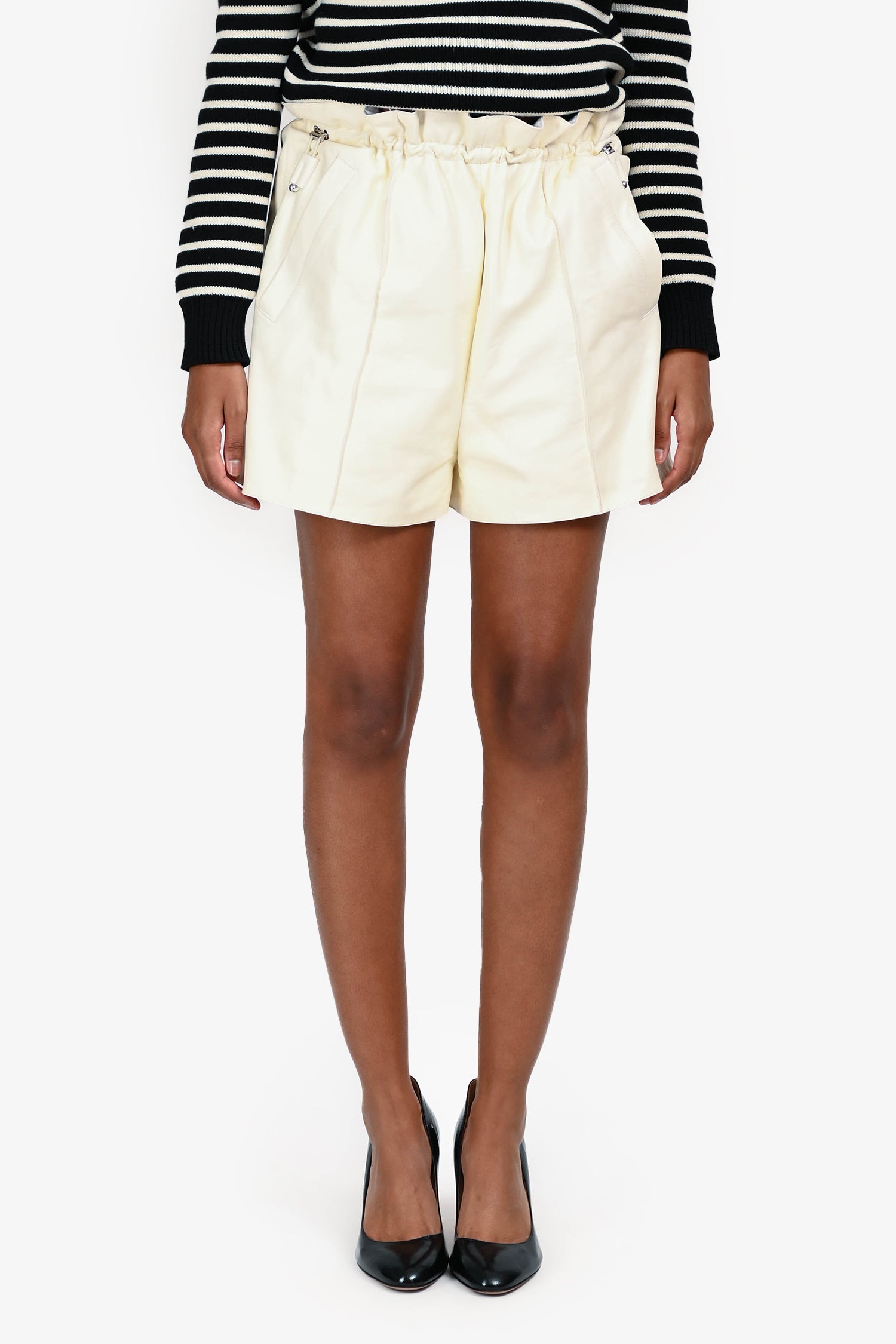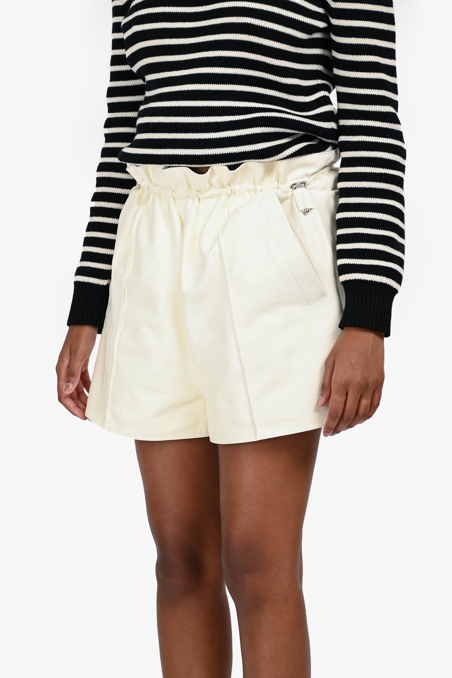 Refresh availabilityHermès White Leather Cinched Shorts. Pull-on. Two side slip pockets. Pull tabs design in the front. Lined. Tonal stitching.