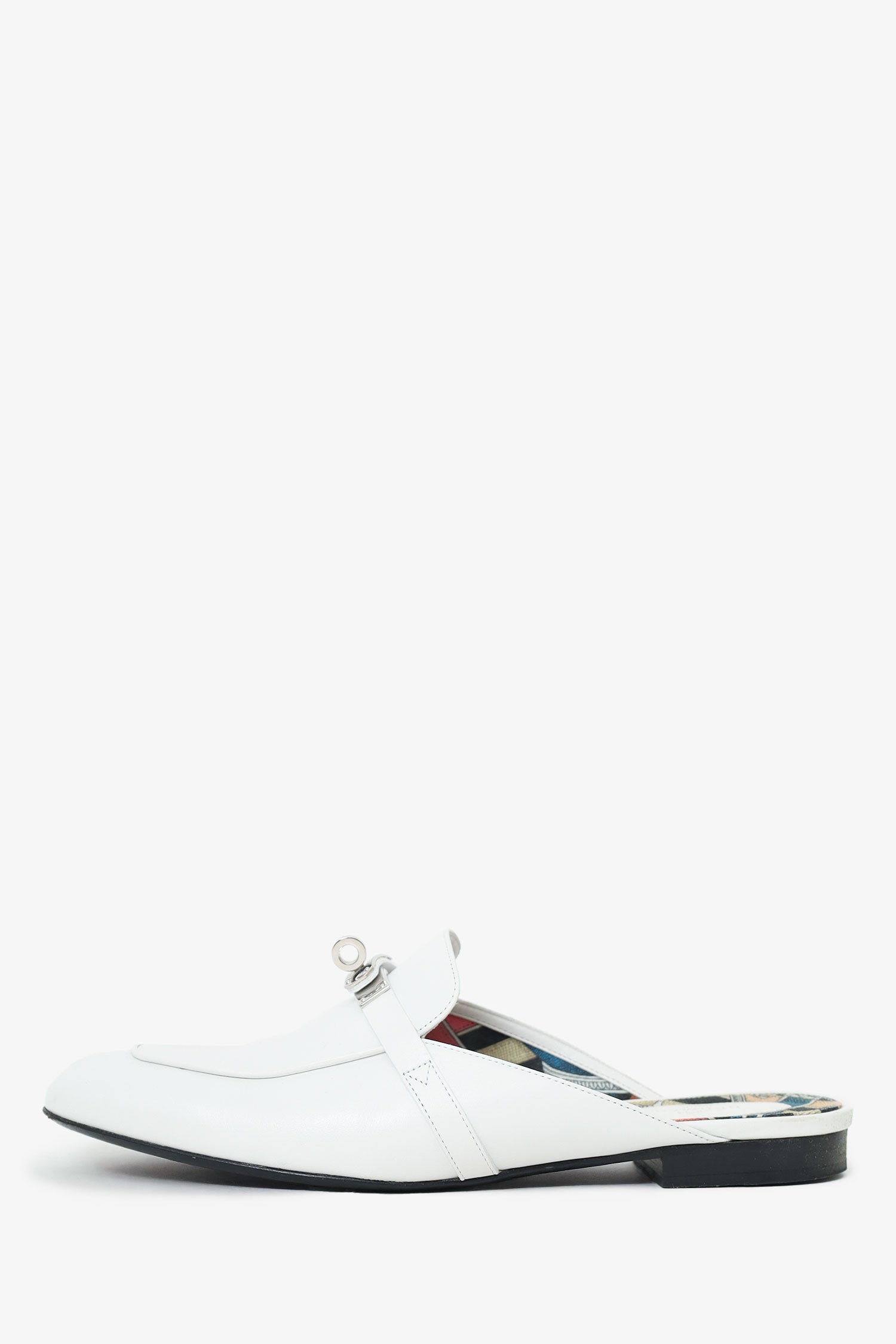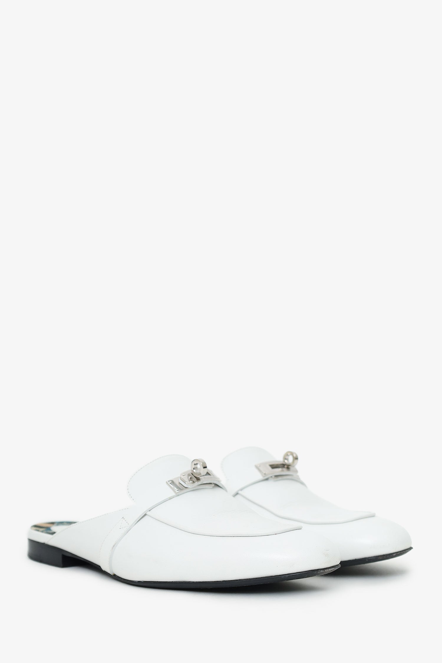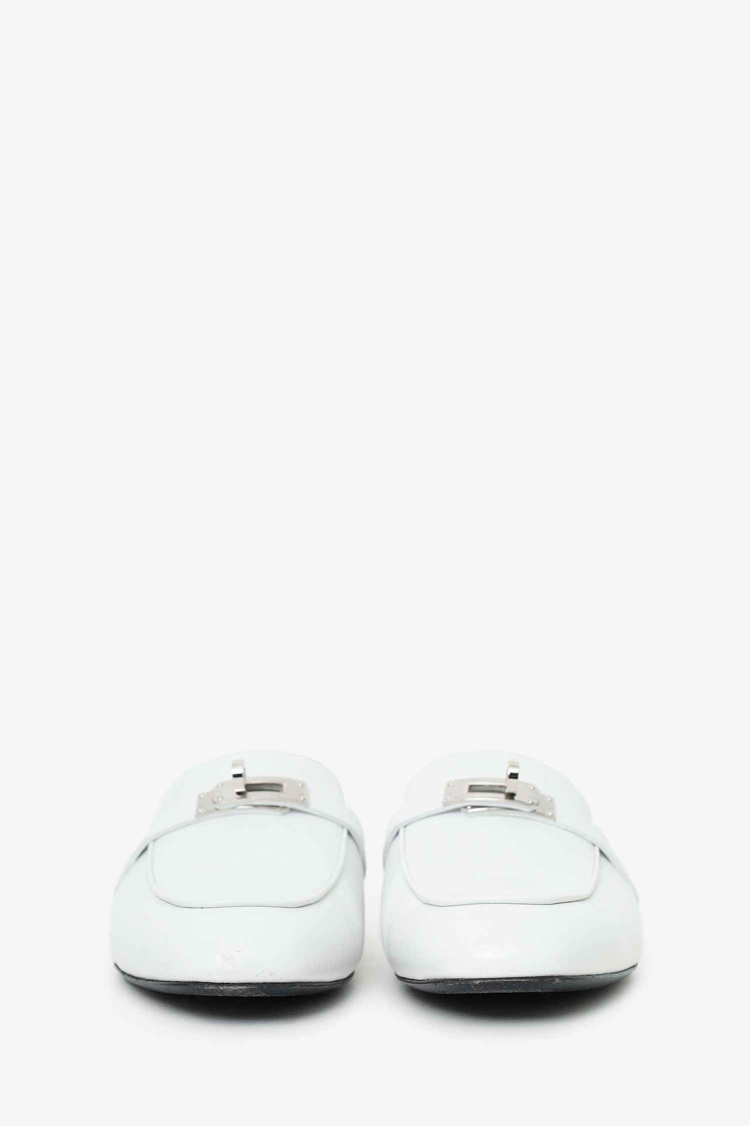 Refresh availabilityHermes White Leather 'Oz' Mules. Slip-on. Round toe. Silver-tone hardware. Tonal stitching.