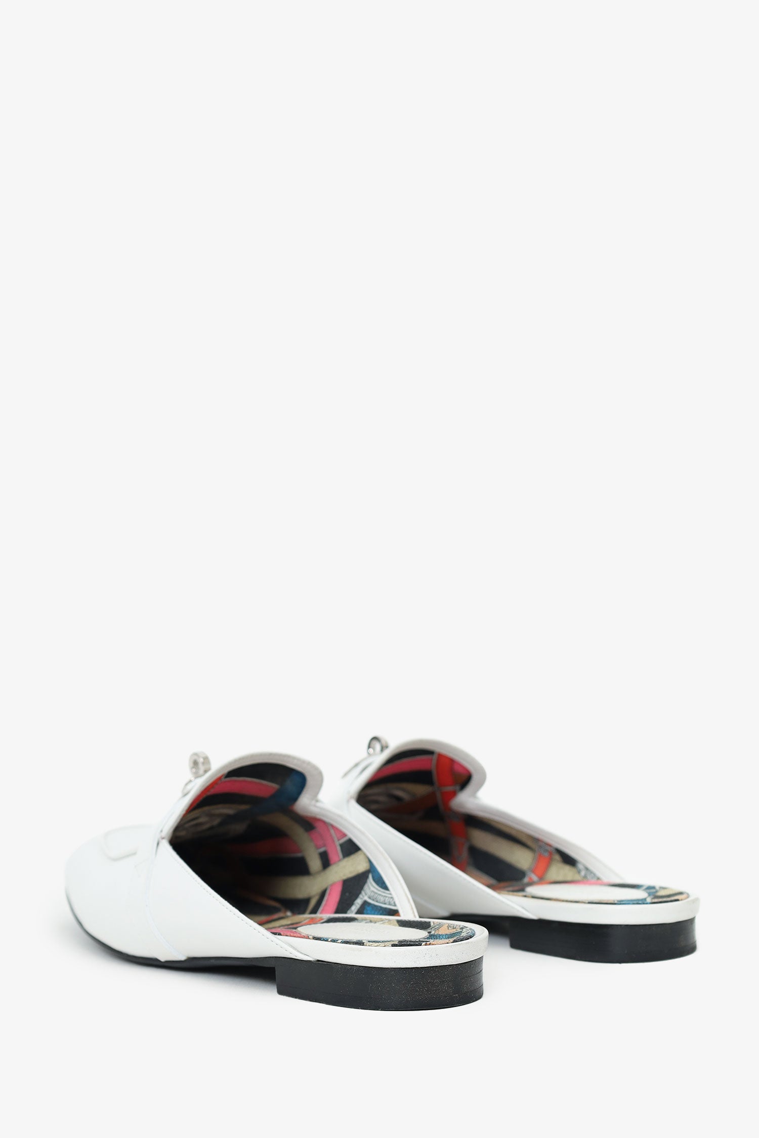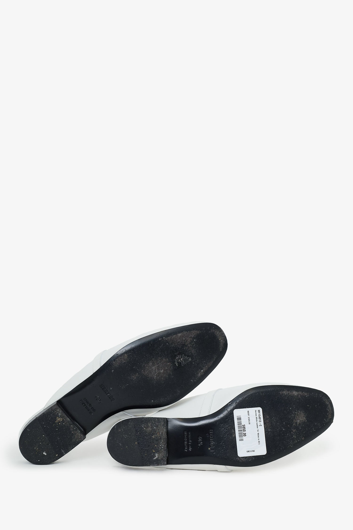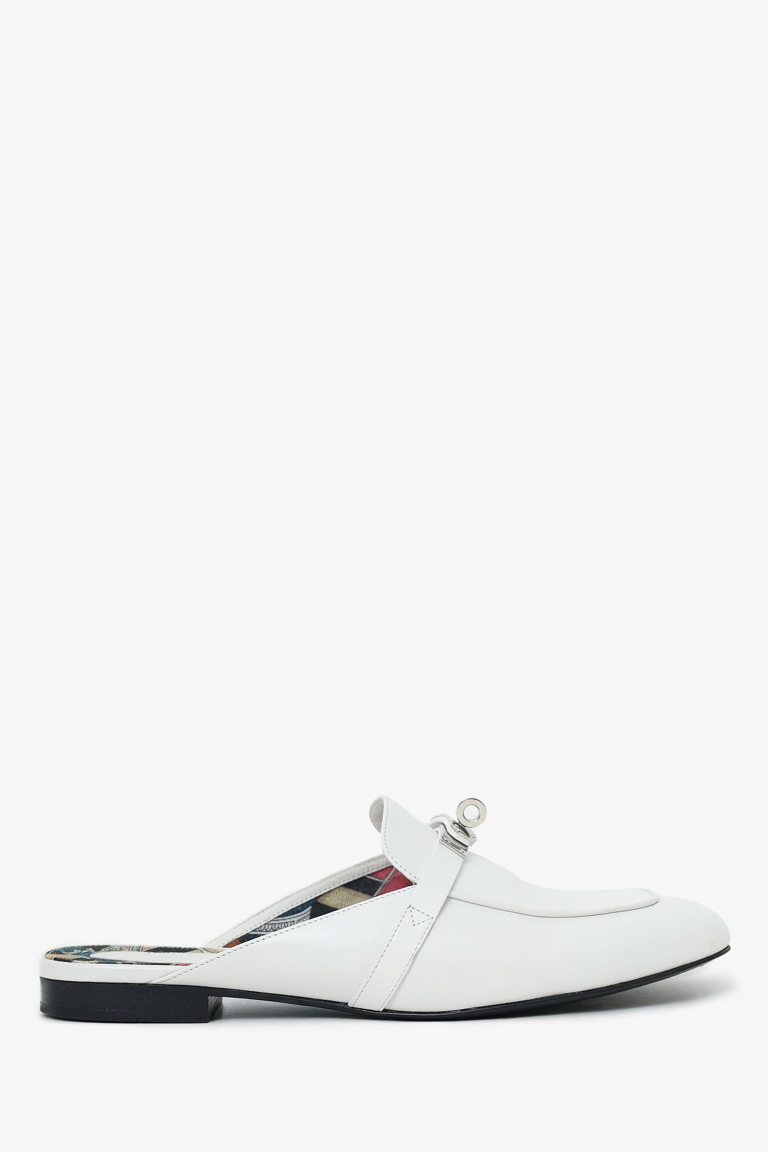 Refresh availabilityHermes White Leather 'Oz' Mules. Slip-on. Round toe. Silver-tone hardware. Tonal stitching.
