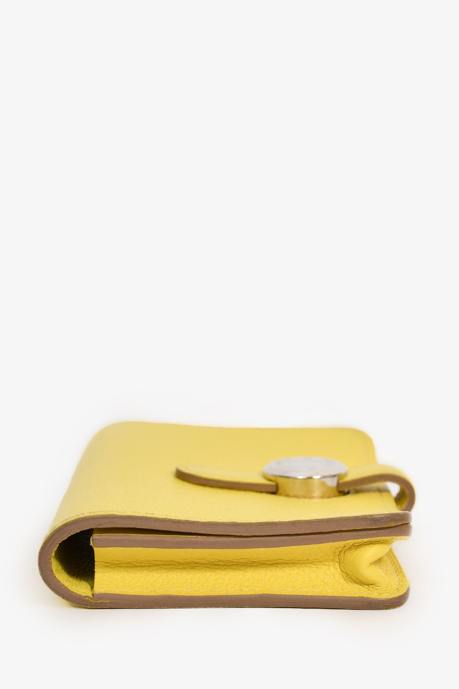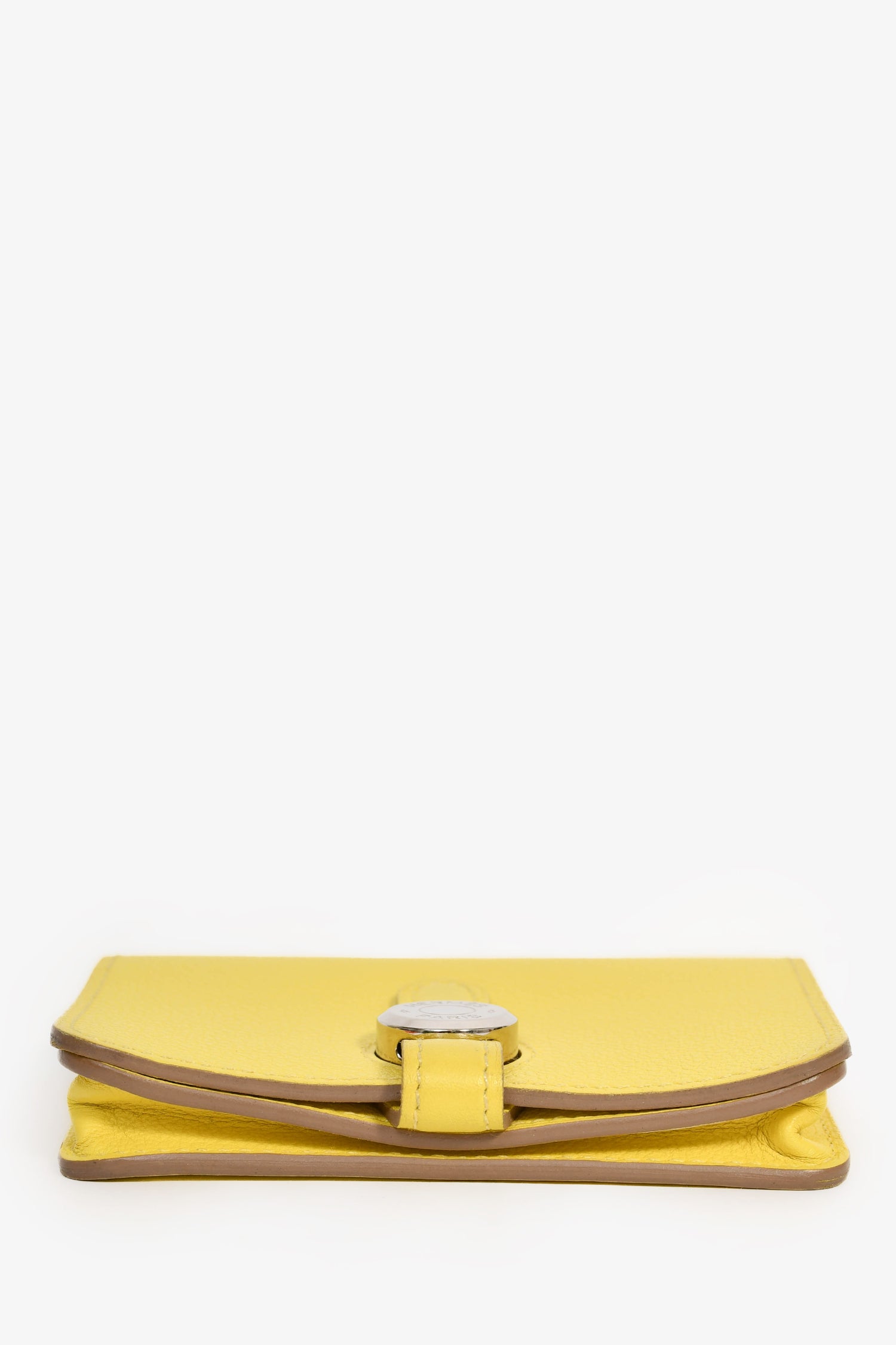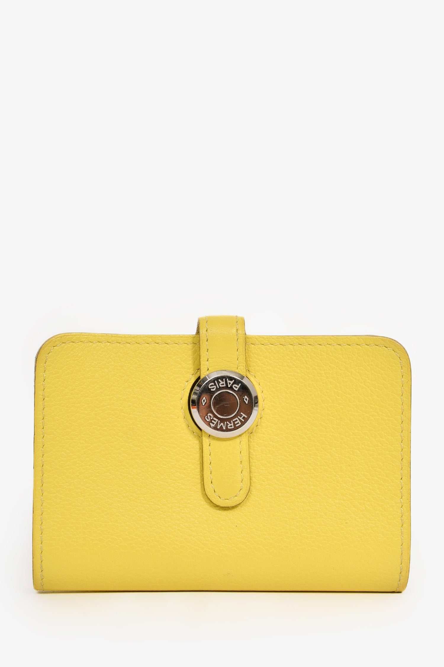 Refresh availabilityHermes Yellow Leather 'Dogon' Card Holder. Pull-through strap closure. 1 interior compartment and 1 card slot. Silver-tone hardware. Tonal stitching.