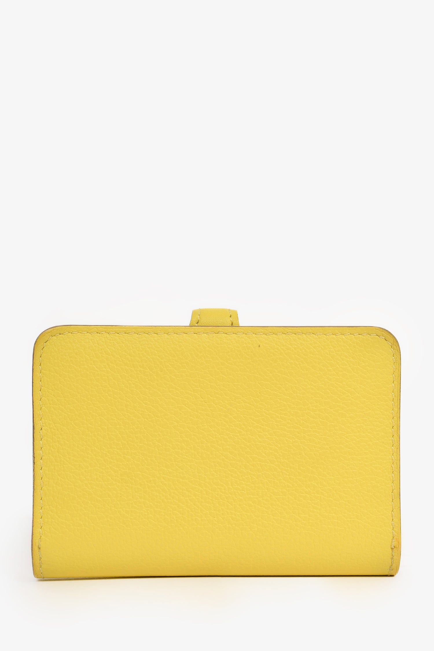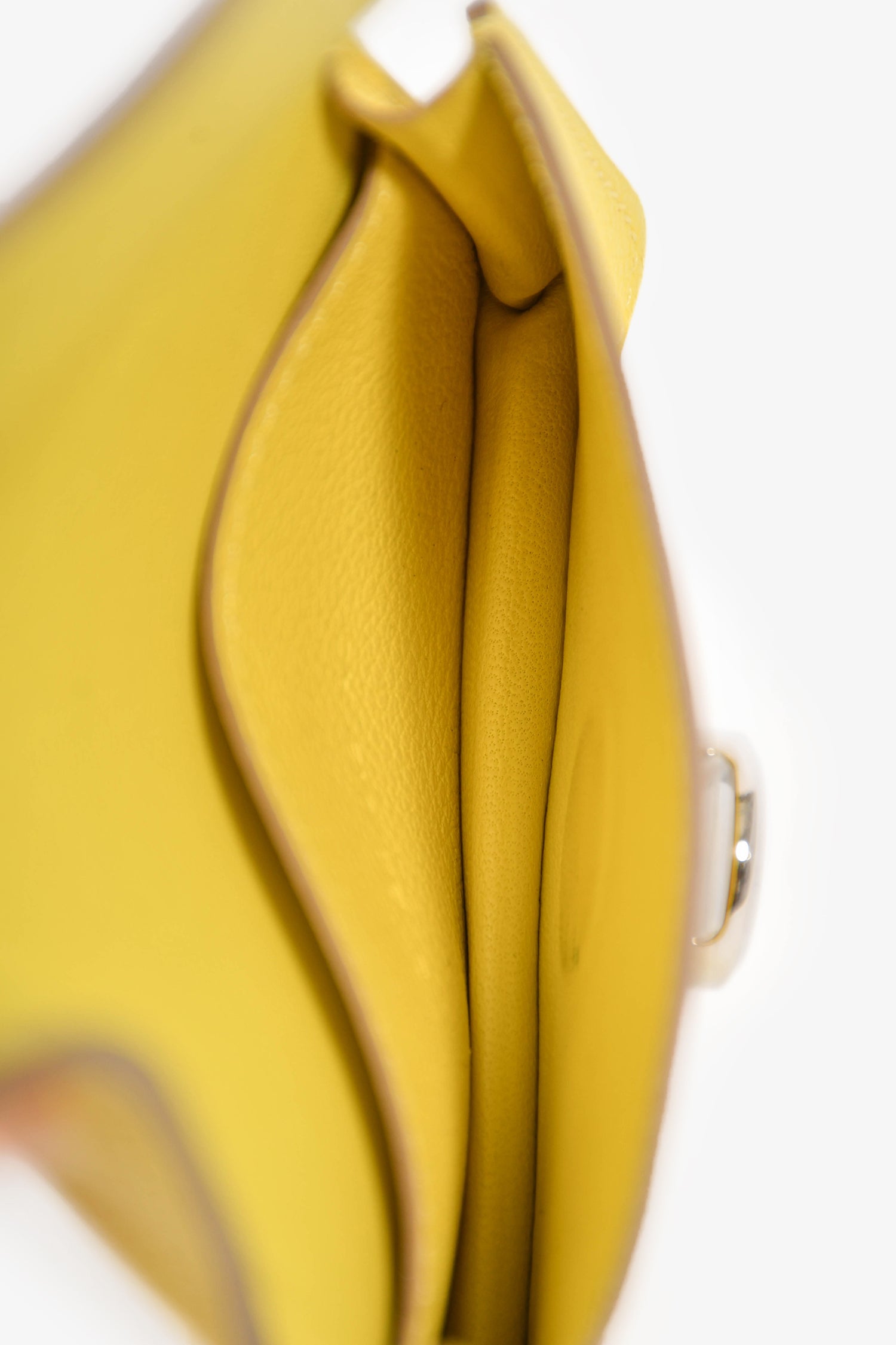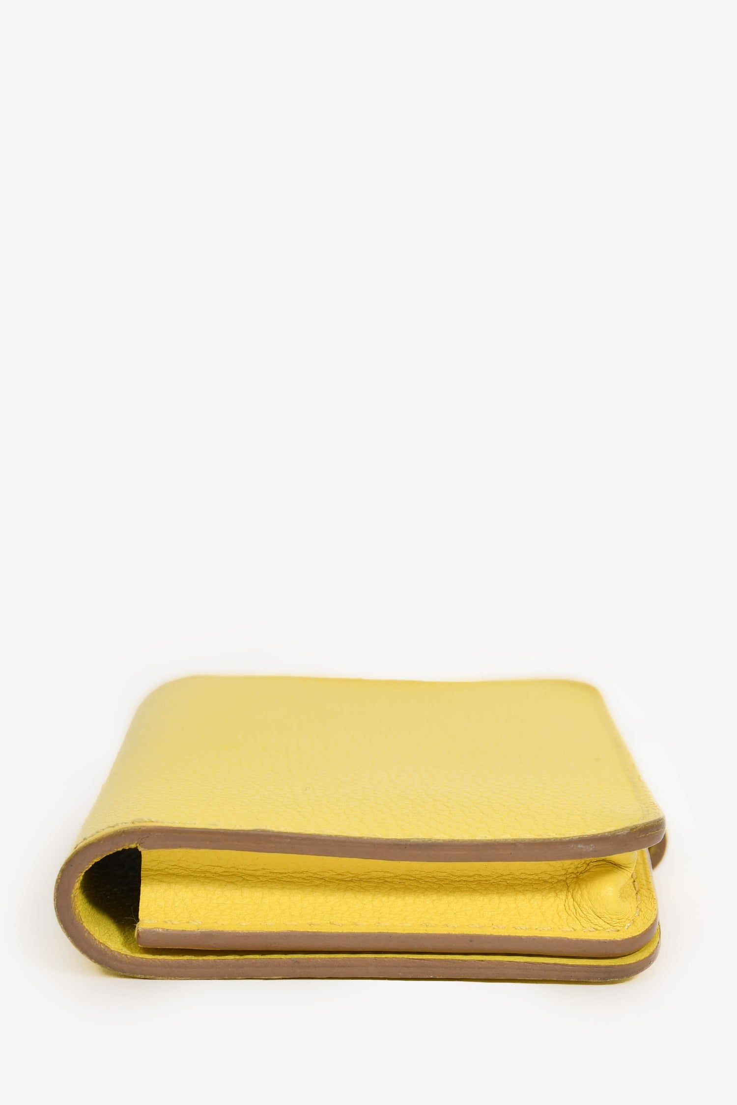 Refresh availabilityHermes Yellow Leather 'Dogon' Card Holder. Pull-through strap closure. 1 interior compartment and 1 card slot. Silver-tone hardware. Tonal stitching.
