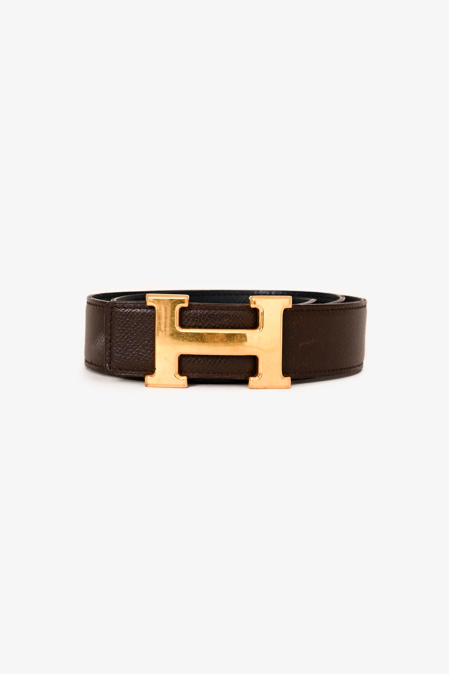 Refresh availabilityHermès Brown/Black Reversible Belt with Gold “H” Buckle. Gold-tone hardware. Tonal stitching.