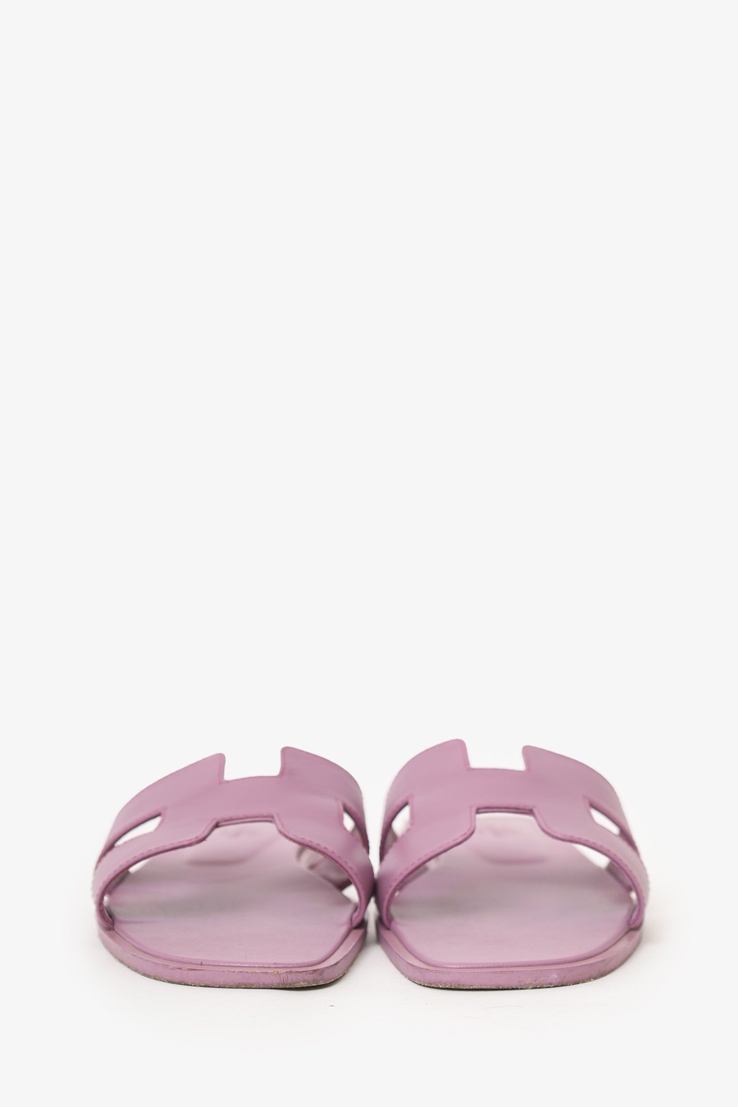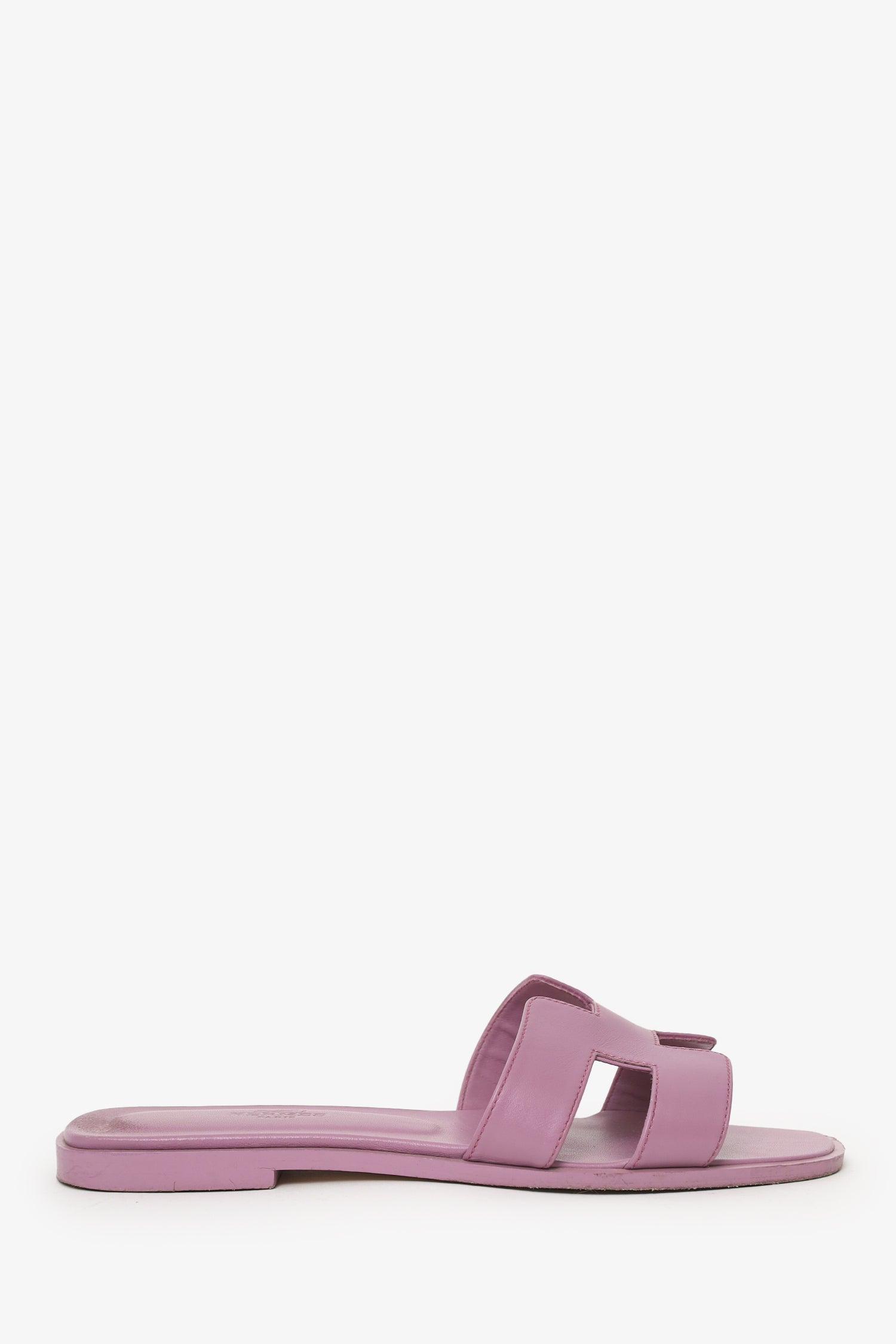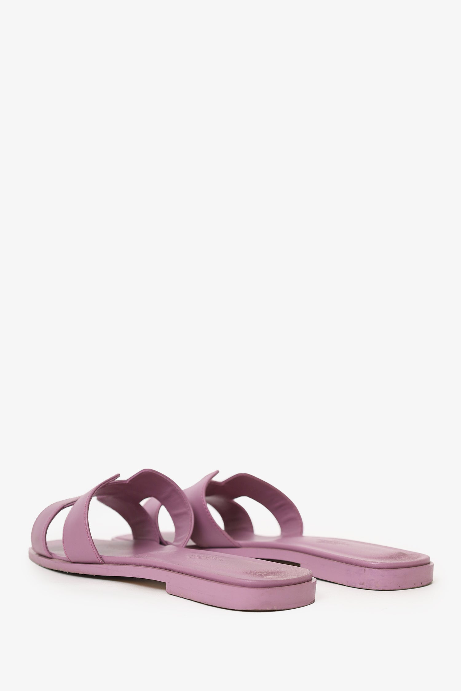 Refresh availabilityHermès Purple Leather Oran Sandals. Slip-on. Open toe. Signature “H” cut-out vamp. Leather lining and insole. Tonal stitching.