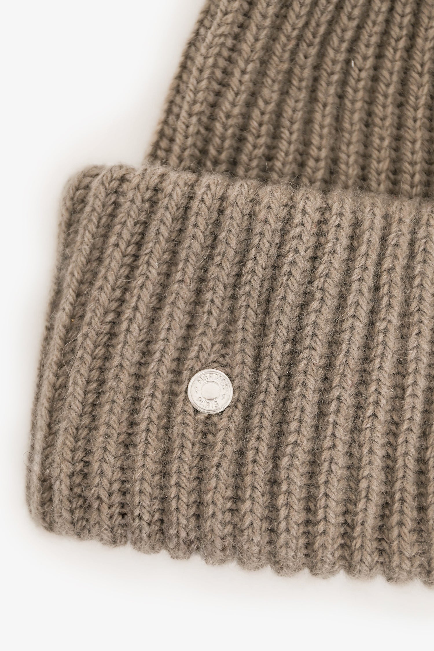 Refresh availabilityHermès Taupe Cashmere/Mohair Ribbed Toque. Pull-on. Fold-over brim. Silver-tone hardware. Tonal stitching.