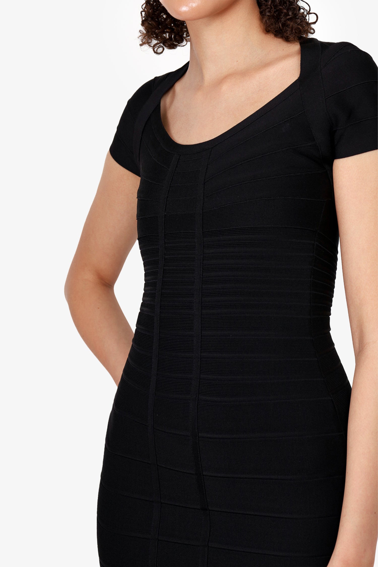 Refresh availabilityHerve Leger Black Bandage Bodycon Midi Dress. Unlined. Round neckline. Rear zip with double hook closure. Tonal stitching.