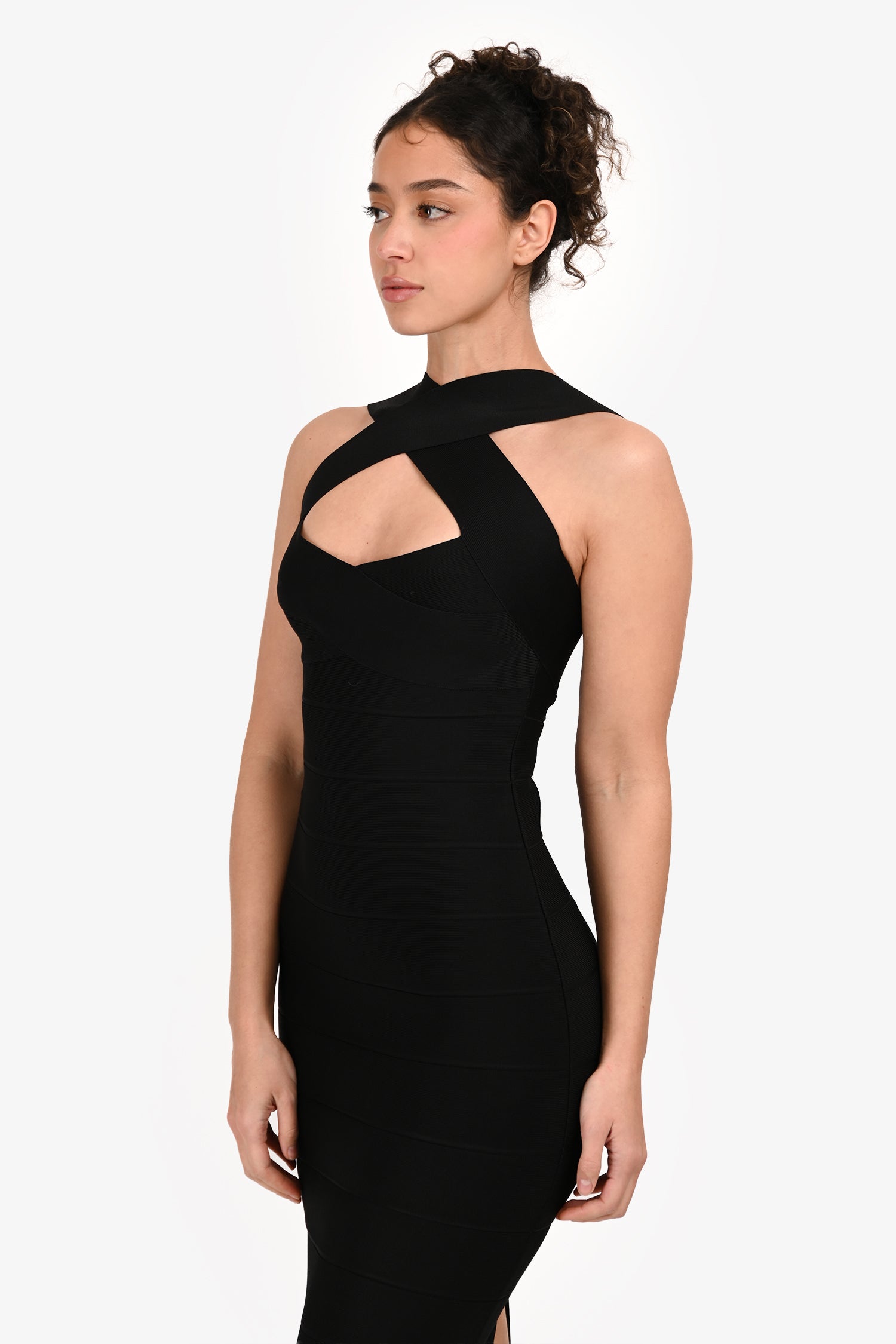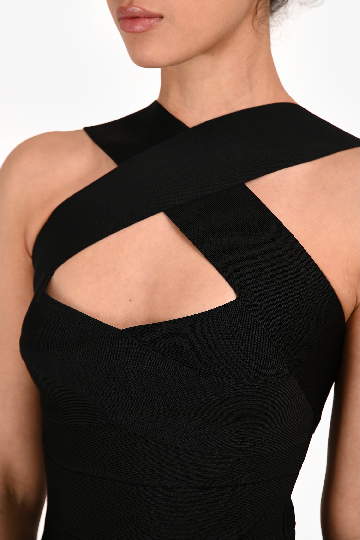 Refresh availabilityHerve Leger Black Cross Back Bandage Midi Dress. Pull-on. Criss-cross neckline. Rear zip and hook closure. Tonal stitching.