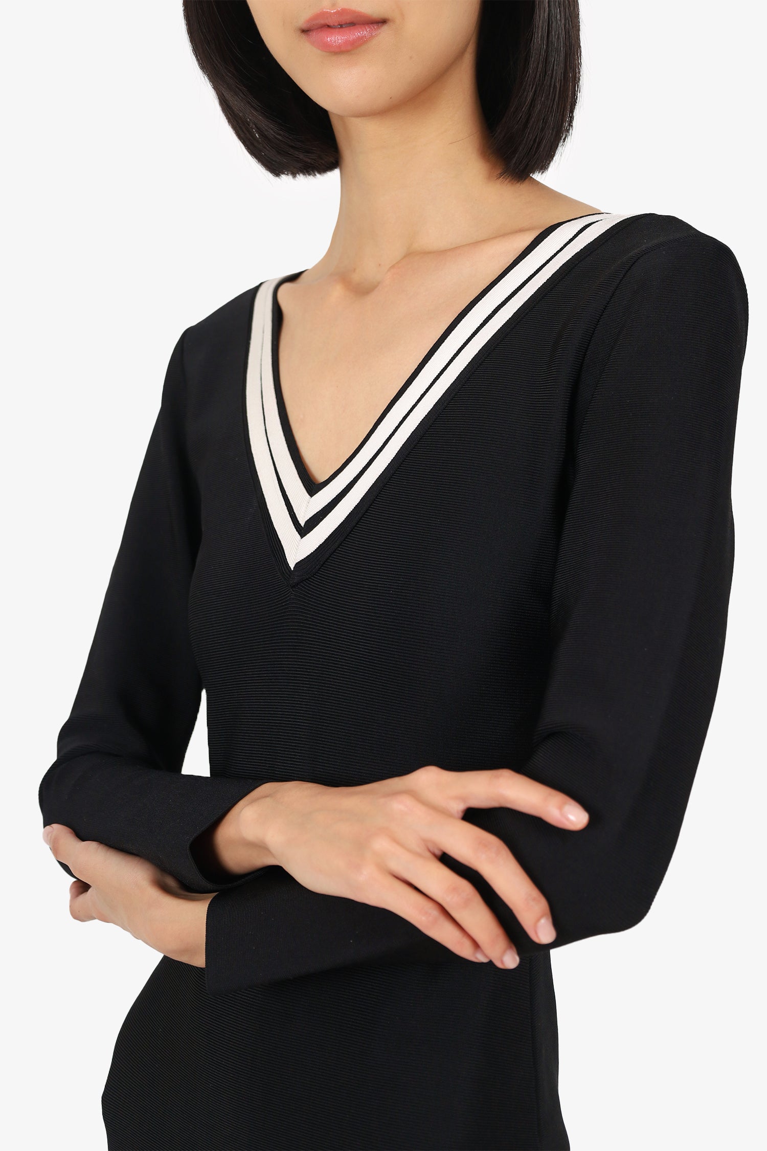 Herve Leger Black/White V-Neck Bodycon Midi Dress Size M